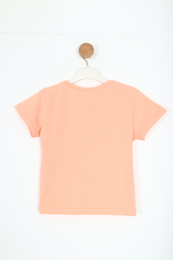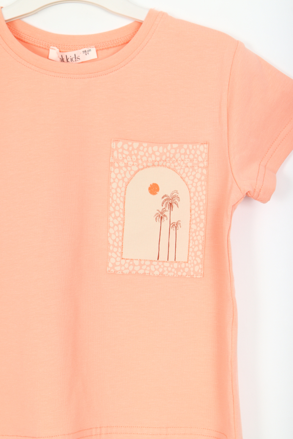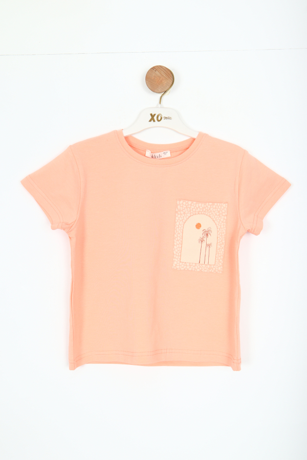 Bu kız çocuk tişörtü, yaz ayları için ideal, rahat ve şık bir seçenek sunar. Somon renginde olan tişört, kısa kollu ve bisiklet yaka tasarımıyla kullanım kolaylığı sağlar. Ön kısmındaki cepli detay, üzerinde küçük palmiye ağaçları ve güneş figürünün yer aldığı şık bir baskıya sahiptir. Minimal ve neşeli deseni, çocukların günlük giyiminde canlılık katar. Pamuklu kumaşı sayesinde nefes alabilir ve konforludur.