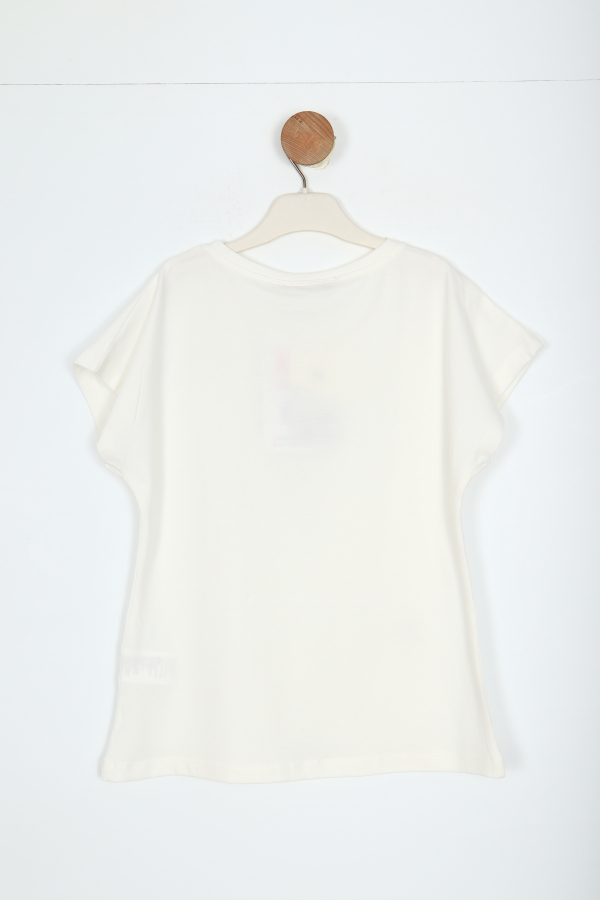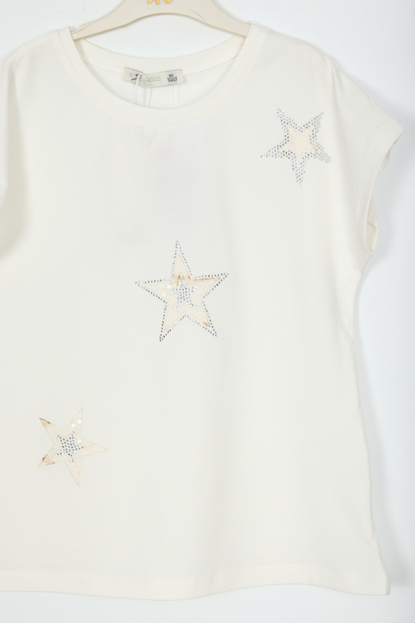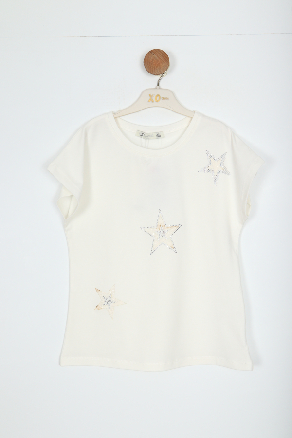 Bu kız çocuk tişörtü, sade ve şık beyaz rengiyle günlük kullanıma uygundur. Kısa kollu ve bisiklet yakalı tasarımı sayesinde rahat ve kullanışlıdır. Ön yüzünde farklı boyutlarda parlak taşlarla çevrelenmiş yıldız desenleri dikkat çekmektedir. Minimalist tarzı ve yumuşak dokusuyla çocukların konforunu ön planda tutar.