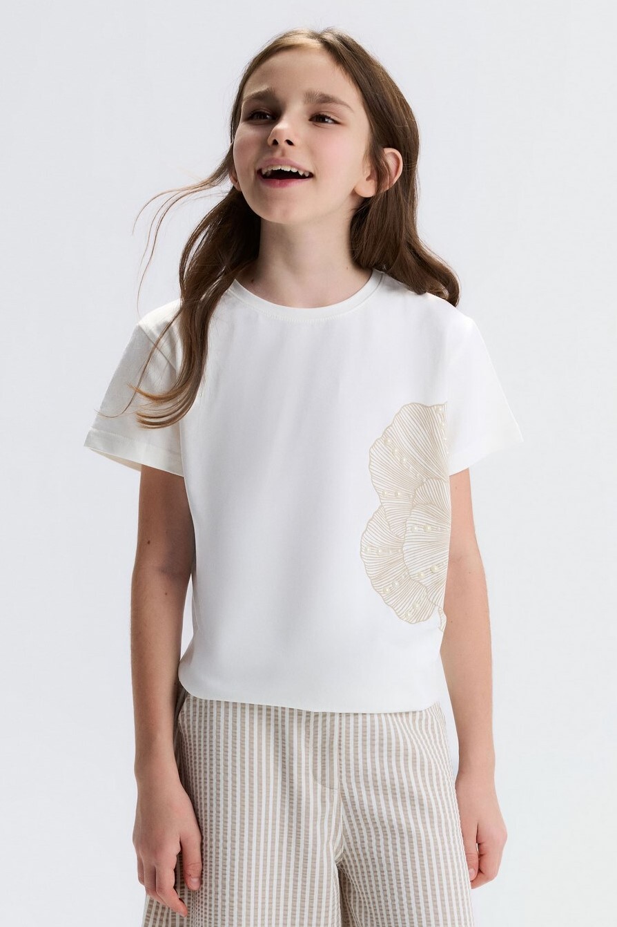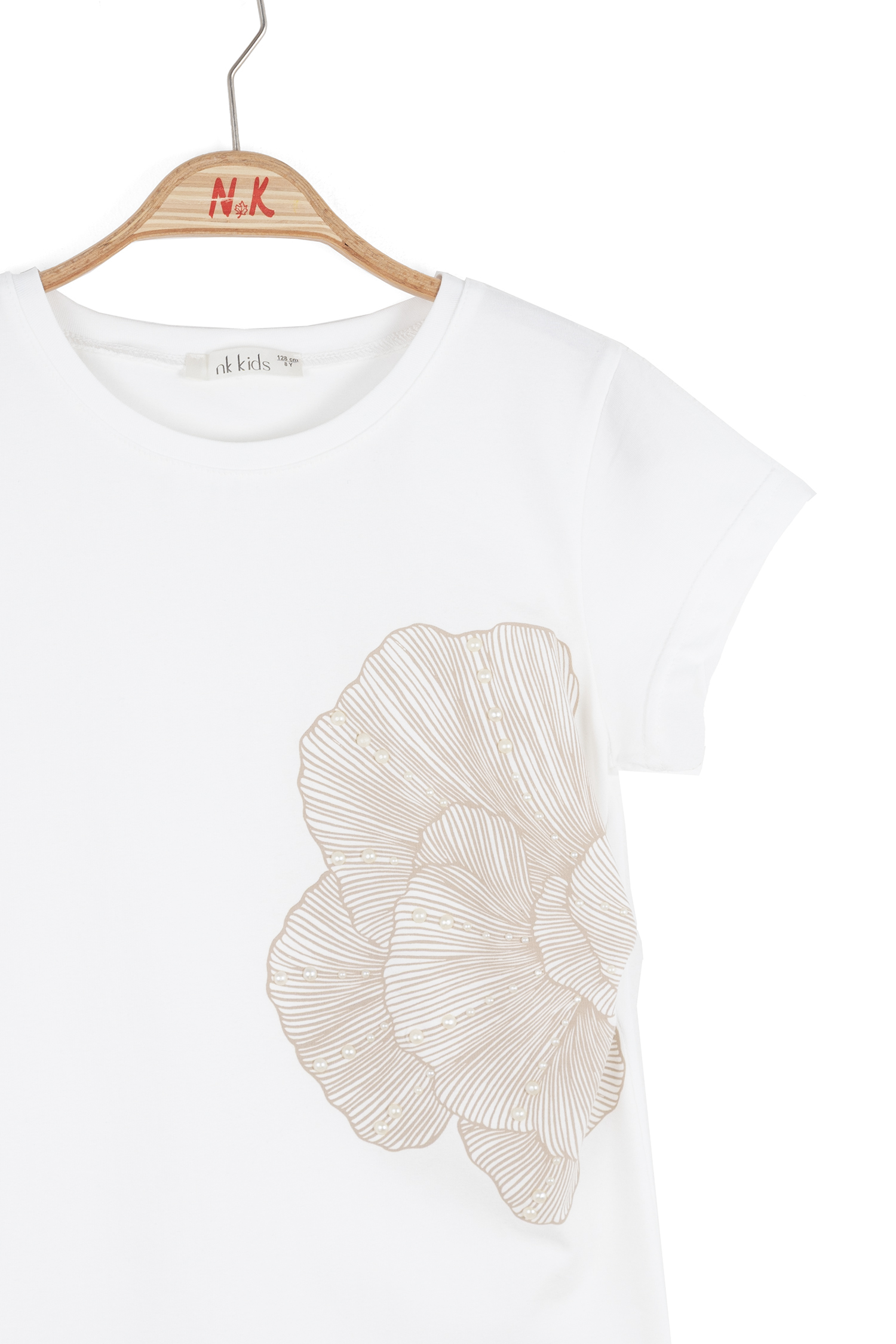 Bu kız çocuk tişörtü, bahar sezonu için ideal olan hafif ve rahat bir tasarıma sahiptir. Sıfır yaka ve kısa kollu yapısıyla hareket özgürlüğü sağlar, günlük kullanım için mükemmeldir. Yan tarafta yer alan büyük çiçek desenleri, ince çizgilerle detaylandırılmış ve incilerle süslenmiştir, bu da tişörte zarif ve şık bir hava katmaktadır. Beyaz zemin üzerine lacivert detaylar tişörtü sade ama dikkat çekici kılar.