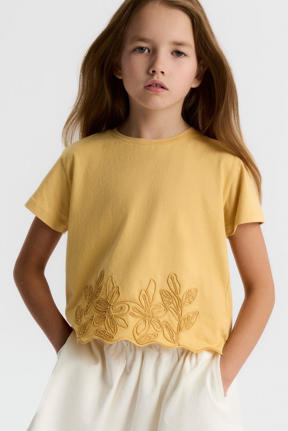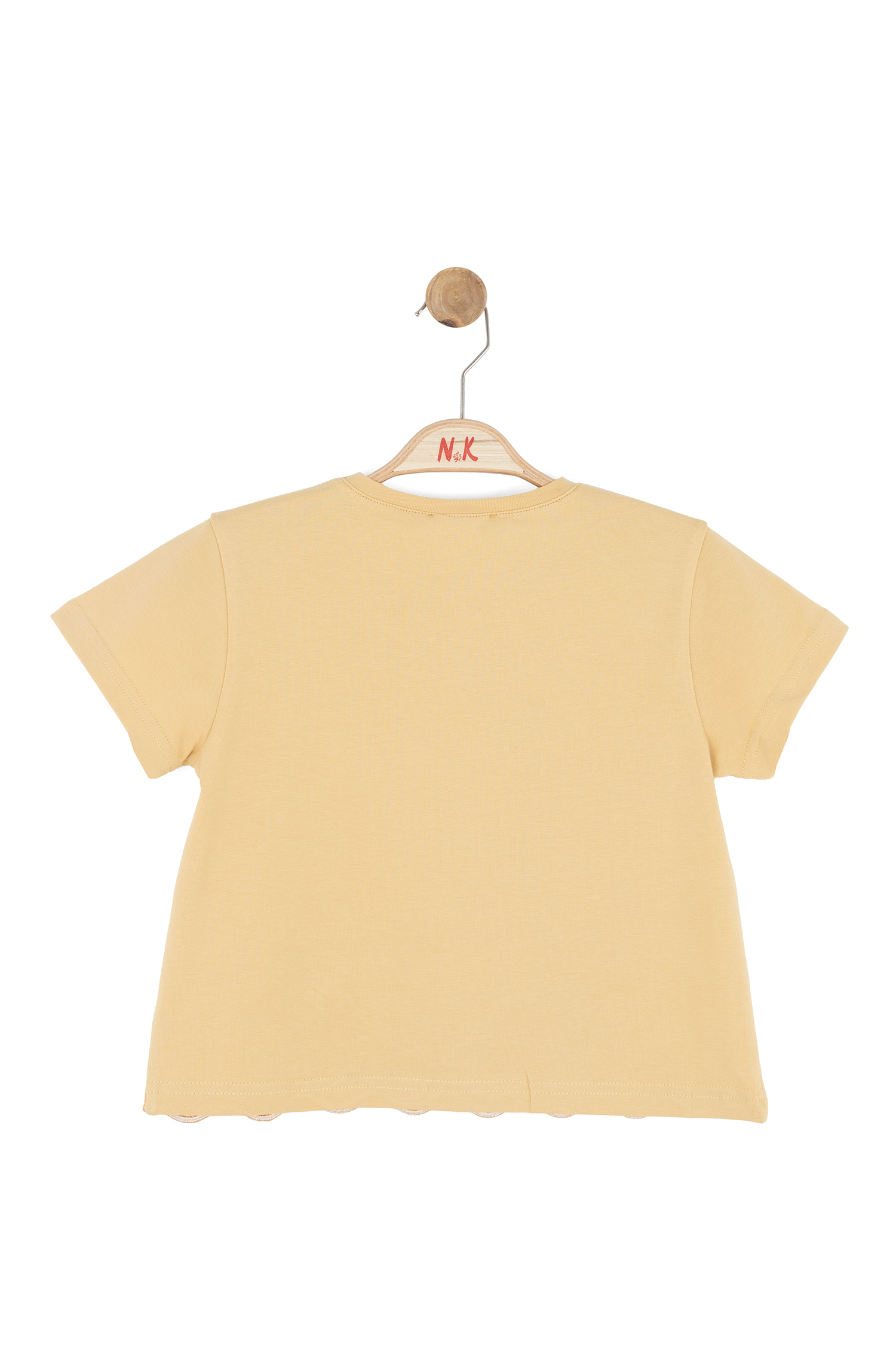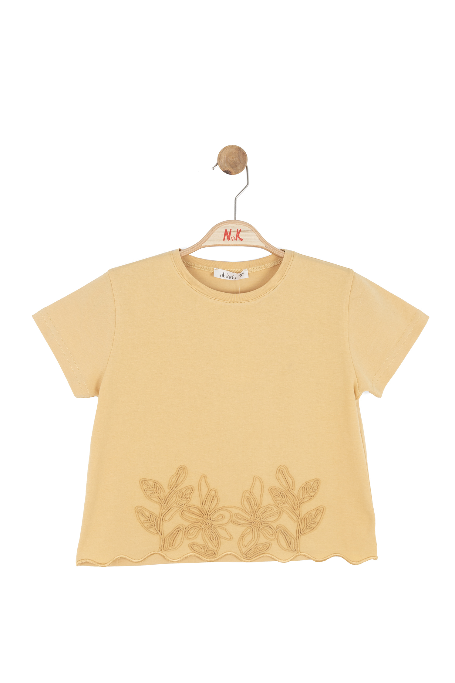 Bu kız çocuk tişörtü, bahar ayları için ideal, sade ve şık bir tasarıma sahiptir. Kapüşonsuz ve fermuarsız olan tişört, kısa kollu ve bisiklet yaka olarak tasarlanmıştır. Alt kısmında zarif bir şekilde işlenmiş çiçek desenleri ve dalga şeklinde bir etek ucu detayı bulunmaktadır. Rahat kesimi ve ekru rengi ile günlük kullanıma çok uygundur, konfor ve estetiği bir arada sunar.