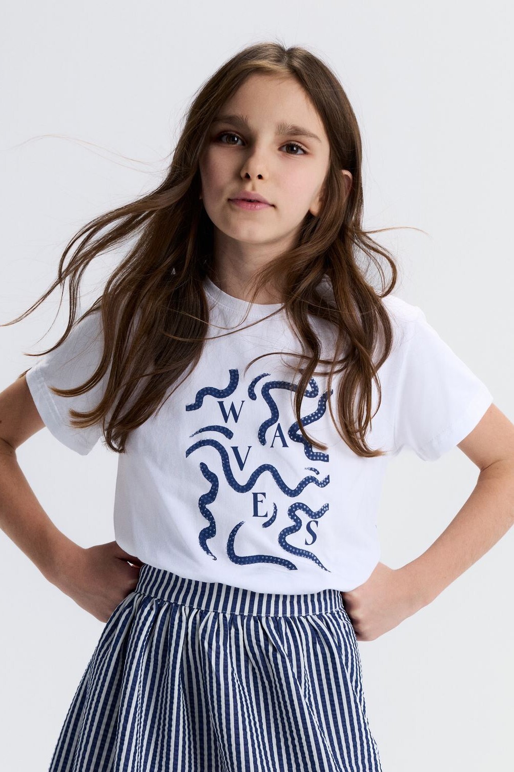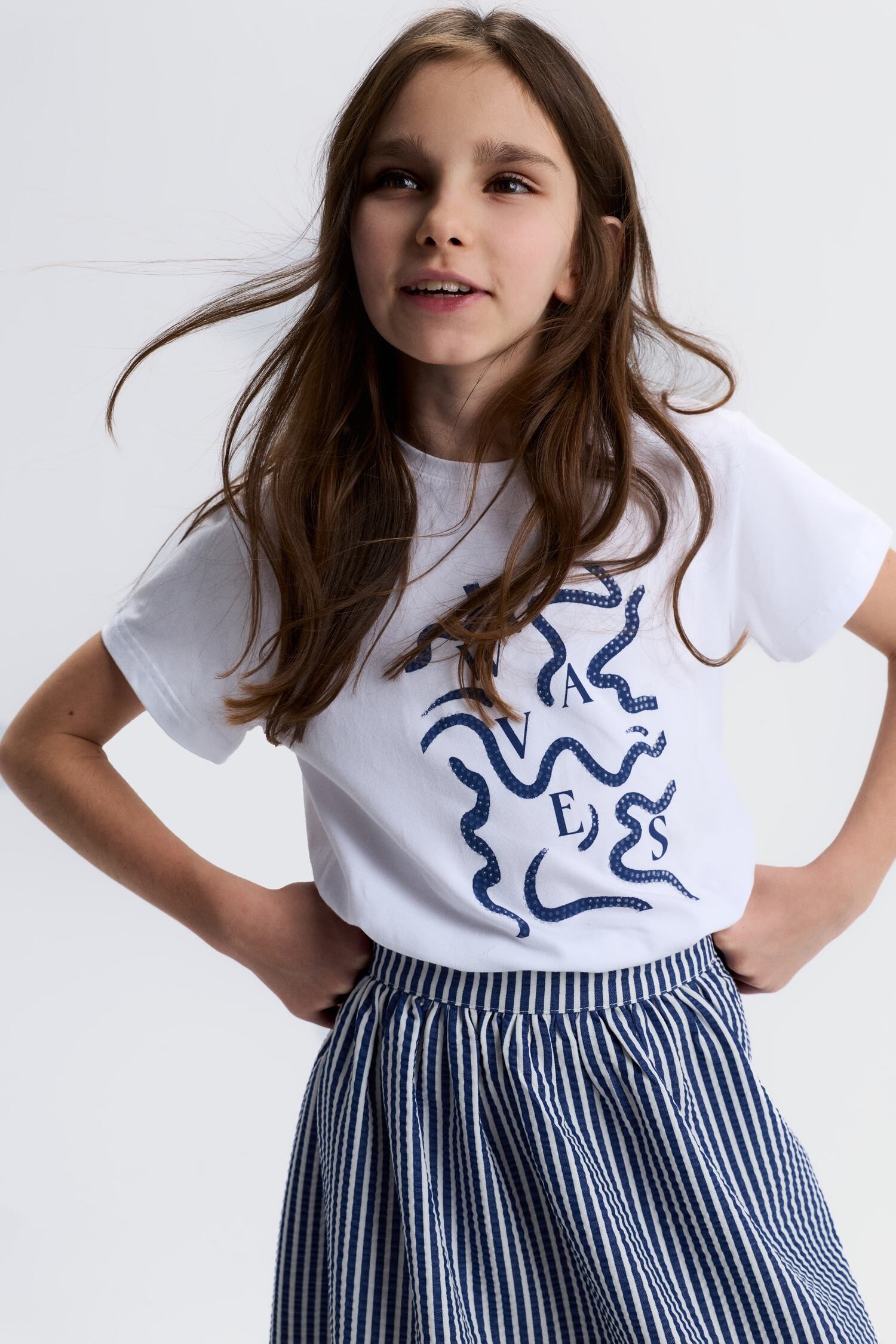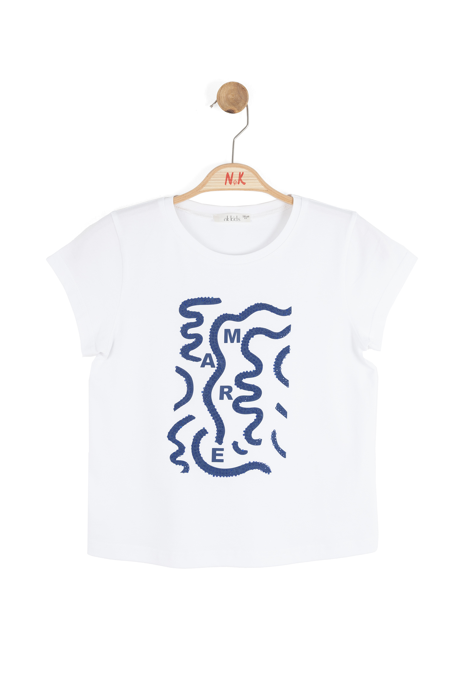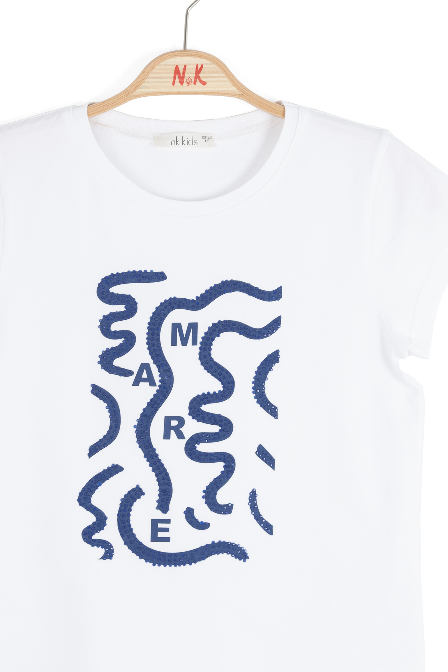 Bu kız çocuk tişörtü, bahar koleksiyonunun şıklığını ve rahatlığını bir araya getiriyor. Kısa kollu ve sıfır yaka tasarımıyla sıcak havalar için ideal. Ön kısmında, bej tonlarında zarif taş detaylarla süslenmiş "SWEAR" yazısı ve dalgalı çizgiler yer alıyor. Düz beyaz zemin üzerinde sade ama dikkat çekici bir görünüm sunuyor. Günlük kullanıma uygun, casual ve modern bir stil sunan bu tişört, 9-14 yaş arası çocuklar için tasarlandı.