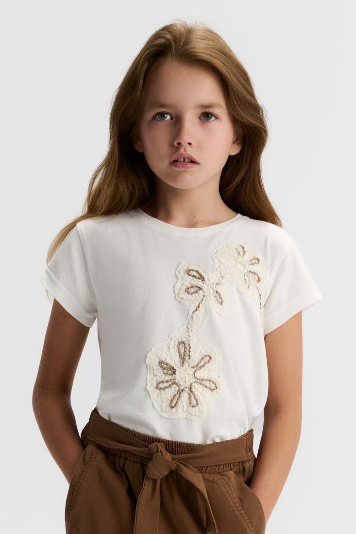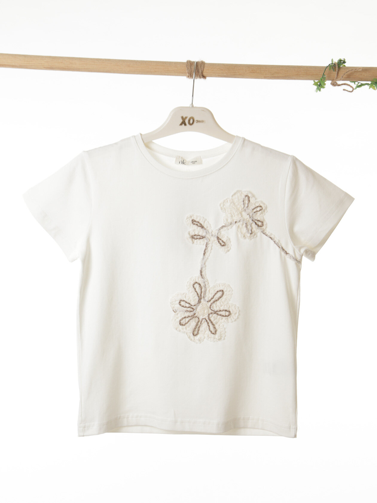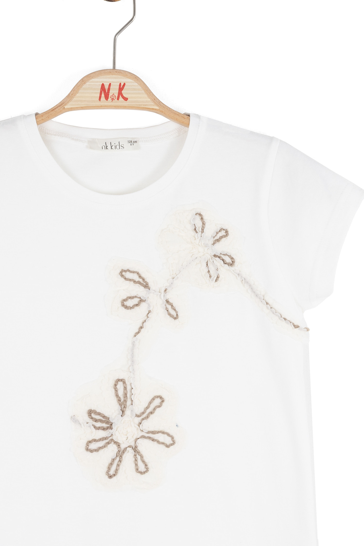 Bu kız çocuk tişörtü, bahar ayları için ideal hafif ve rahat bir seçimdir. Kısa kollu ve bisiklet yakalı model, sıcak havalarda ferah bir kullanım sunar. Ekru rengindeki tişörtün ön yüzünde zarif, kabartmalı çiçek aplikeleri bulunur. Bu detaylar tişörte şık ve sevimli bir hava katar. Kesimi sade ve günlük kullanıma uygun olup, farklı alt giyimlerle kolayca kombinlenebilir.