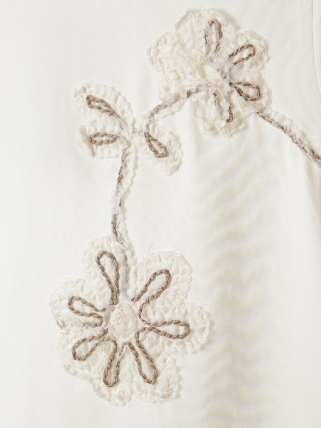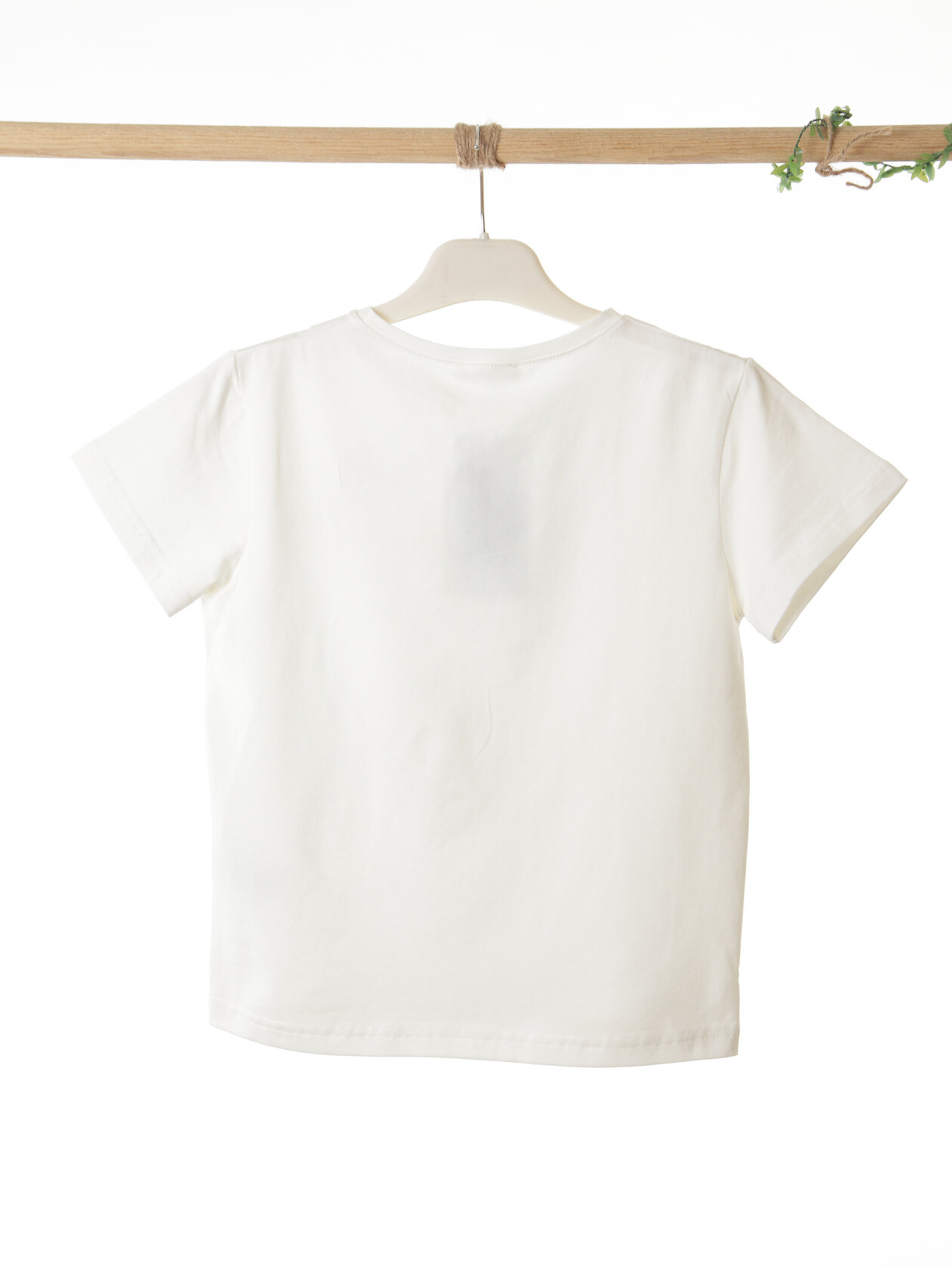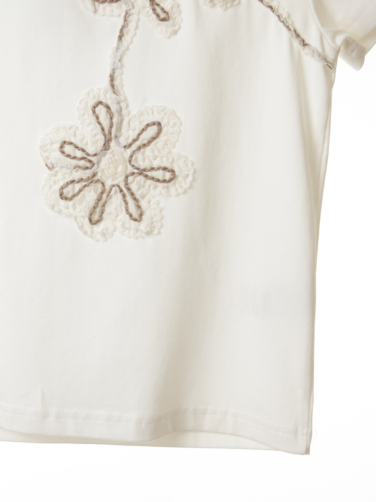 Bu kız çocuk tişörtü, bahar ayları için ideal hafif ve rahat bir seçimdir. Kısa kollu ve bisiklet yakalı model, sıcak havalarda ferah bir kullanım sunar. Ekru rengindeki tişörtün ön yüzünde zarif, kabartmalı çiçek aplikeleri bulunur. Bu detaylar tişörte şık ve sevimli bir hava katar. Kesimi sade ve günlük kullanıma uygun olup, farklı alt giyimlerle kolayca kombinlenebilir.