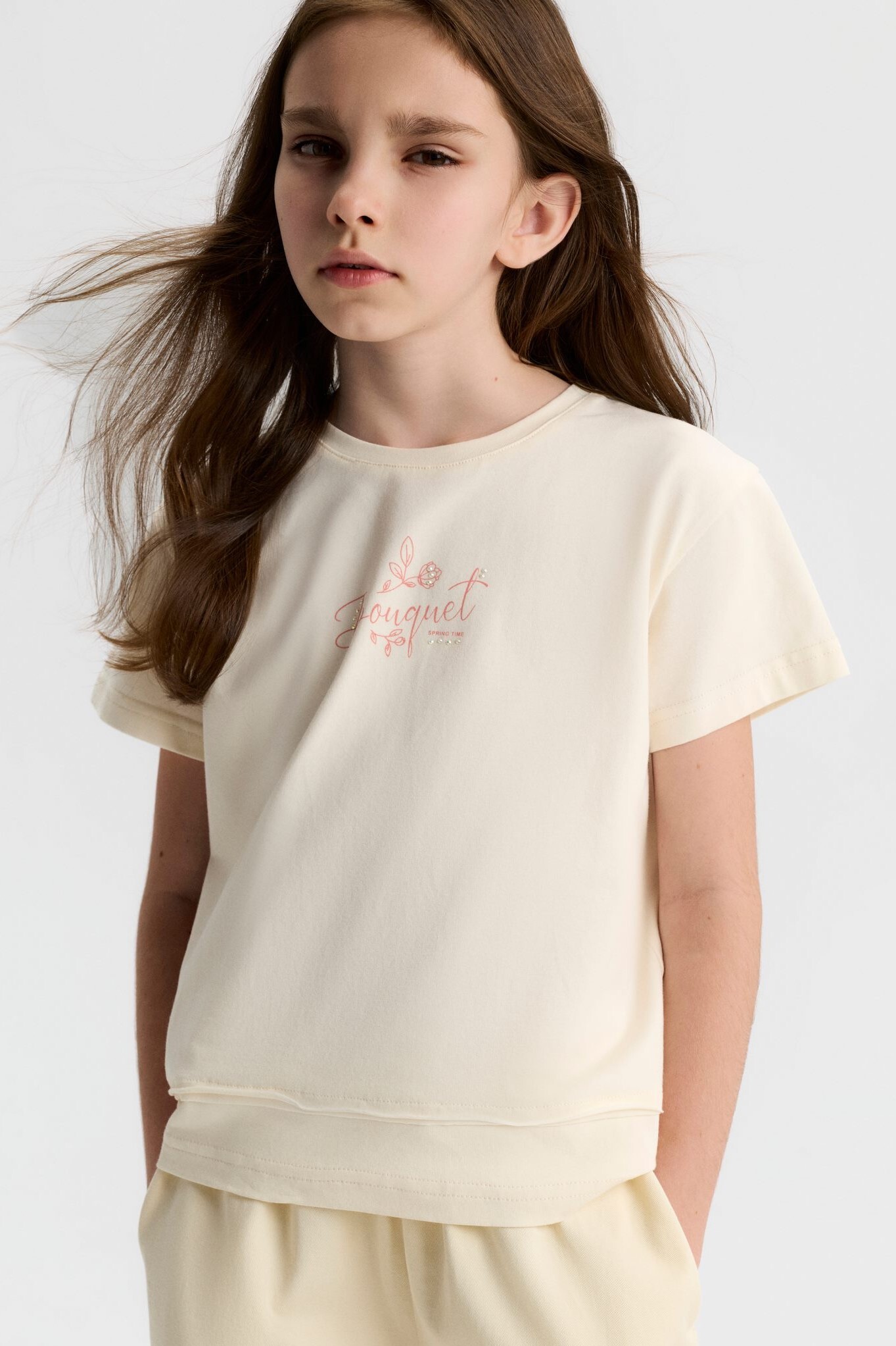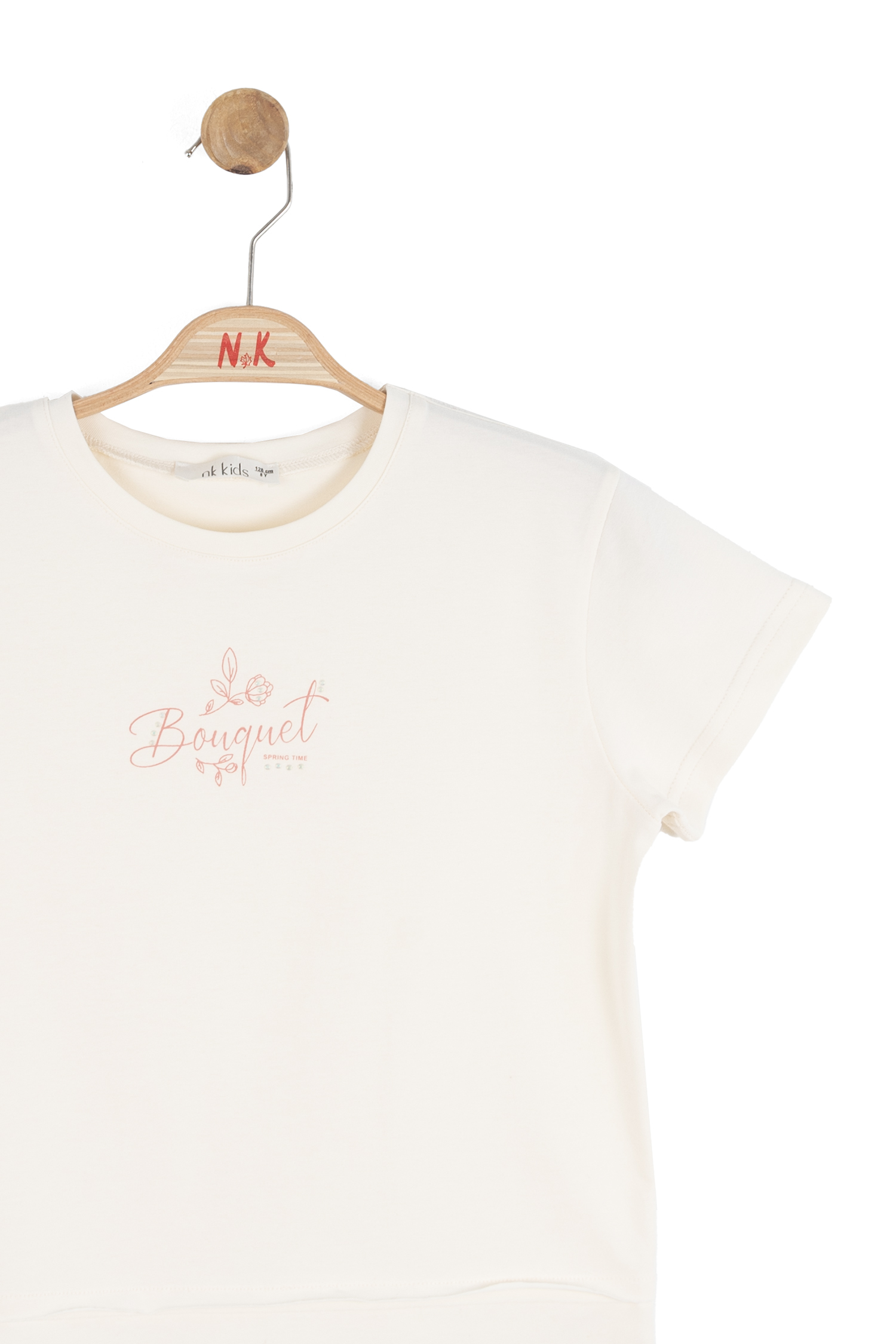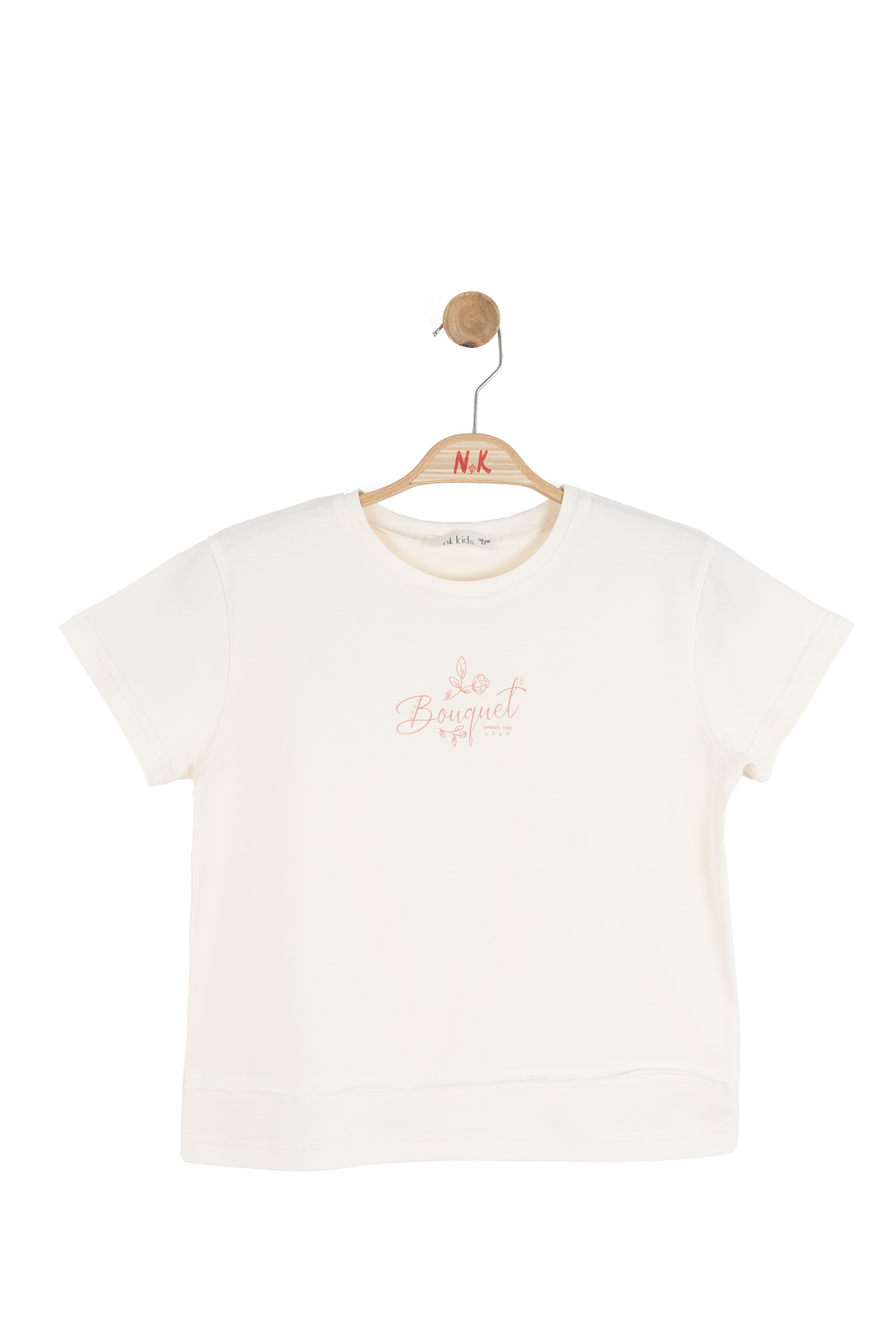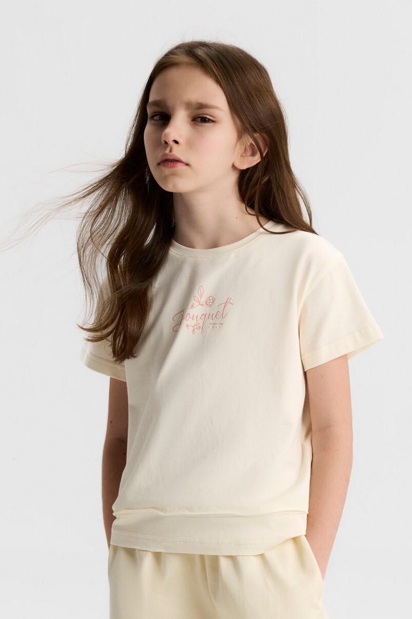 Bu krem rengi kız çocuk tişörtü, bahar sezonu için ideal bir tercih. Sıfır yaka tasarımı, kısa kollu yapısı ve rahat kesimi ile günlük kullanıma uygundur. Ön kısmında zarif pembe tonlarında "Bouquet" yazısı ve küçük çiçek desenleri bulunur, tişörtü sade ama şık kılar. Alt kısmındaki çift katman görünümü tişörte modern bir dokunuş sağlar. Kapüşon, fermuar veya cepler gibi ekstra detaylar bulunmaz, bu sayede sade ve rahat bir stil sunar.