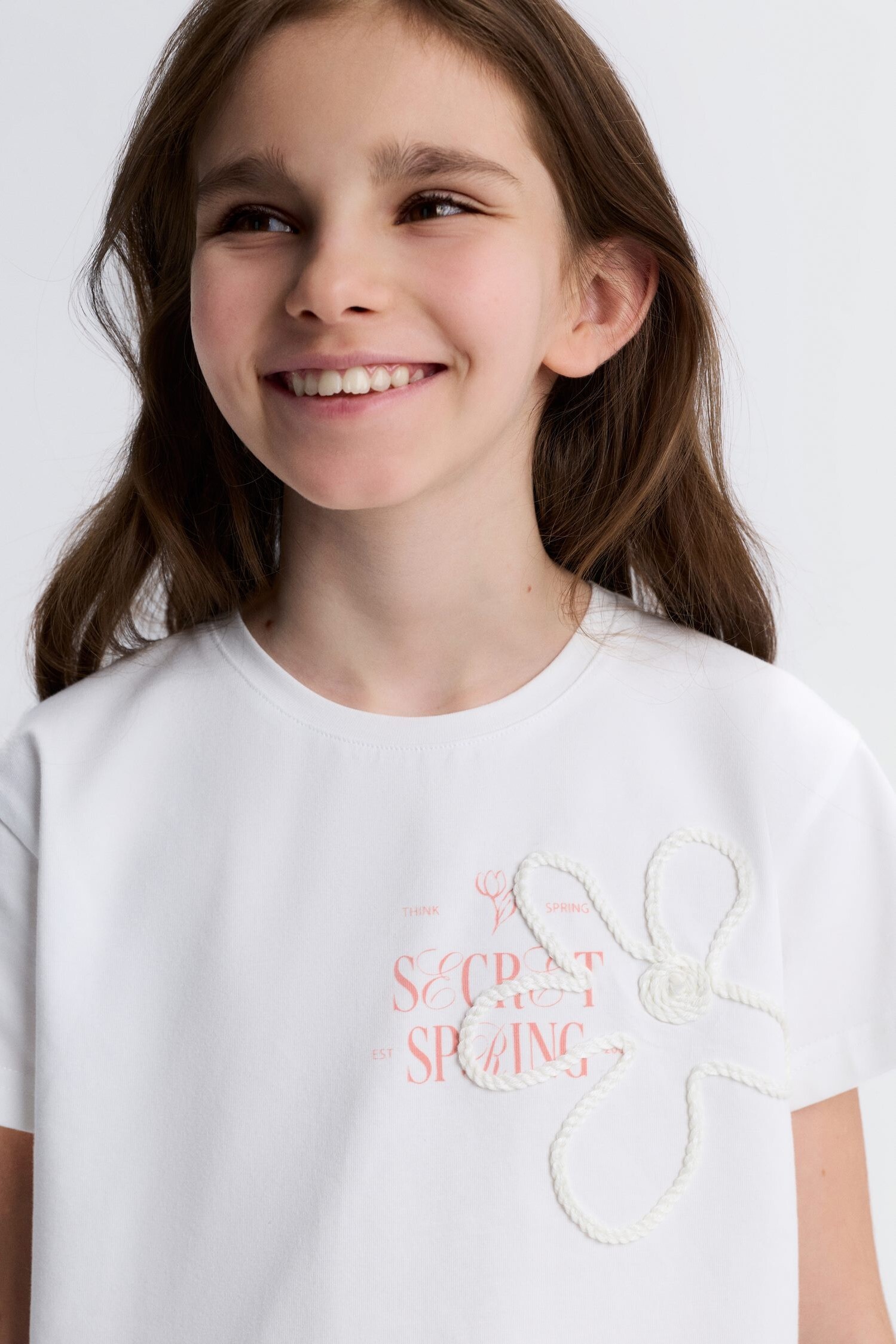 Bu kız çocuk tişörtü, bahar sezonu için ideal olan hafif ve rahat bir tasarıma sahiptir. Kısa kollu ve bisiklet yaka modeliyle sıcak havalarda konfor sunar. Ekru rengindeki tişörtün ön kısmında, ip gibi kalın bir kumaşla oluşturulmuş büyük, şık bir çiçek deseni ve pembe renkte "Secret Spring" yazısı yer alır. Minimalist ama sevimli detaylarıyla günlük kullanım için mükemmeldir.