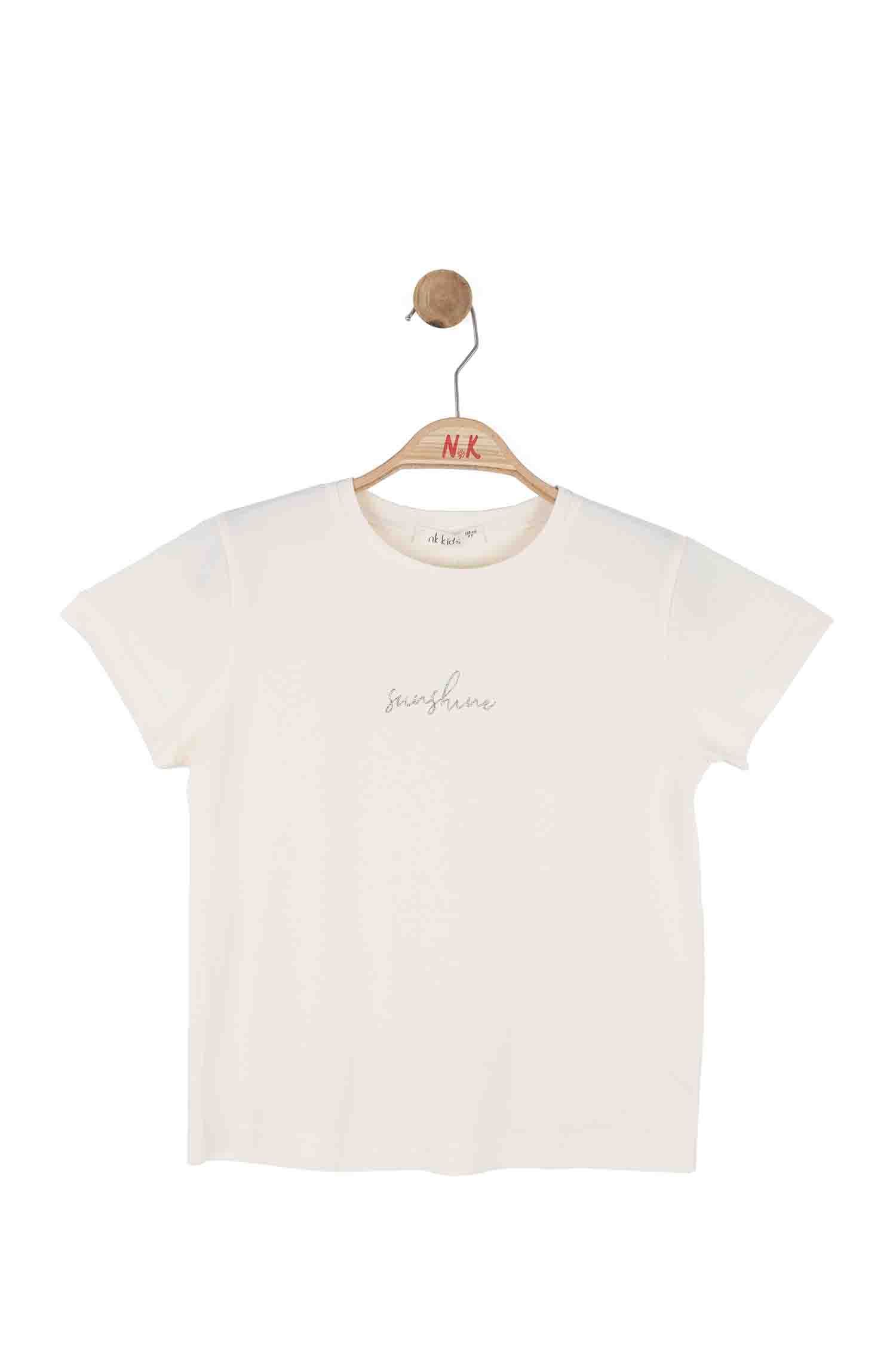 This cream-colored girls' t-shirt is a perfect choice for the spring season, offering comfort and style. Featuring short sleeves and a classic crew neckline, it is ideal for warm weather. The front displays a delicate "sunshine" embroidery, adding a subtle decorative touch. Its simple and clean design makes it suitable for everyday wear.