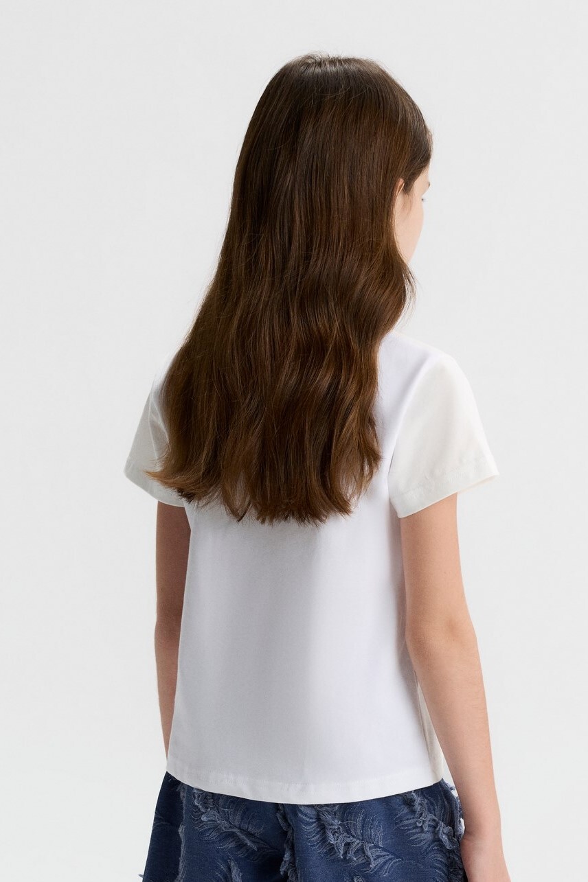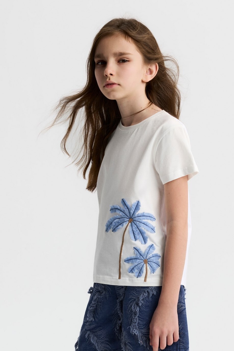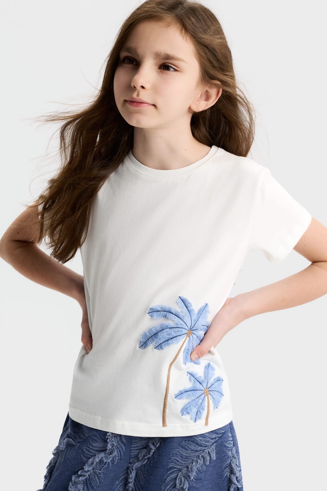 Bu kız çocuk tişörtü, bahar ayları için ideal, hafif ve rahat bir seçenektir. Beyaz renkte tasarlanmış, kısa kollu ve bisiklet yaka modelidir. Tişörtün sağ alt kısmında, kabartmalı ve dokulu mavi renk palmiye ağacı desenleri bulunur. Bu detaylar tişörte hem şık hem de eğlenceli bir hava katmaktadır. Günlük kullanıma uygun, sade ama dikkat çekici bir tasarıma sahiptir.