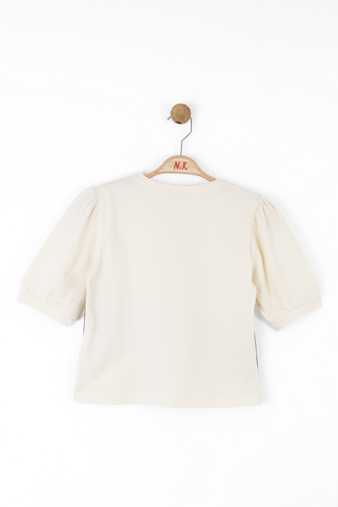 Bu krem rengi kız çocuk tişörtü, rahat ve şık tasarımı ile günlük kullanıma uygundur. Sıfır yaka ve hafif kabarık kısa kollara sahip olan tişört, yumuşak kumaşıyla çocukların konforunu ön planda tutar. Ön kısmındaki doğal tonlarda dağ ve yaprak desenleri, tişörte özgün ve modern bir görünüm kazandırır. Minimalist ve zarif tasarımı ile her yaşa uygun, 9-14 yaş arası çocuklar için idealdir.