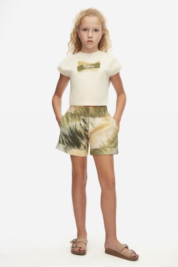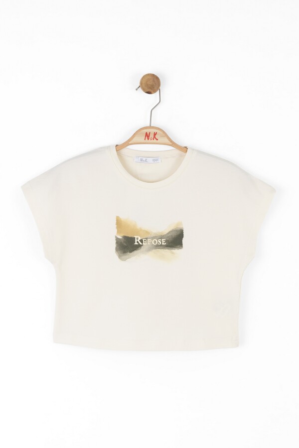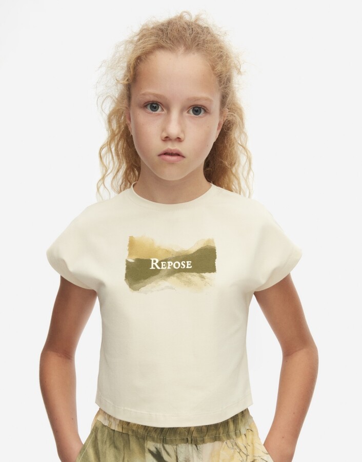 Bu şık kız çocuk tişörtü, rahat bir stil sunarak günlük kullanıma mükemmel bir seçenektir. Krem rengi ile her türlü kıyafetle kolayca kombinlenebilir. Üst kısmında bulunan "Repose" yazısı ve renk geçişli desen, tasarımı daha da çekici hale getiriyor.