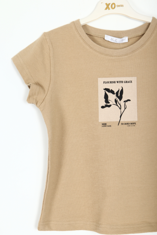 تتميز هذه التيشيرت للبنات بتصميم مريح وأنيق مناسب للاستخدام اليومي. بأكمام قصيرة وياقة دائرية، يوفر راحة في الارتداء. يأتي التيشيرت بلون جمل دافئ مع طبعة أمامية بسيطة لأوراق سوداء ونصوص ذات معنى. لا يحتوي على سحابات أو أزرار أو أربطة، مما يبرز البساطة في التصميم. يناسب أسلوب الحياة اليومي ويعتبر إضافة مثالية لخزانة ملابس الأطفال.