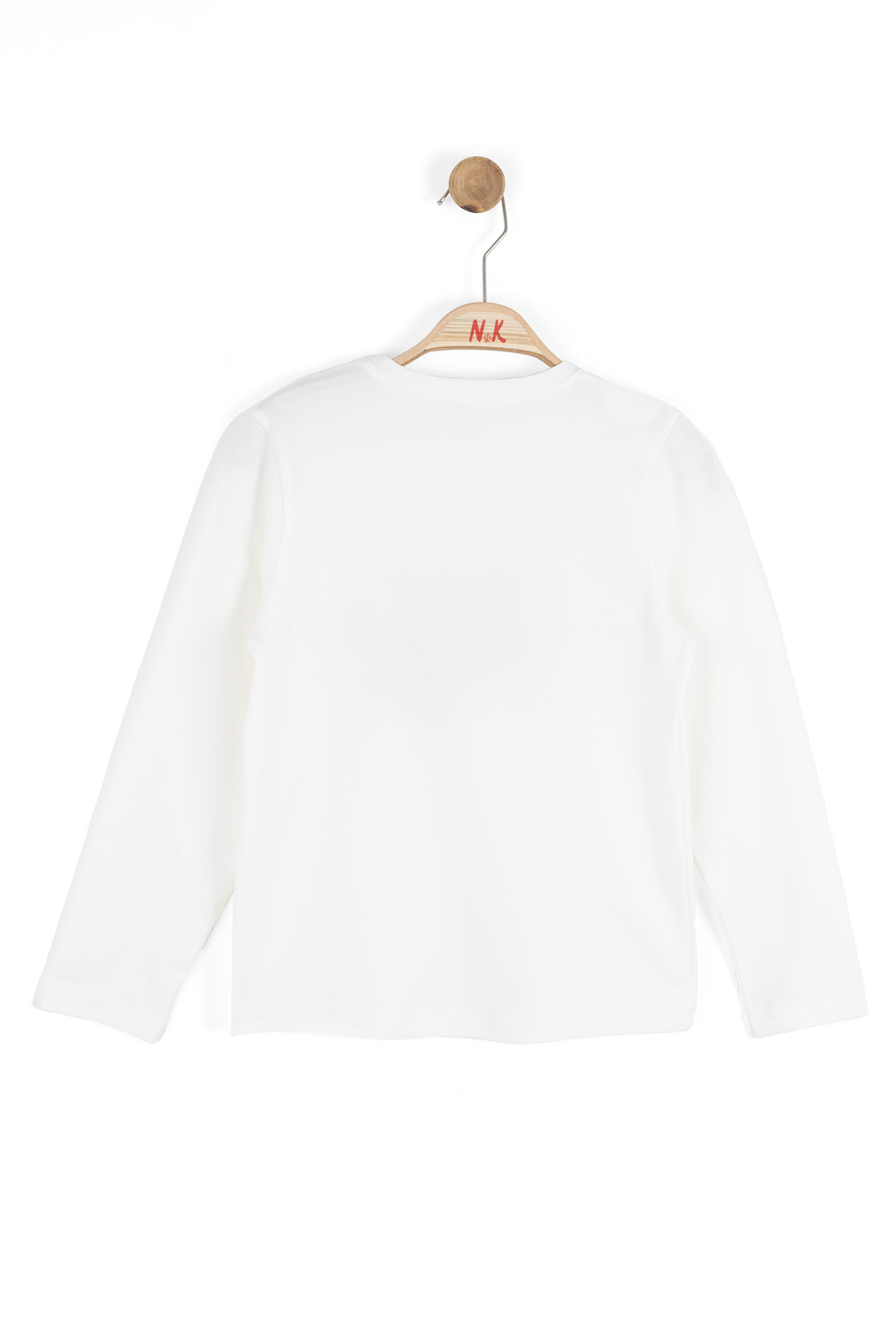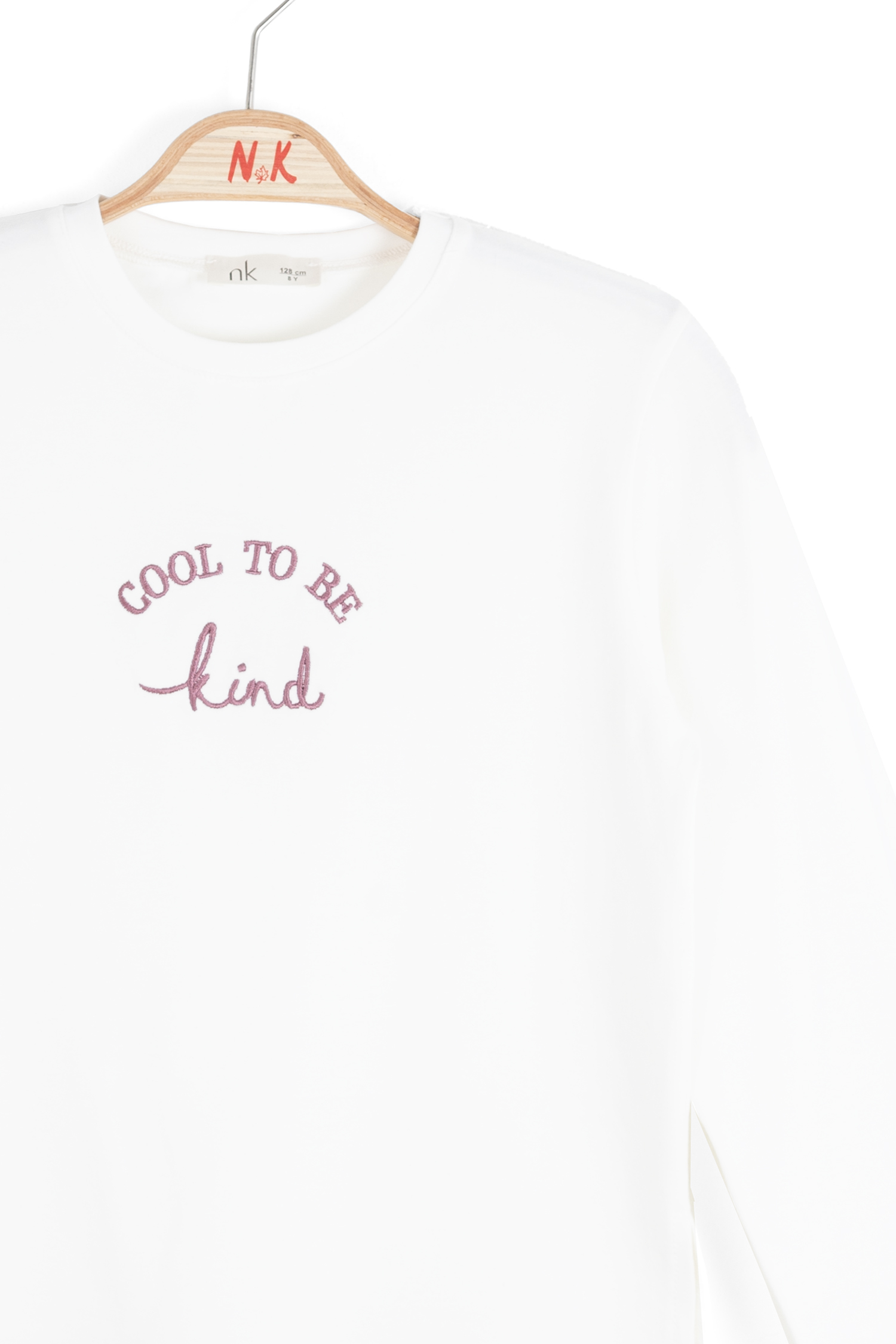 Bu kız çocuk tişörtü, sade ve şık tasarımıyla günlük kullanıma uygun, rahat bir seçenektir. Ekru renginde, uzun kollu ve bisiklet yaka modeldir. Üzerinde "Cool to be kind" yazısı pembe-bordo tonlarında nakış işlemeyle dikkat çeker. Fermuarlı veya kapüşonlu olmamakla birlikte, sade görünümü ve yumuşak kumaşıyla çocukların rahat hareket edebilmesini sağlar.