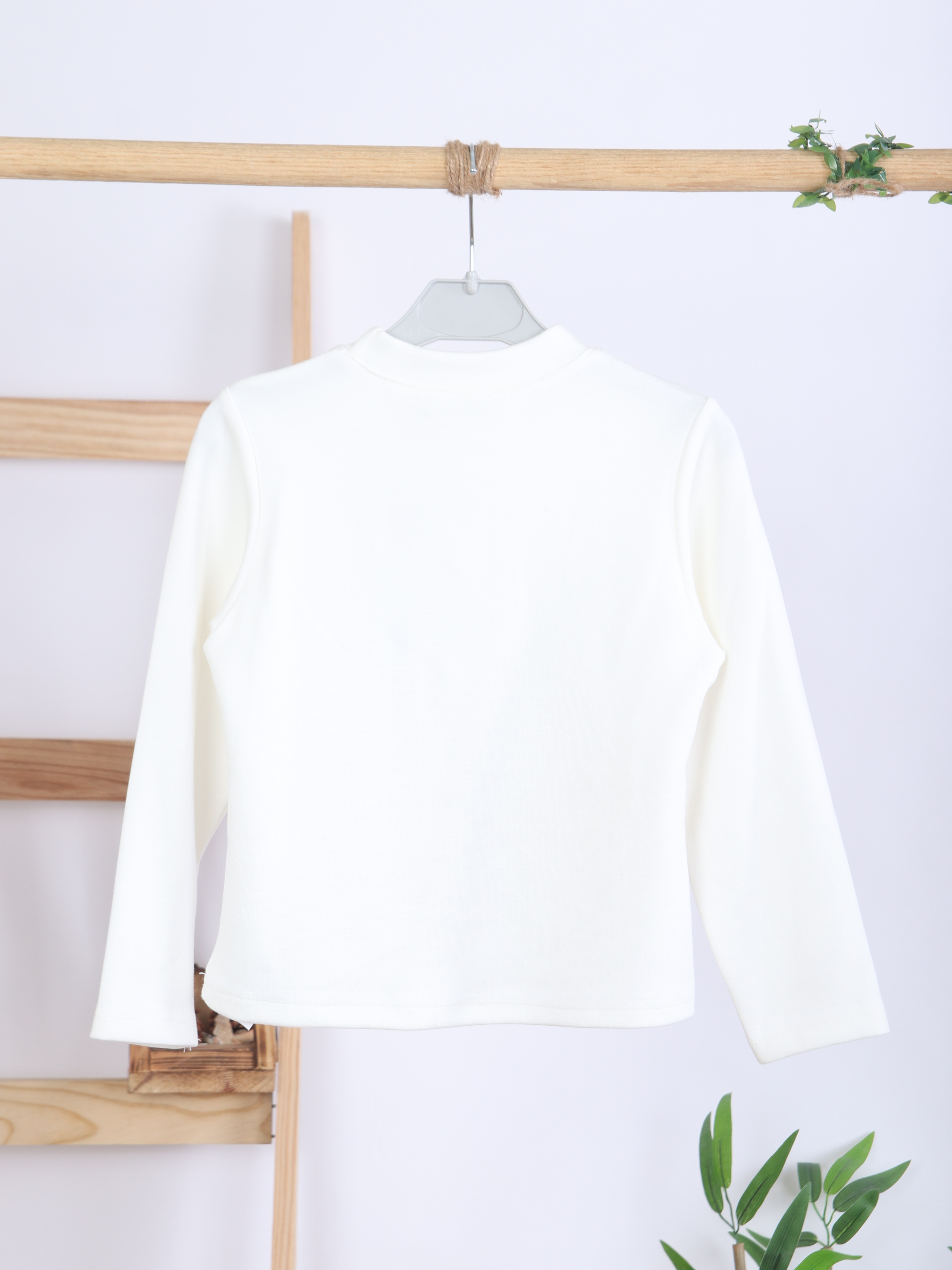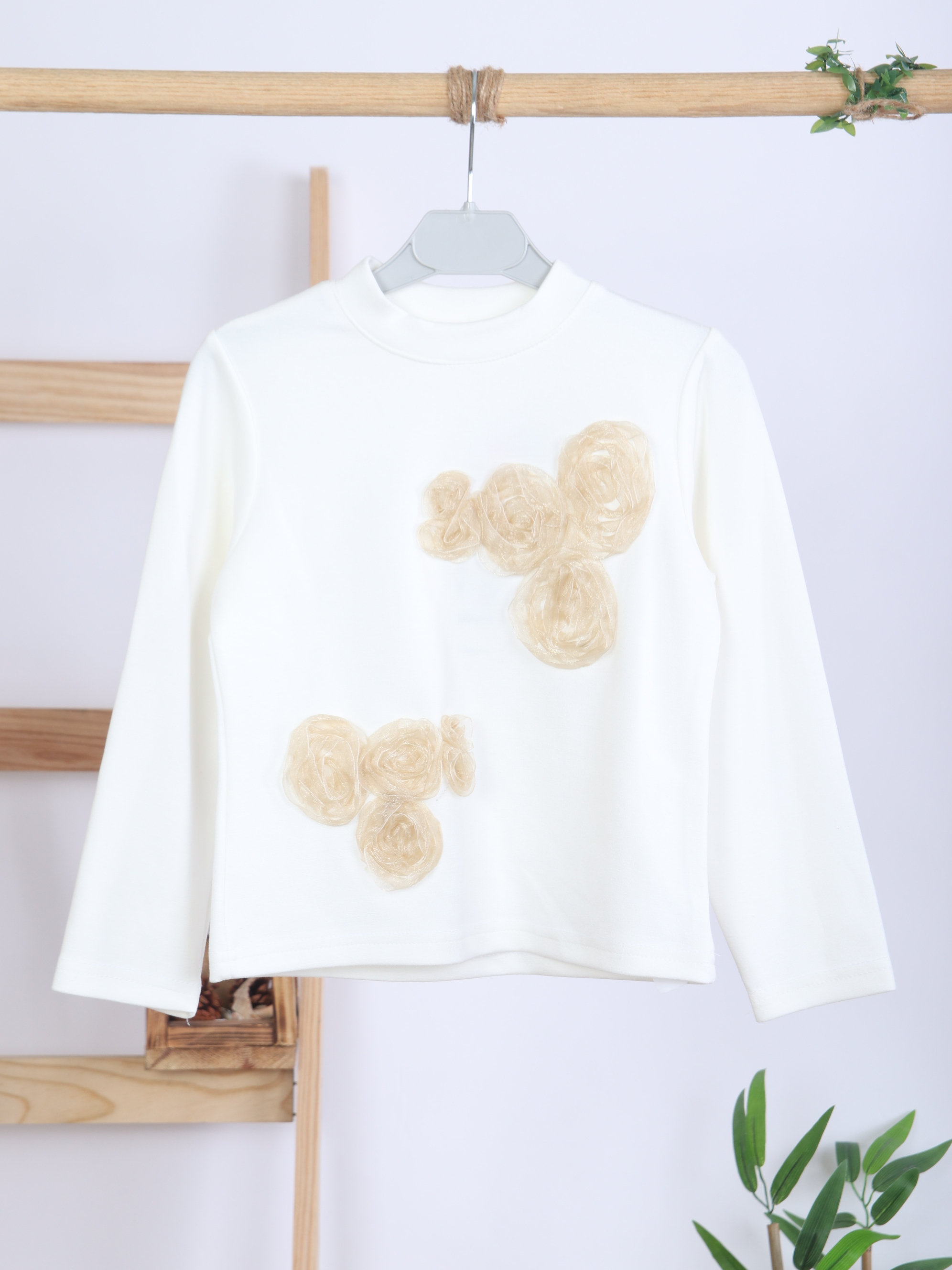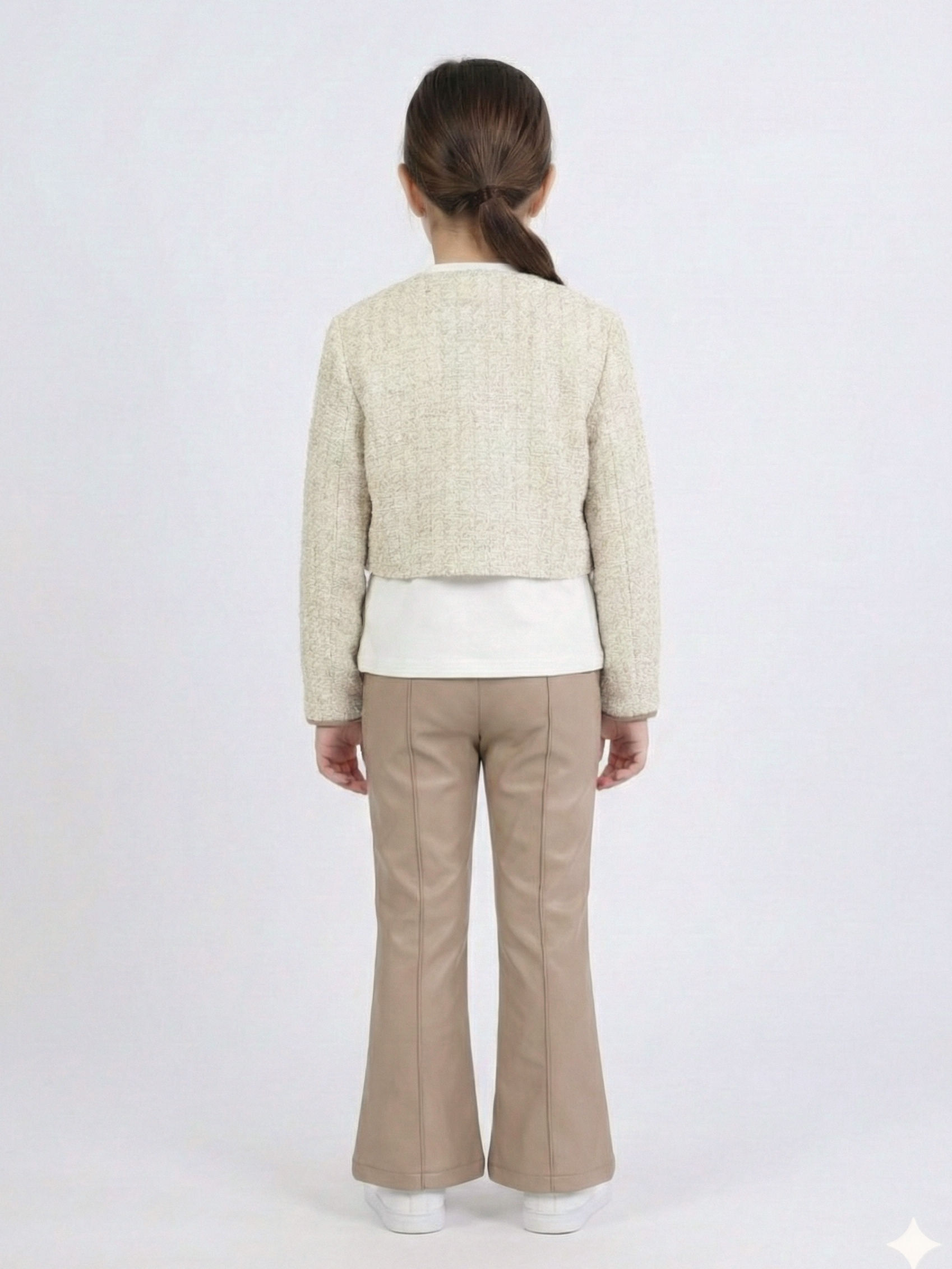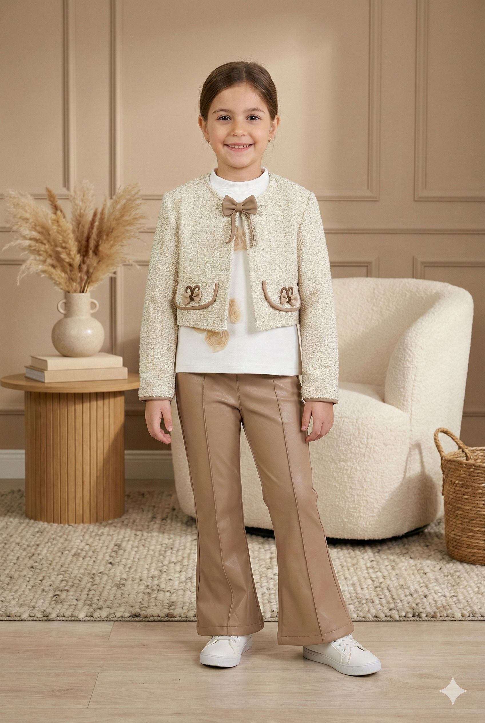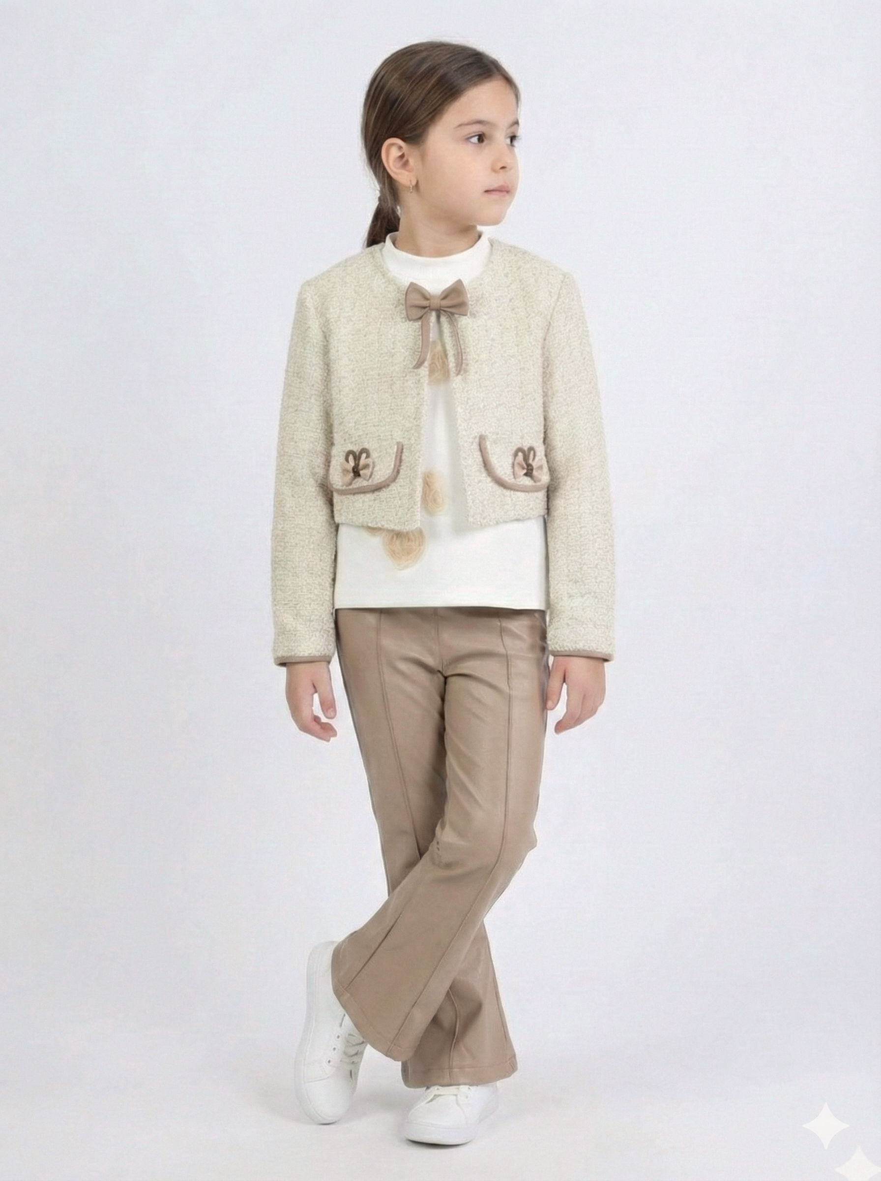 Bu kız çocuk alt üst takımı, bahar sezonu için ideal zarif ve şık bir seçimdir. Üst parça, bej tonlarında, kısa kesim ve uzun kollu bir cekettir. Sıfır yaka tasarımı, ceket üzerinde bulunan küçük fiyonk ve ceplerdeki zarif işlemelerle tamamlanmıştır. Alt parça ise kahverengiye yakın bej renkte, deri görünümlü ve hafif geniş paçalı pantolondur. Takım, günlük kullanıma uygun rahatlığı ve şıklığı bir arada sunar.