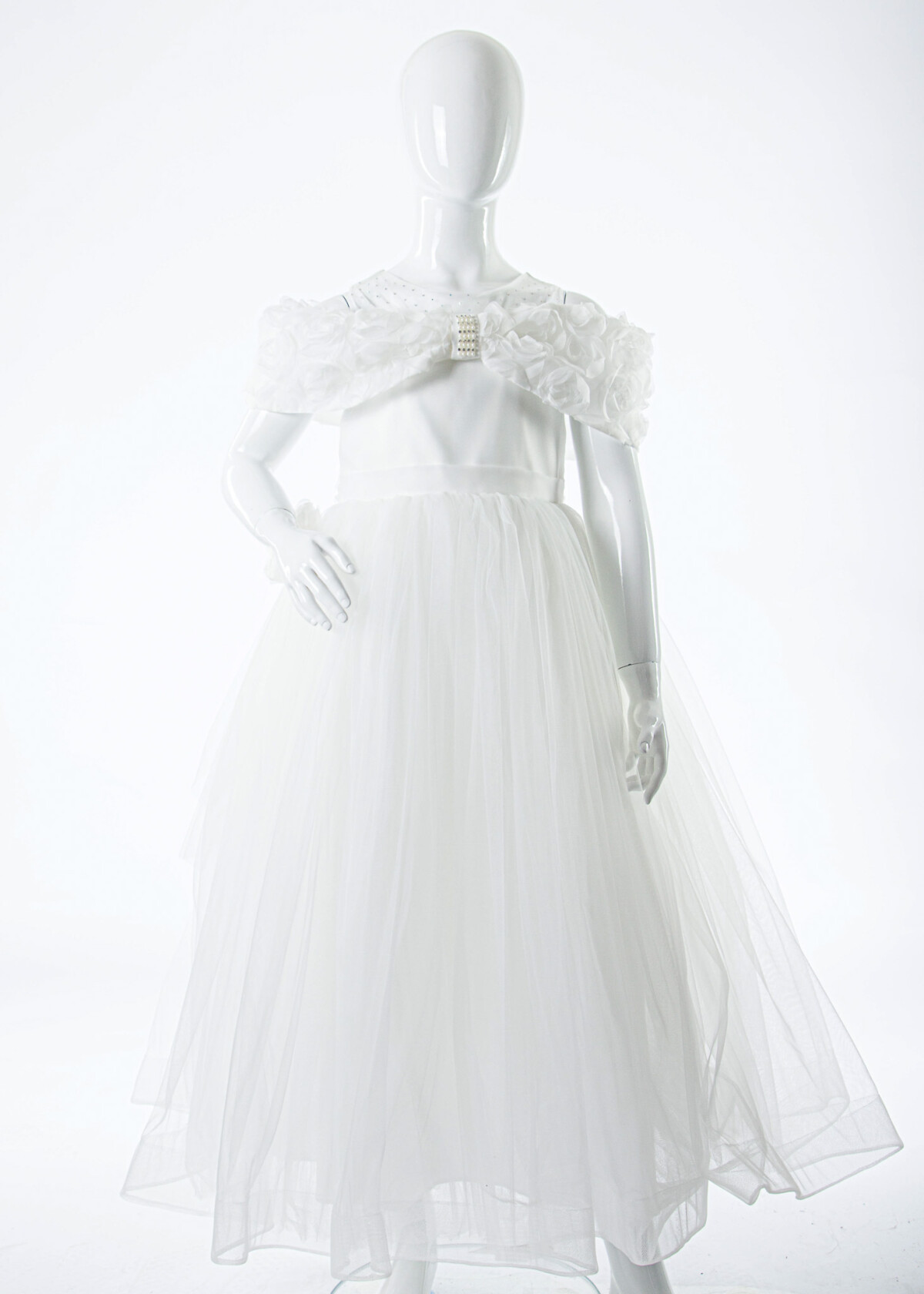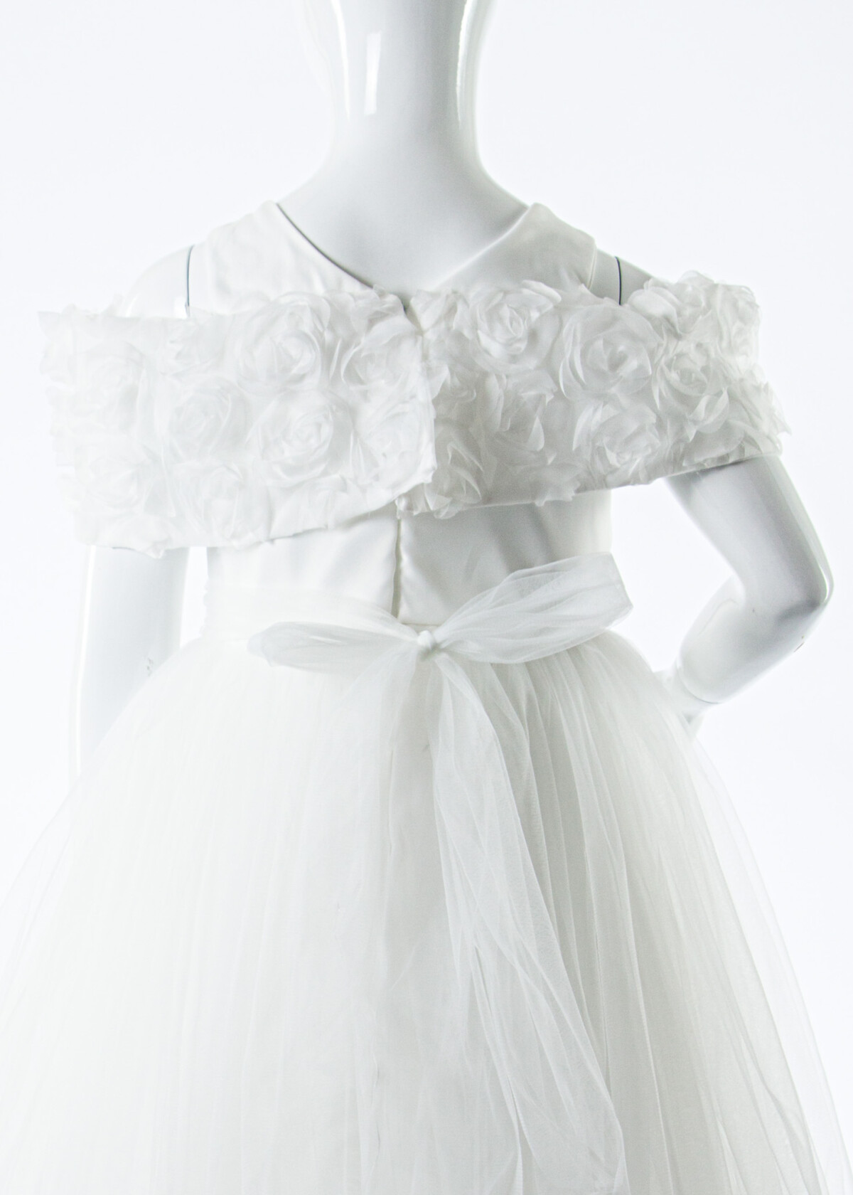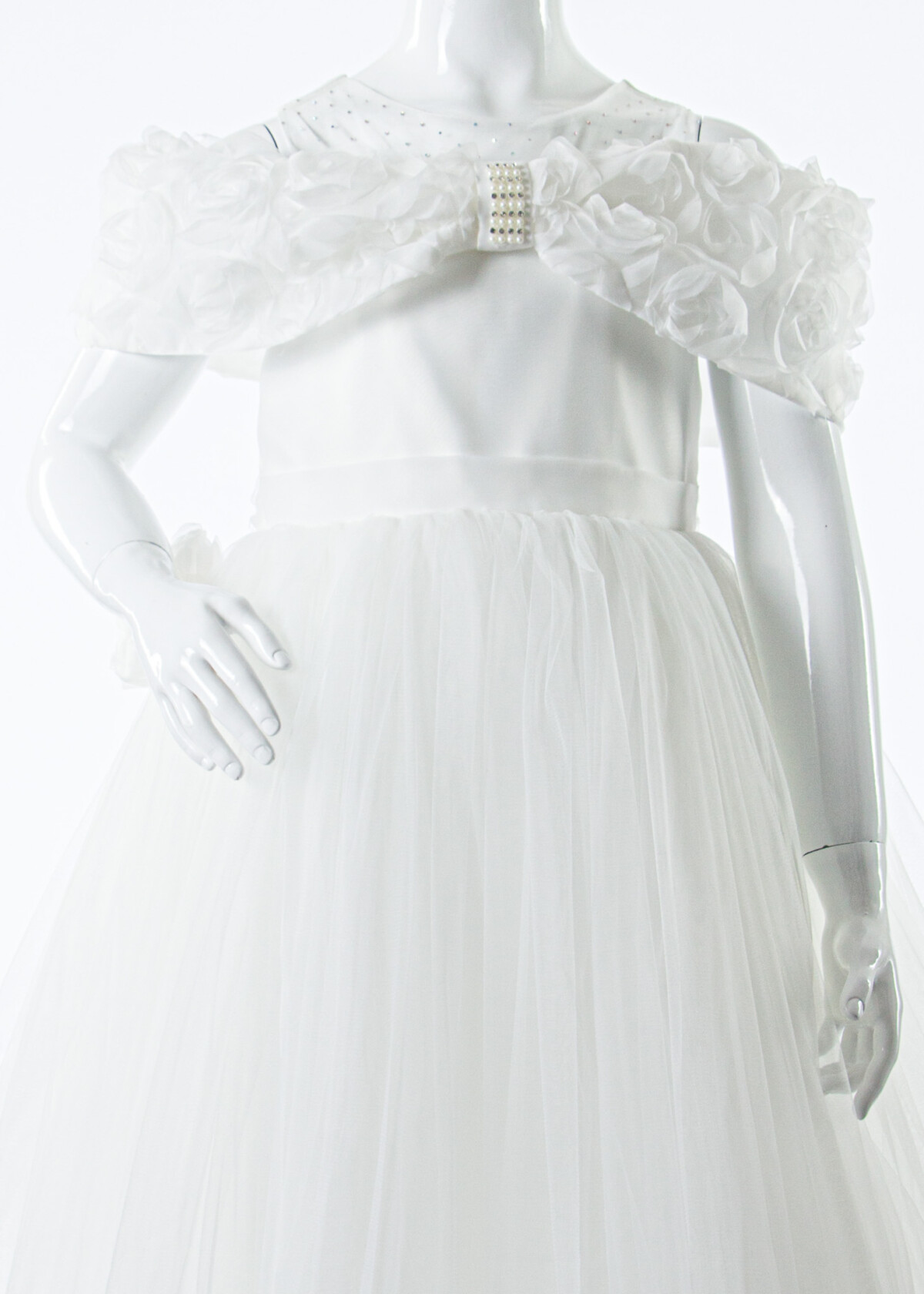 - Omuzları açık, çiçek detaylı kabarık tül süslemeli üst kısım
