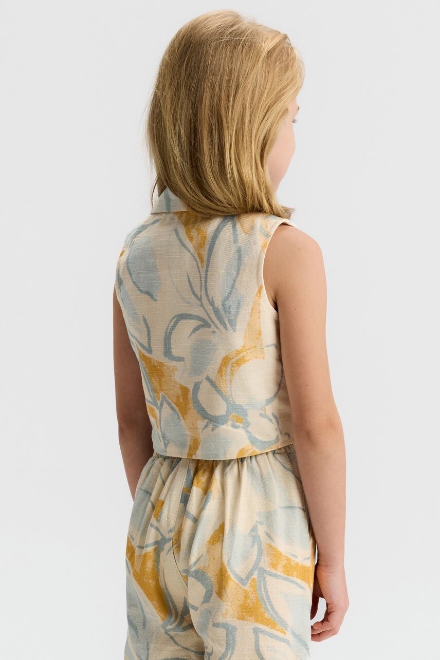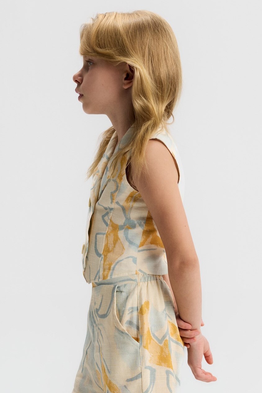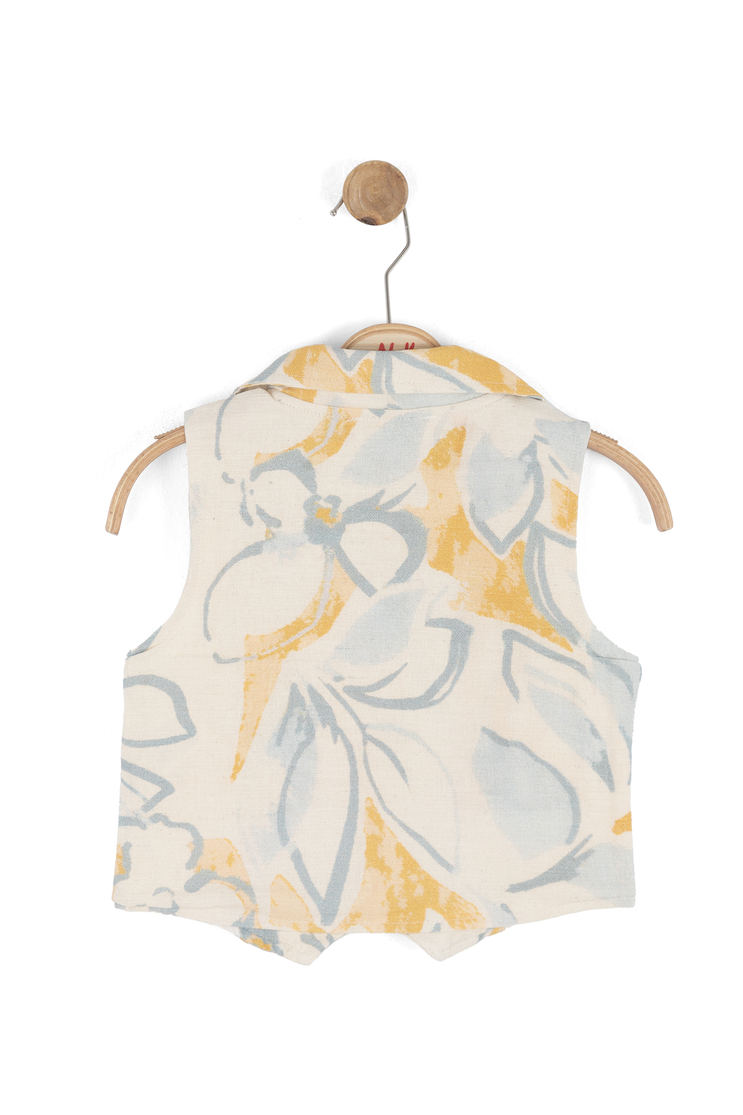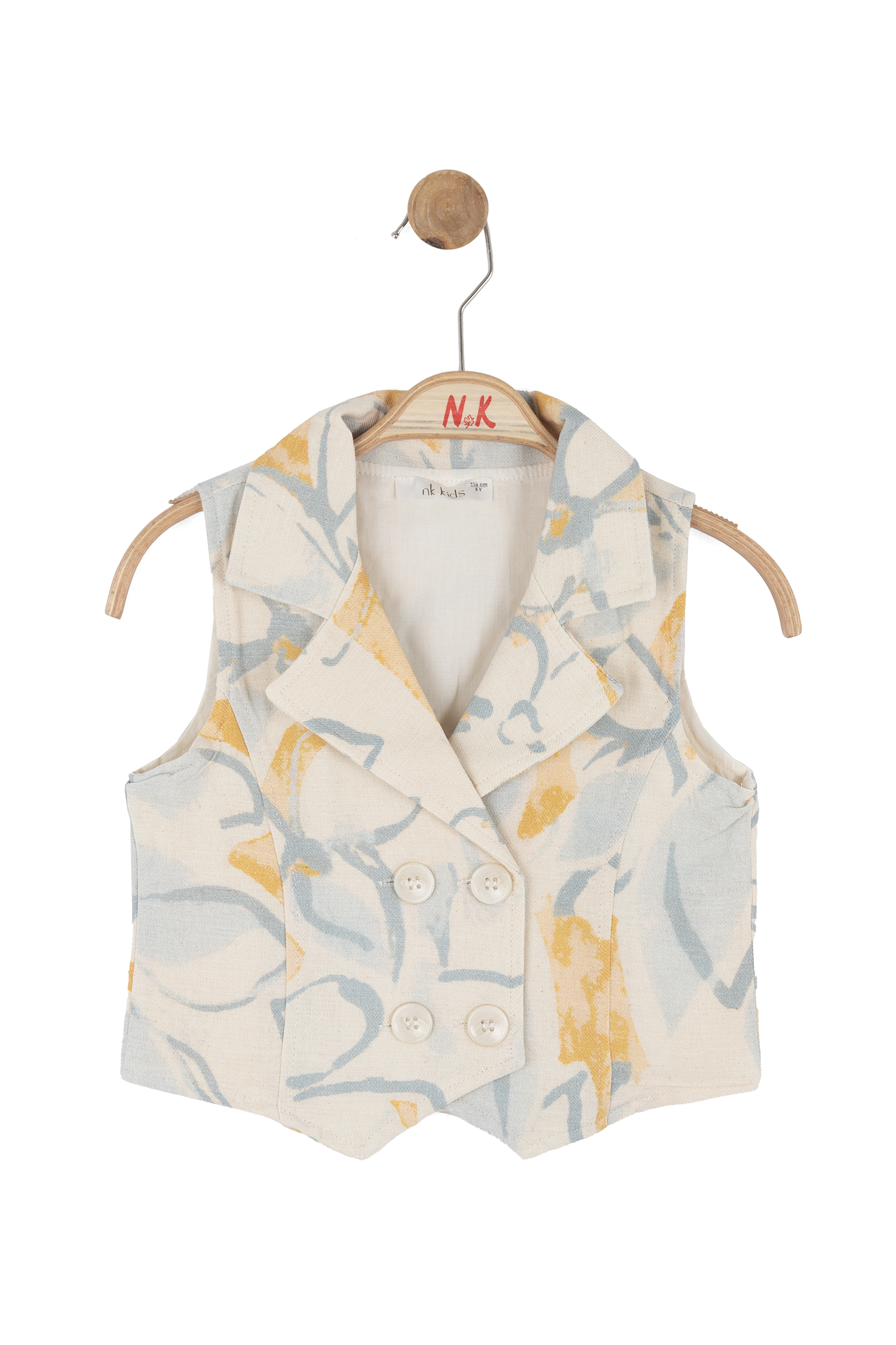 Bu kız çocuk yeleği, bahar mevsimine özel hafif ve rahat bir tasarıma sahiptir. Krem tonlarında, pastel mavi ve sarı renklerle soyut desenler içeren yelek, düğmeli çift sıra kapama detayına sahiptir. Kapüşonsuz, kolsuz ve kısa boy tasarımıyla hareket özgürlüğü sağlar. Yeleğin yakası klasik ceket yakası formundadır ve sade ama şık görünümüyle günlük kullanım için idealdir.