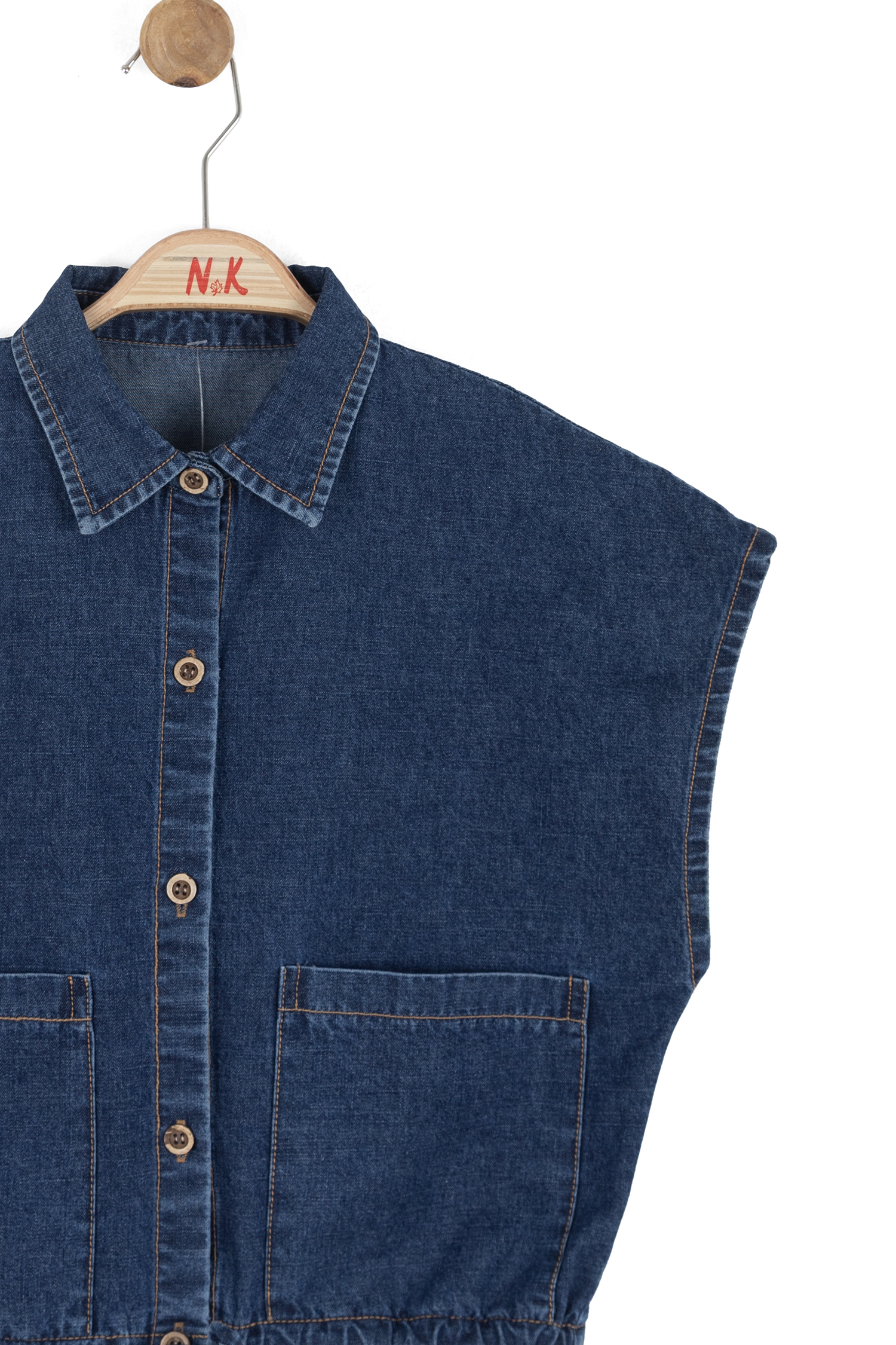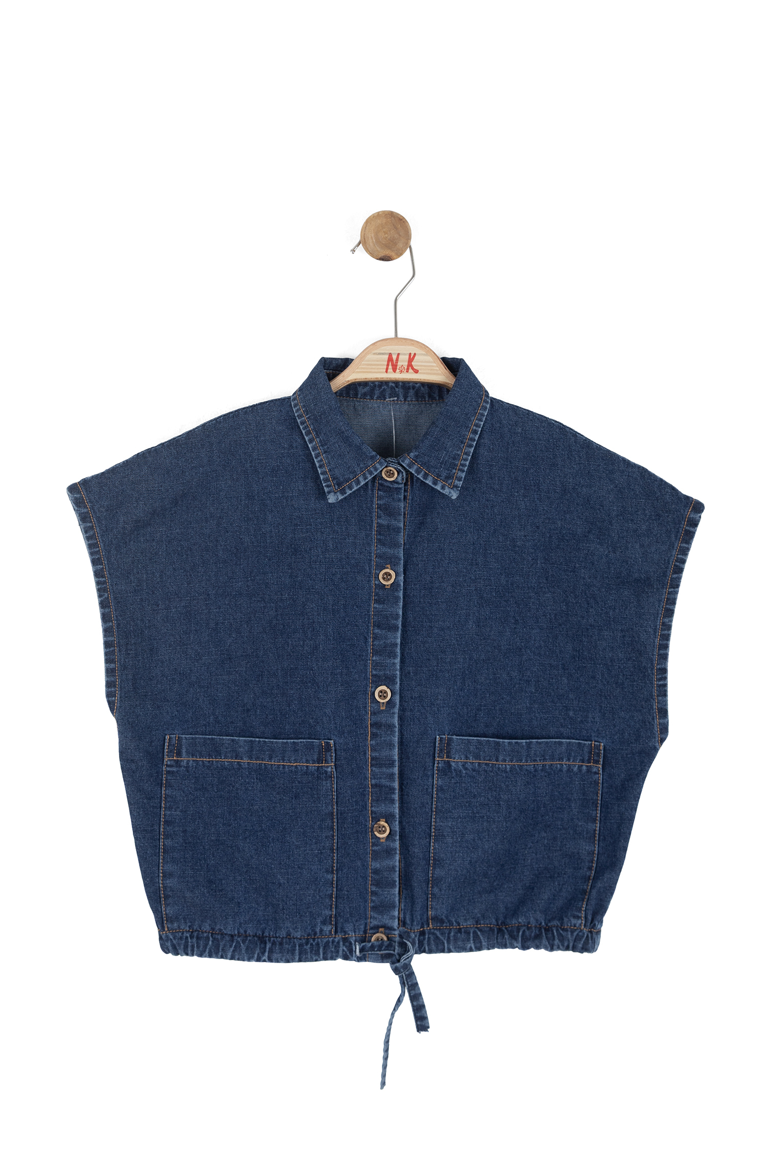 Bu kız çocuk yeleği, koyu mavi denim kumaştan üretilmiştir ve bahar sezonu için ideal bir dış giyim seçeneğidir. Kısa kollu ve kapüşonsuz tasarımıyla rahat bir kullanım sunar. Ön kısmında ahşap görünümlü düğmelerle kapanma sağlanırken, geniş iki ön cep pratiklik katar. Alt kısmında bulunan kordon sayesinde yeleğin bel hizasında ayarlanabilir bir oturuş sağlar.