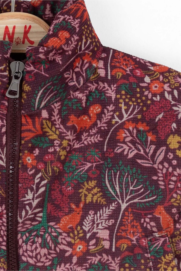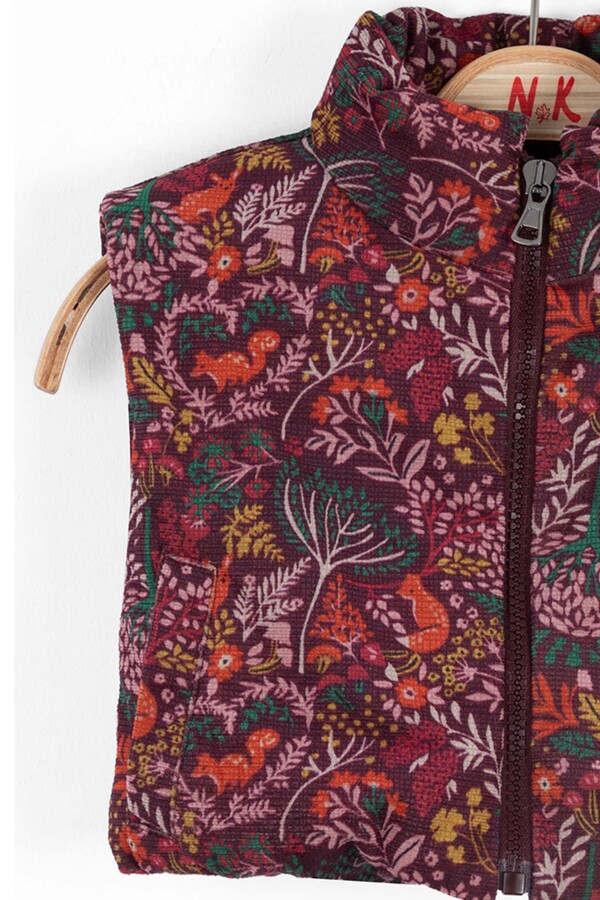 Bu kız çocuk yeleği, kış aylarında sıcak tutacak şık ve fonksiyonel bir parçadır. Bordo tonlarında, doğa temalı sevimli desenlerle süslenmiştir. Yelek kapüşonsuz olup, önde fermuarlı kapanışı sayesinde kolayca giyilip çıkarılabilir. Uzun ve dik yakası soğuktan korurken, yan cepleri de küçük eşyalar için kullanışlıdır. Kısa kollu yapısı sayesinde hareket özgürlüğü sağlar ve kat kat giyime uygundur. Hem günlük kullanıma hem de dış mekan aktivitelerine uyacak rahat ve modern bir stildir.