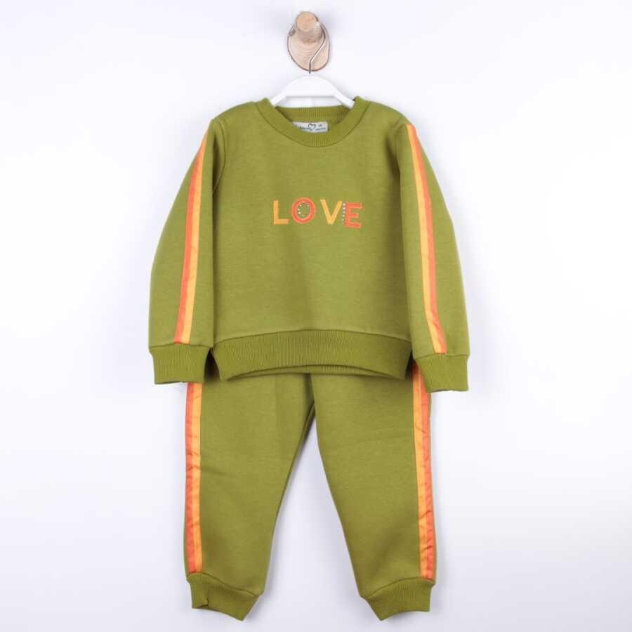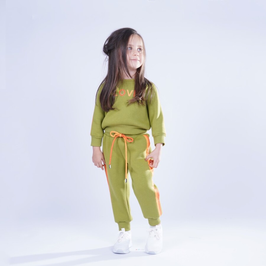 Bu kız çocuk eşofman takımı, rahatlığı ve şıklığı bir arada sunuyor. Kapüşonlu olmayan, bisiklet yaka üst kısmı uzun kollu ve ribana manşetlere sahip. Alt kısmı ise bilek kısmı ribanalı, cepli ve kordonlu. Canlı yeşil renk üzerine turuncu detaylar, takıma enerjik bir hava katıyor. Takım, günlük kullanıma ve kış mevsimine uygun, çocukların hareket özgürlüğünü destekleyen sportif bir tarza sahip.