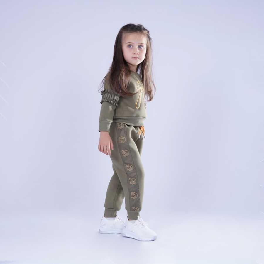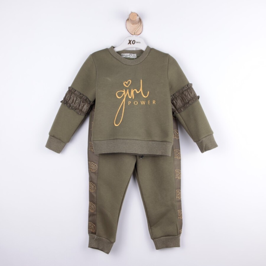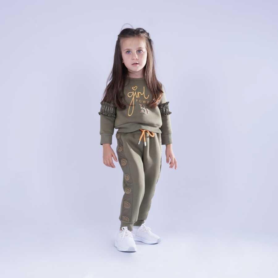 Bu kız çocuk eşofman takımı, rahatlığı ve şıklığı bir arada sunar. Haki renkte tasarlanmış olan takım, uzun kollu ve bisiklet yaka üstten oluşur. Üst kısmında "girl power" yazısı ve desen detayları yer alırken, kol kısmında şık pileli süslemeler dikkat çeker. Alt kısmı bileklerde lastikli ve yanlarda desenli şeritlerle hareketlendirilmiştir. Turuncu kordonlu bel, hem ayarlanabilirlik sağlar hem de görsel olarak hoş bir kontrast yaratır. Bu takım, kış mevsimi için ideal kalınlıkta ve spor tarzda hazırlanmıştır.