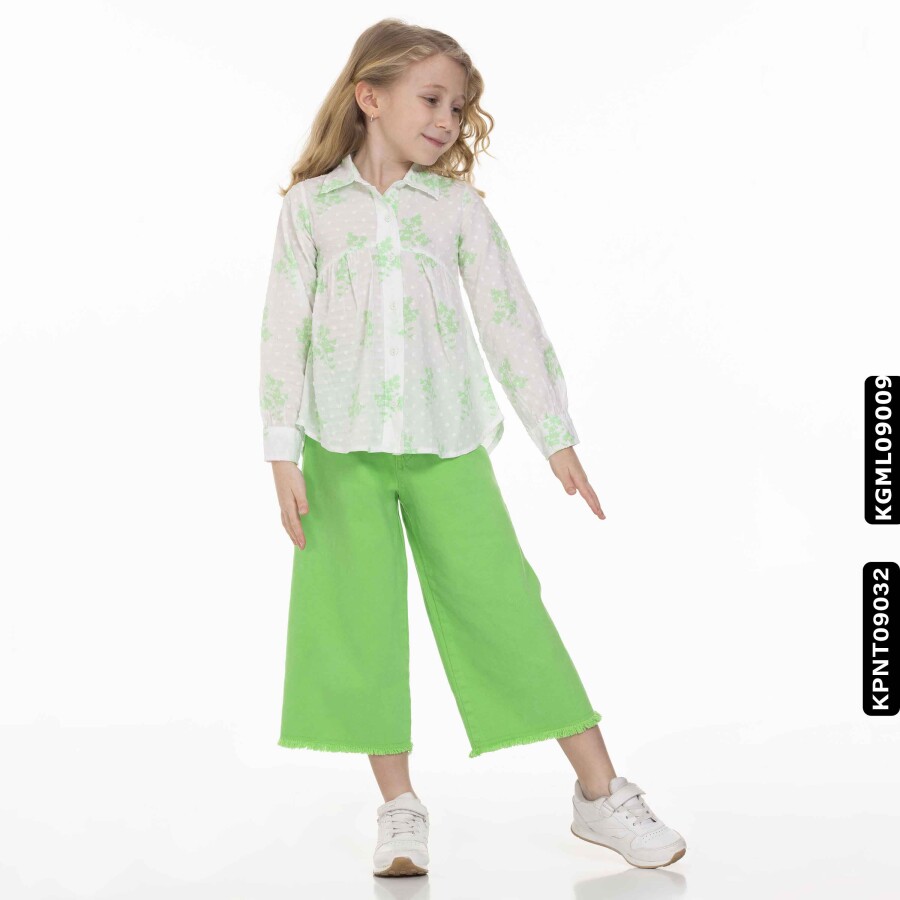 Yaz mevsimi için ideal, kız çocuklarına özel tasarlanmış bu gömlek, şıklığı ve rahatlığı bir arada sunuyor. Uzun kollu ve düğmeli tasarımı sayesinde kolay giyilip çıkarılabilir. Hafif ve ince kumaşı, sıcak günlerde ferah bir kullanım sağlar. Beyaz zemin üzerine yeşil çiçek desenleriyle süslenmiş olan gömlek, ince puantiye dokusuyla dikkat çeker. Bisiklet yakaya yakın, klasik gömlek yakası ile zarif bir görünüm sunar. Günlük kullanımda veya özel davetlerde rahatlıkla tercih edilebilir.
