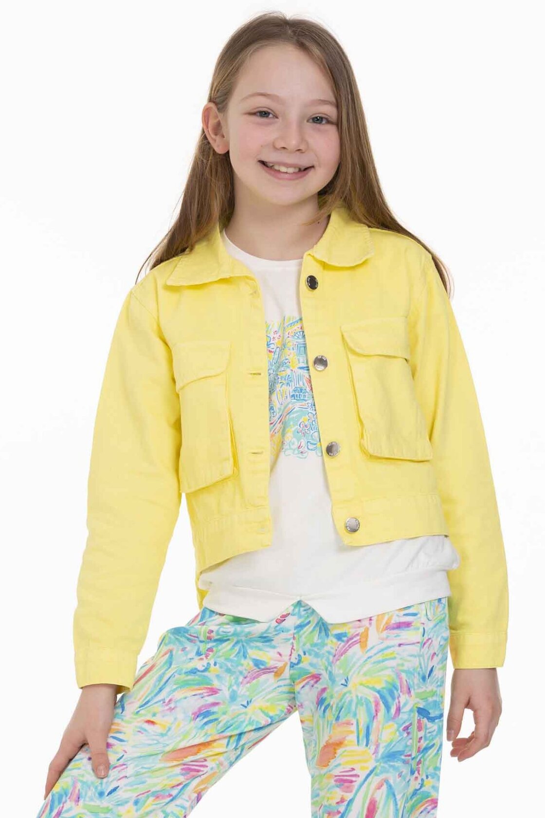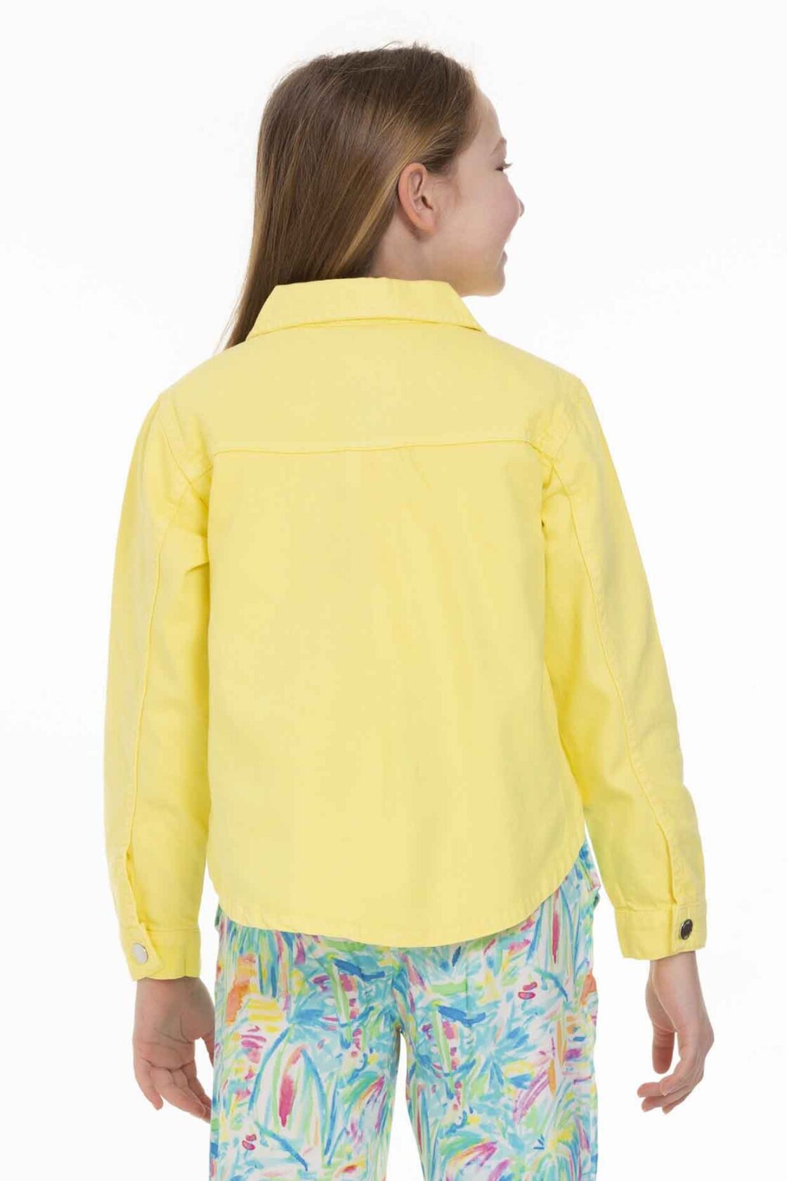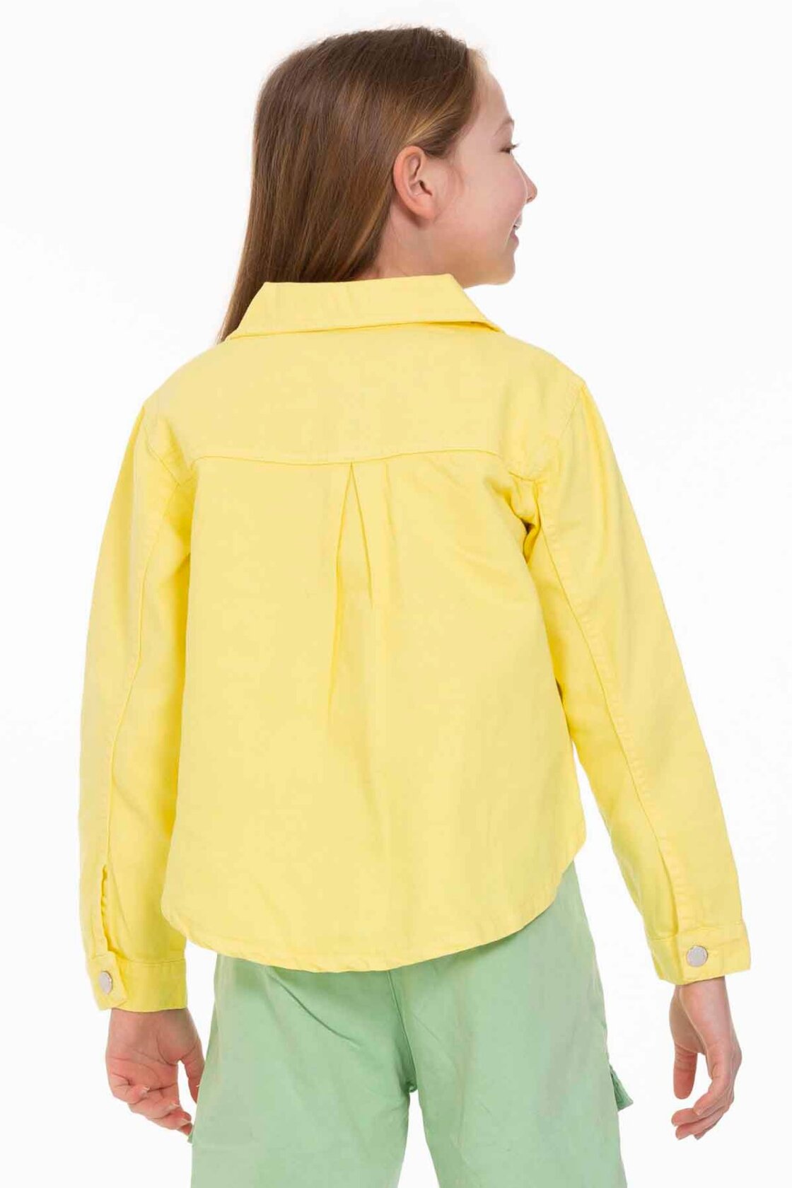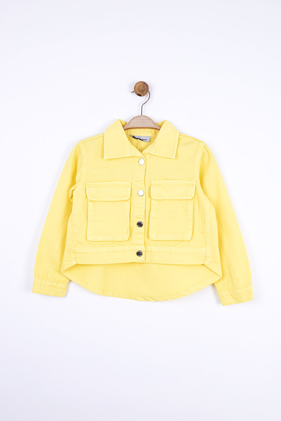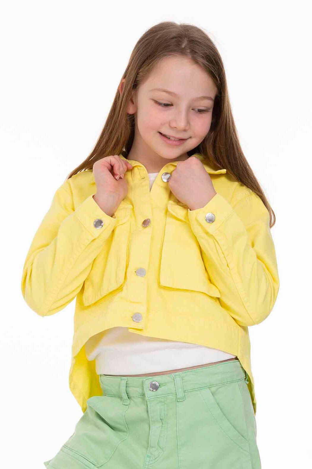Bu kız çocuk ceketi, parlak sarı rengiyle yaz ayları için ideal bir seçimdir. Kapüşonsuz ve önü düğmeli tasarımıyla sade ve şık bir görünüm sunar. Uzun kollu olup, ön kısmında iki büyük cepli detay bulunur, bu da pratiklik sağlar. Ceket, kısa ve hafif arkadan uzayan kesimiyle modern ve rahat bir stil yaratır. Günlük kullanım için spor ve casual bir hava taşır.