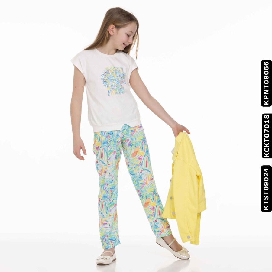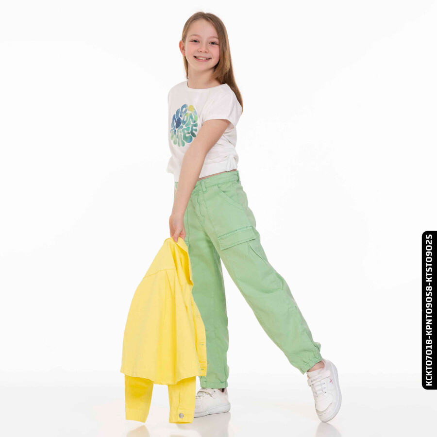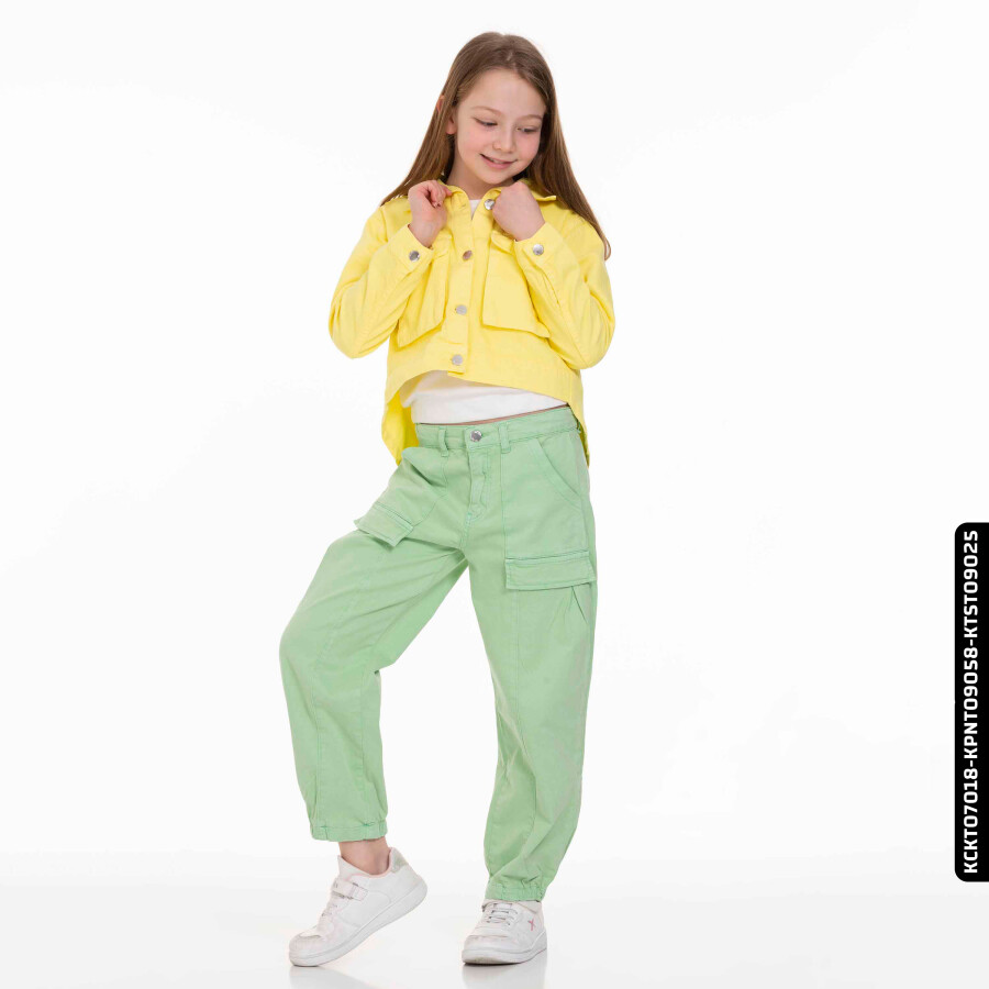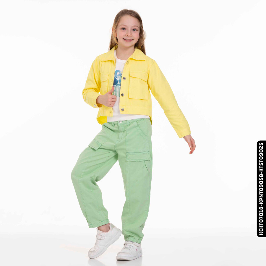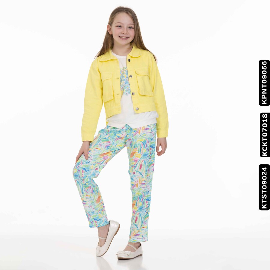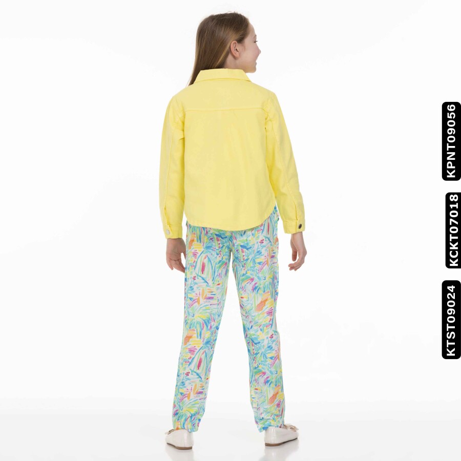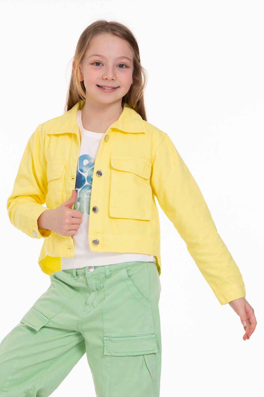 Bu kız çocuk ceketi, parlak sarı rengiyle yaz ayları için ideal bir seçimdir. Kapüşonsuz ve önü düğmeli tasarımıyla sade ve şık bir görünüm sunar. Uzun kollu olup, ön kısmında iki büyük cepli detay bulunur, bu da pratiklik sağlar. Ceket, kısa ve hafif arkadan uzayan kesimiyle modern ve rahat bir stil yaratır. Günlük kullanım için spor ve casual bir hava taşır.