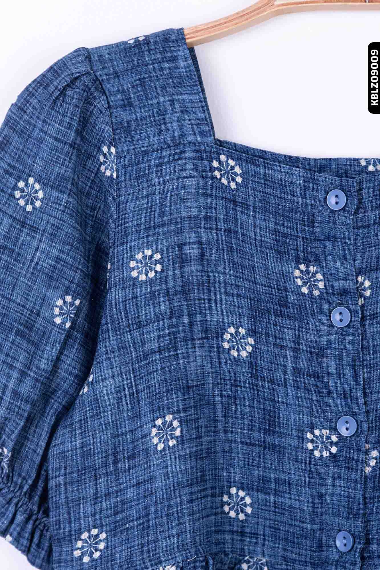 Bu kız çocuk bluz, yaz ayları için ideal hafif ve rahat bir seçenektir. Mavi tonlarında, küçük beyaz çiçek desenleriyle süslenmiş olan bluz, bisiklet yaka ve düğmeli ön kapama detaylarına sahiptir. Kısa, hafif kabarık ve lastikli kol manşetleri sayesinde şık ve kullanışlıdır. Bluzun alt kısmındaki hafif volan, hareket özgürlüğü sunarken tasarıma zarif bir dokunuş katar. Günlük ve şık kombinler için uygun, sade ama dikkat çekici bir üründür.