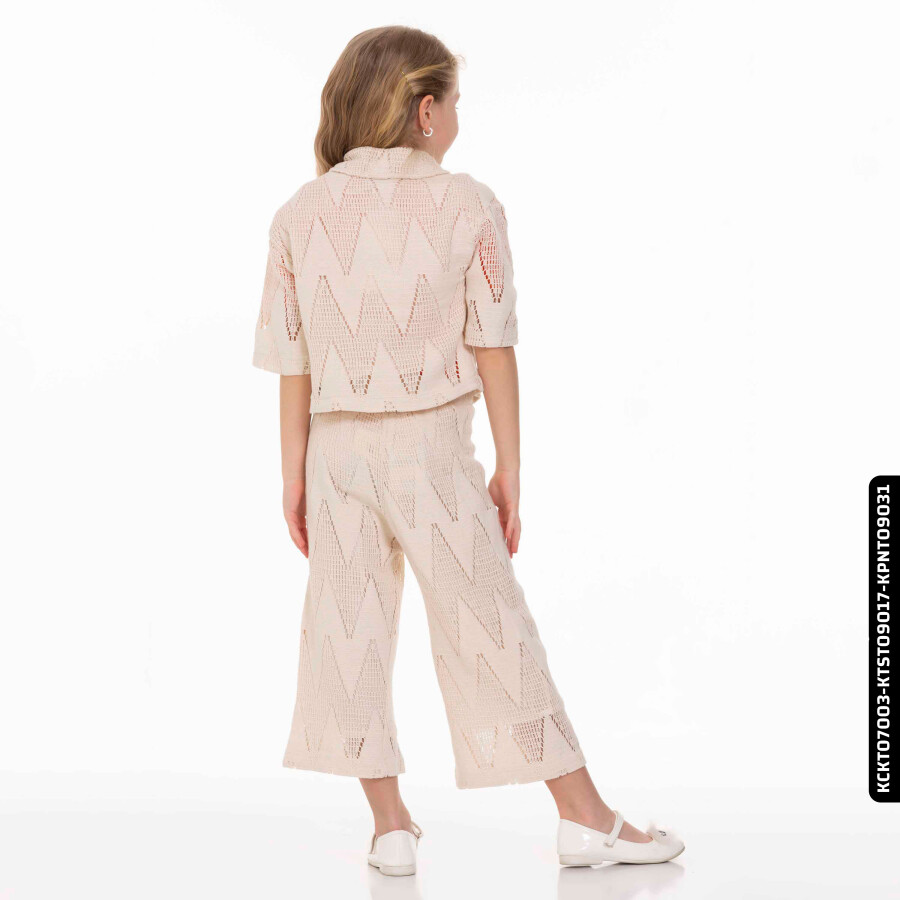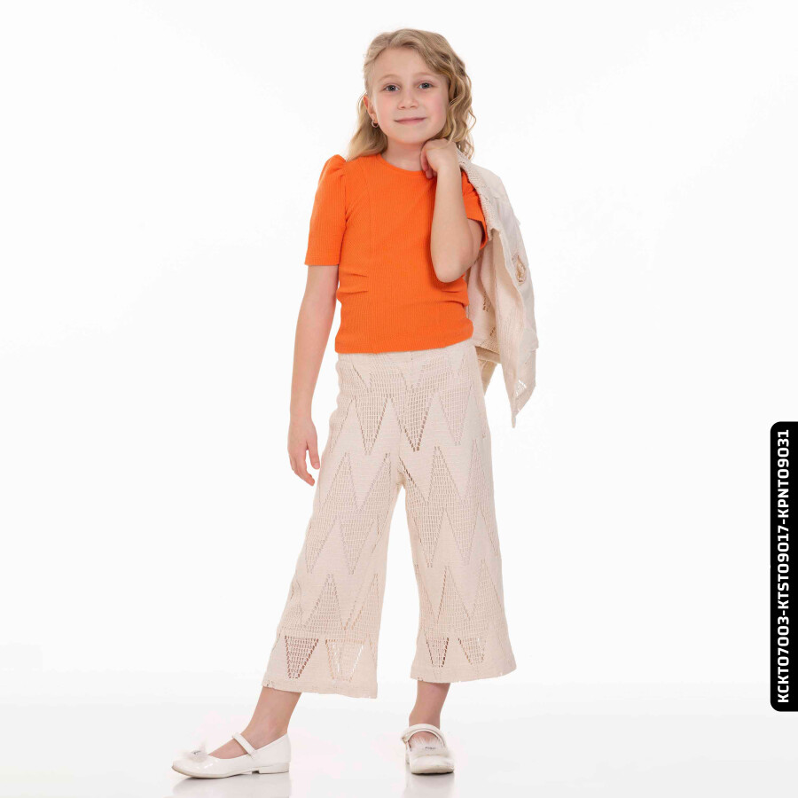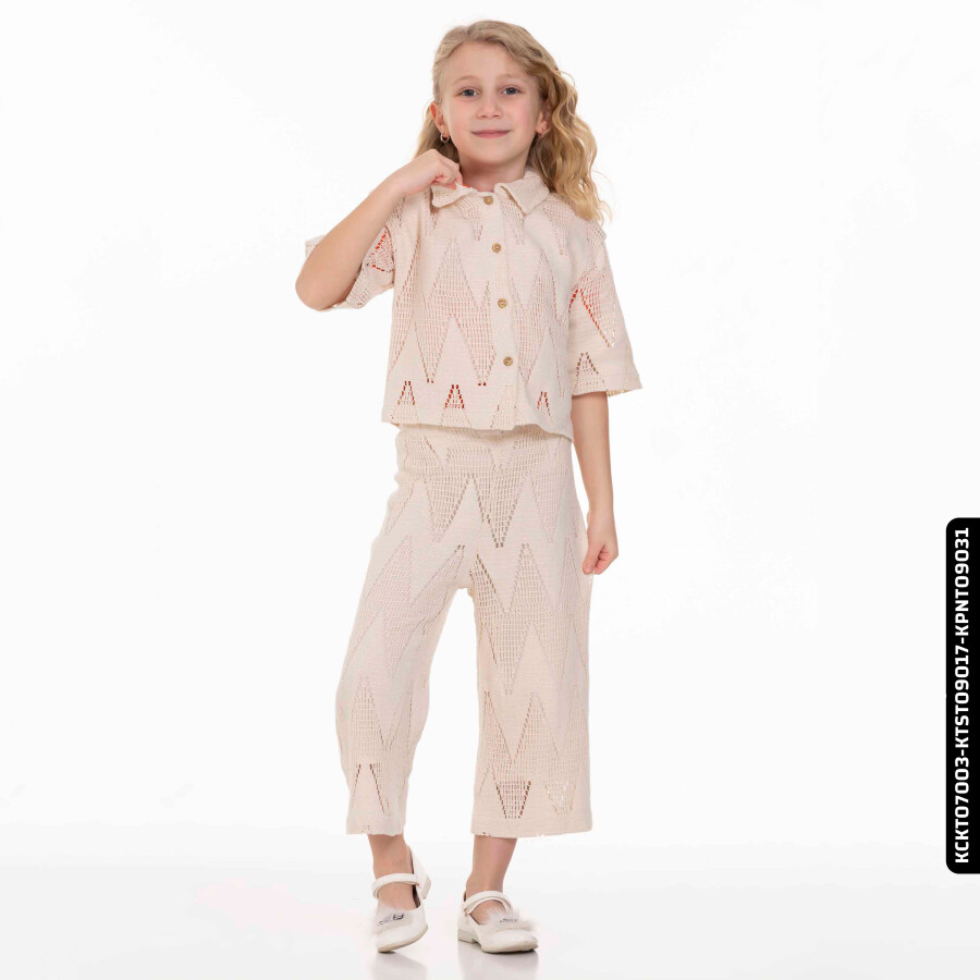 Yaz ayları için ideal olan bu kız çocuk pantolonu, bej renk tonunda ve hafif transparan dokusuyla şıklık sunar. Rahat kesimi ve midi boy uzunluğu sayesinde hareket özgürlüğü sağlar. Pantolon, zigzag desenli örme kumaştan yapılmıştır ve kombini tamamlayan kısa kollu, düğmeli ceketle uyum içindedir. Günlük kullanım için hem rahat hem de stil sahibi bir tercihtir.