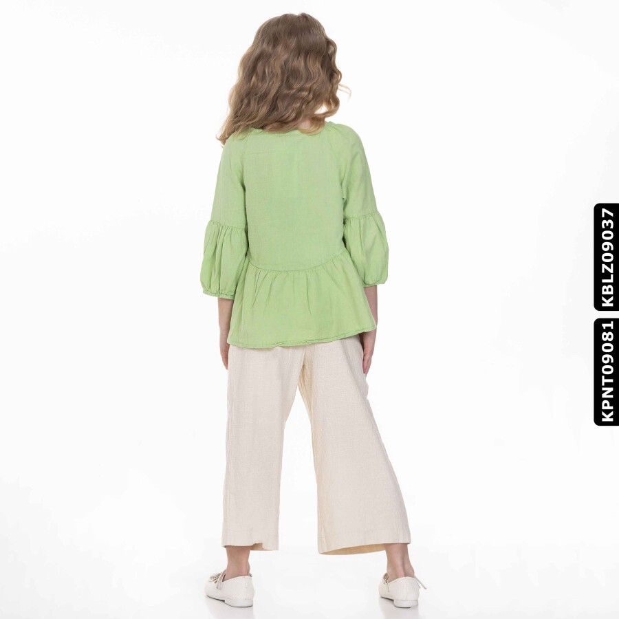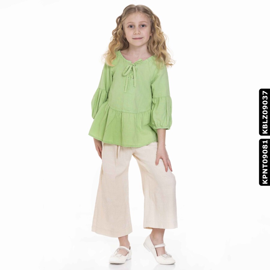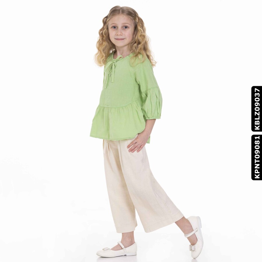 Bu kız çocuk pantolonu, yaz ayları için ideal hafif ve ferah bir modeldir. Ekru rengiyle sade ve şık bir görünüm sunar. Bol kesimi ve midi boy uzunluğuyla rahat hareket imkanı sağlar. Elastik bel detayı sayesinde kolayca giyilip çıkarılabilir. Günlük kullanıma uygun, konforlu ve şık bir seçenektir.