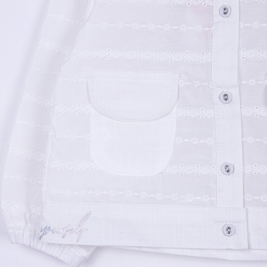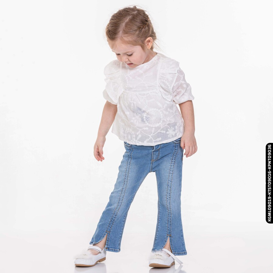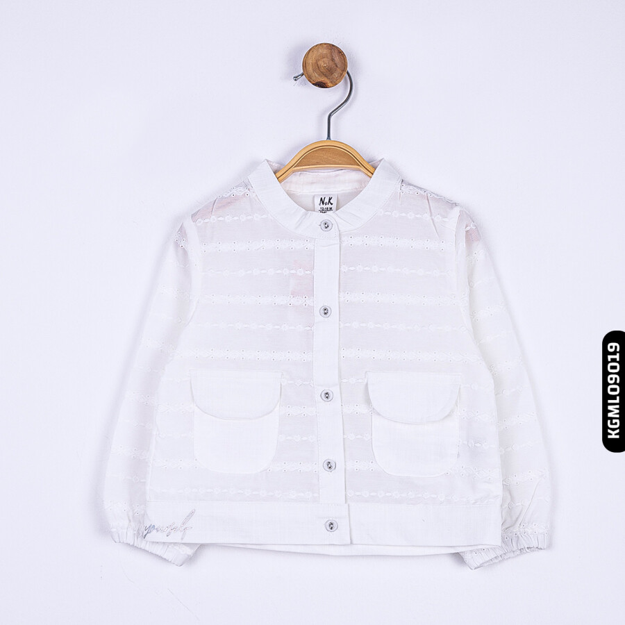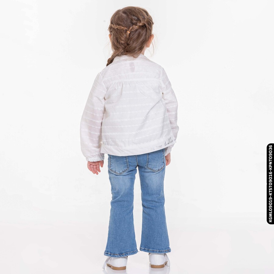 Bu kız çocuk gömlek modeli, yaz ayları için hafif ve rahat bir seçim sunar. Ekru renginde, ince ve şeffaf desenlerle süslenmiş, kısa kollu ve fırfır detaylı bir bluz olarak tasarlanmıştır. Gömleğin üzerinde düğmeli, uzun kollu ve hafif şeffaf bir ceket bulunmakta, bu ceket küçük cepler ve elastik manşetlere sahiptir. Alt kısmında ise modern bir dokunuşla, paçalarında küçük yırtmaçlar bulunan, rahat kesim kot pantolon yer alır. Günlük kullanıma uygun, casual bir stil sunar ve hareket özgürlüğü sağlar.