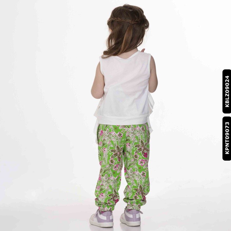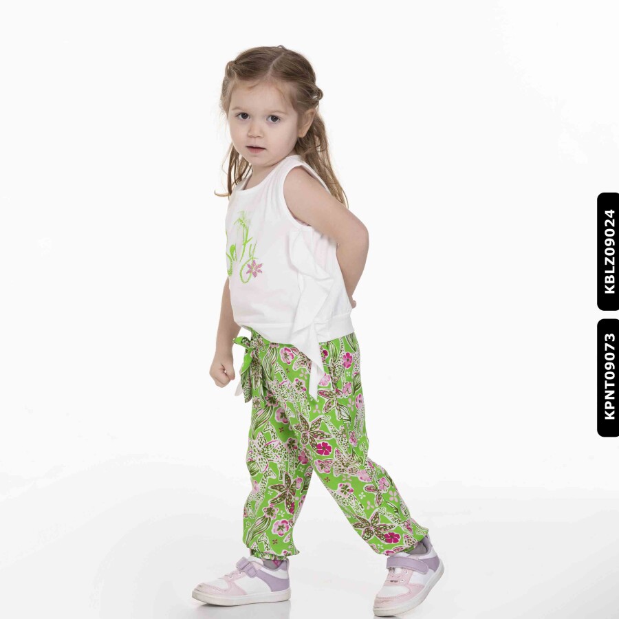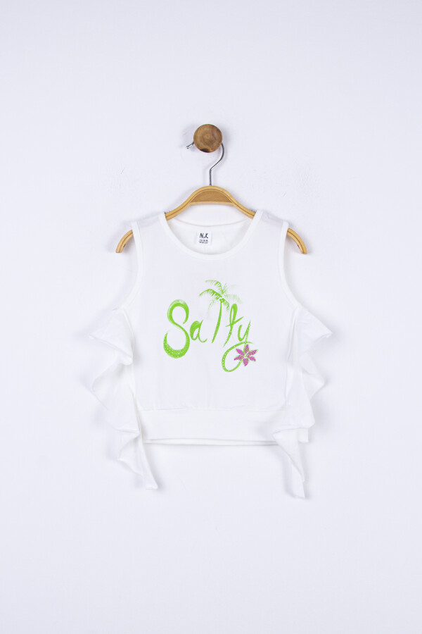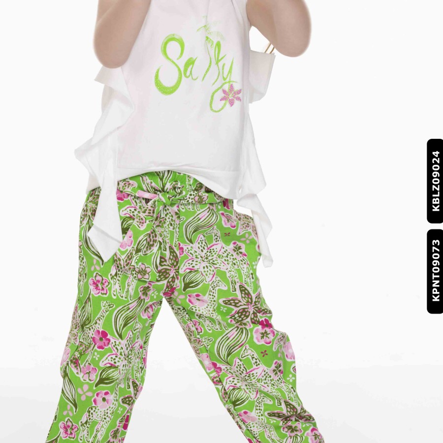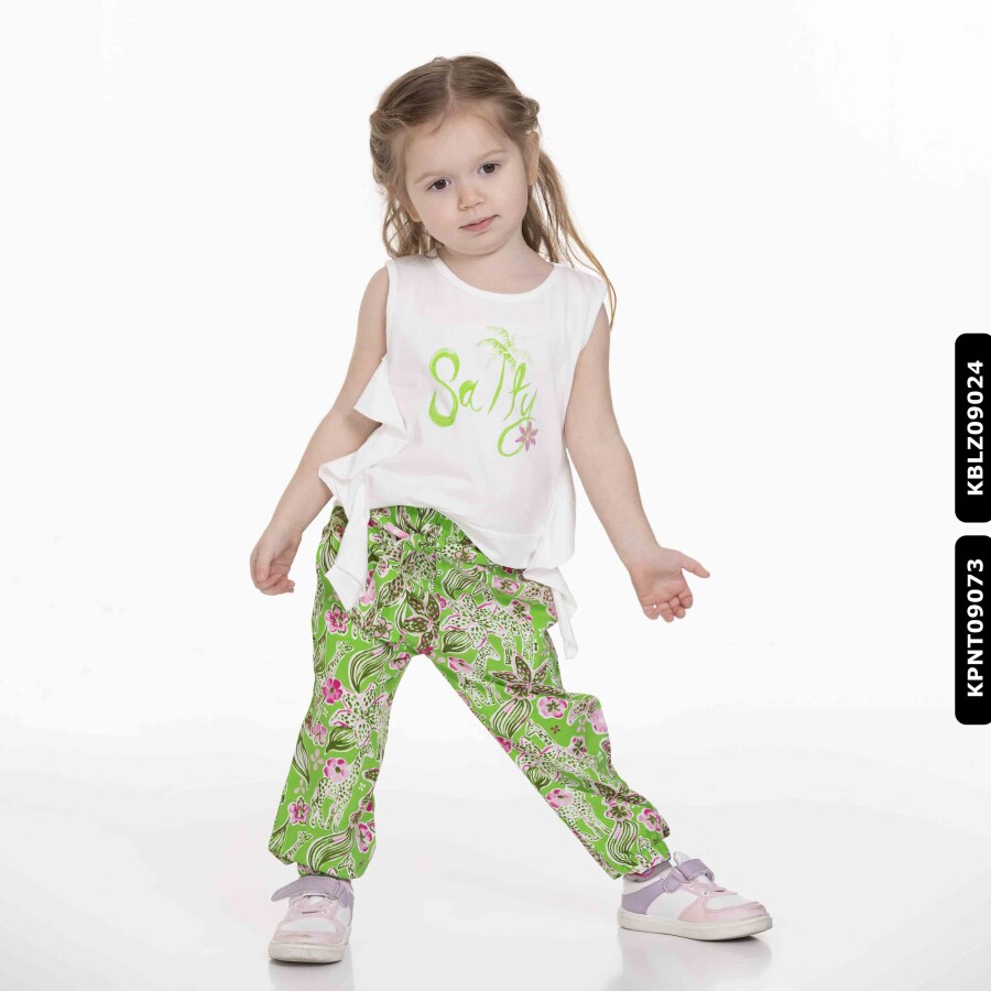 Gelince Haber VerYaz ayları için tasarlanmış bu kız çocuk bluz, ferah ve rahat bir kullanım sunar. Kolsuz yapısı sayesinde sıcak havalarda serin kalmayı sağlar. Ön yüzünde yeşil "Salty" yazısı ve küçük palmiyelerle süslenmiş şık bir baskı bulunur. Yanlarda hareket özgürlüğü sağlayan fırfır detayları ile şıklığı artırır. Canlı yeşil ve pembe renklerin hakim olduğu, desenli bol paça pantolonla kombinlenerek enerjik ve neşeli bir görünüm yaratır.