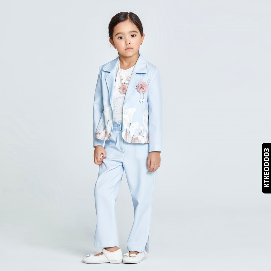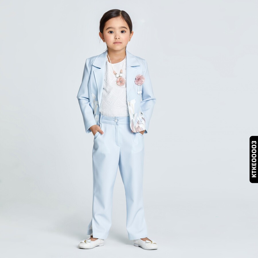 Bu zarif kız çocuk takımında, hafif mavi tonları ve floral desenler ön plana çıkıyor. Ceket uzun kollu ve düğmeli, yakası klasik kesimli. Alt kısmında zarif beyaz çiçek baskıları bulunuyor. Takımın pantolonu, rahat kesim ve düz paça yapısıyla konfor sunarken, klasik kesimli ve belden düğmeli. Üstünde kullanılan beyaz dantel detaylı bluz ise takımın şıklığını tamamlıyor. Günlük ve özel davetlerde kullanıma uygun, modern ve şık bir seçenek.