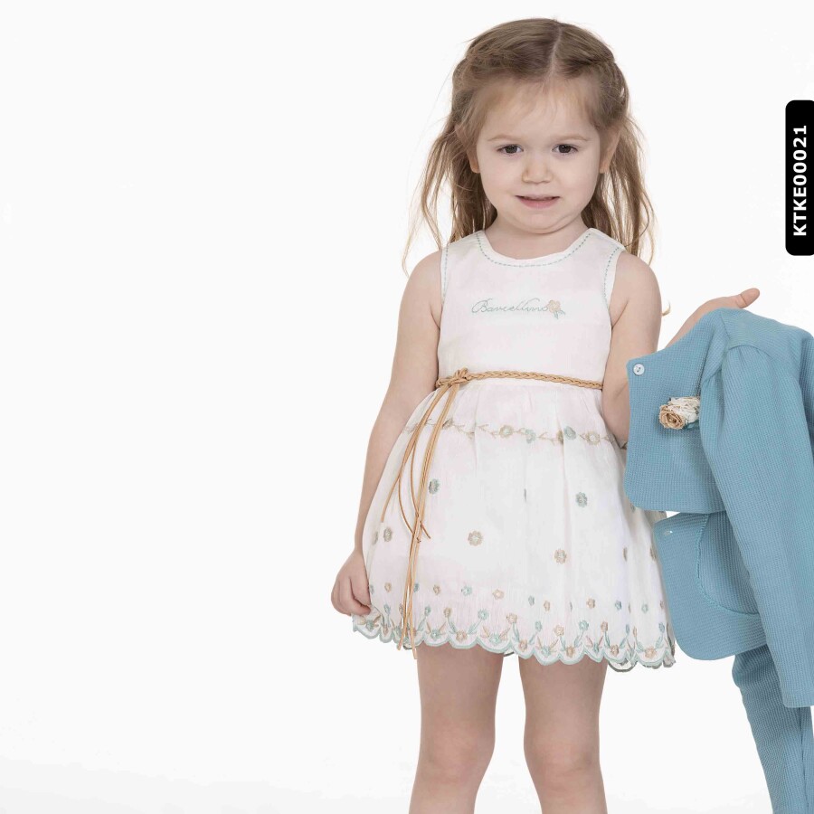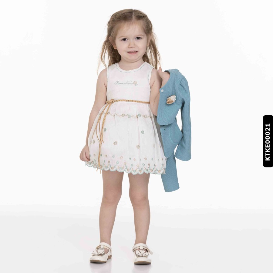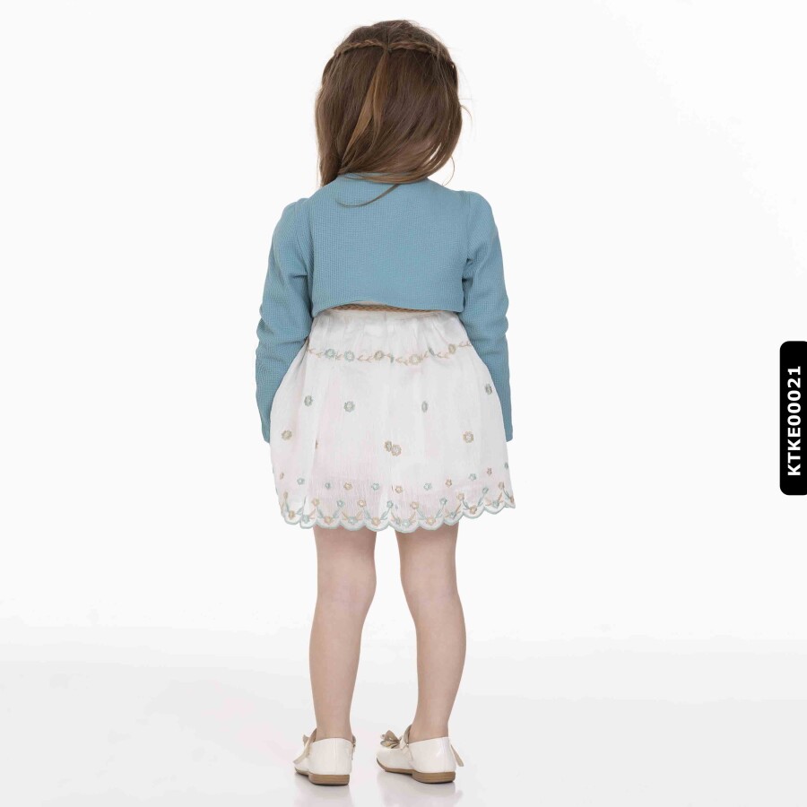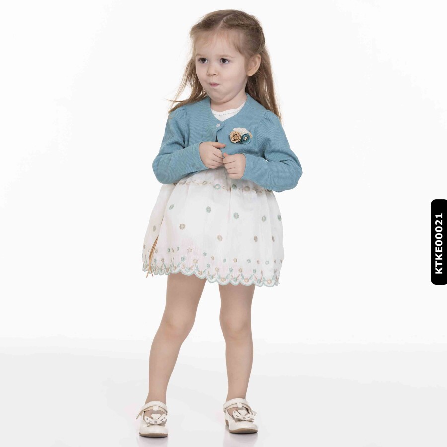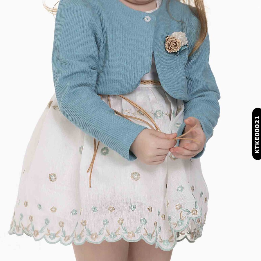 Bu kız çocuk alt üst takımı zarif ve şık bir yaz kombinidir. Üst kısmı ince, uzun kollu ve bisiklet yaka özelliklerine sahip mavi bir hırkadan oluşur. Hırkanın önünde küçük düğmeler bulunur ve göğüs kısmında üç farklı renkte çiçek aksesuarı yer alır. Alt kısım ise beyaz zemin üzerine pastel tonlarda çiçek işlemeleri ile süslenmiş, kısa ve etek uçları dalgalı detaylı bir elbisedir. Elbisenin belinde ince örgülü, kahverengi bir kordon bulunmaktadır. Bu set, yaz ayları için hem rahat hem de özel günlerde kullanılabilecek tarzda hazırlanmıştır.