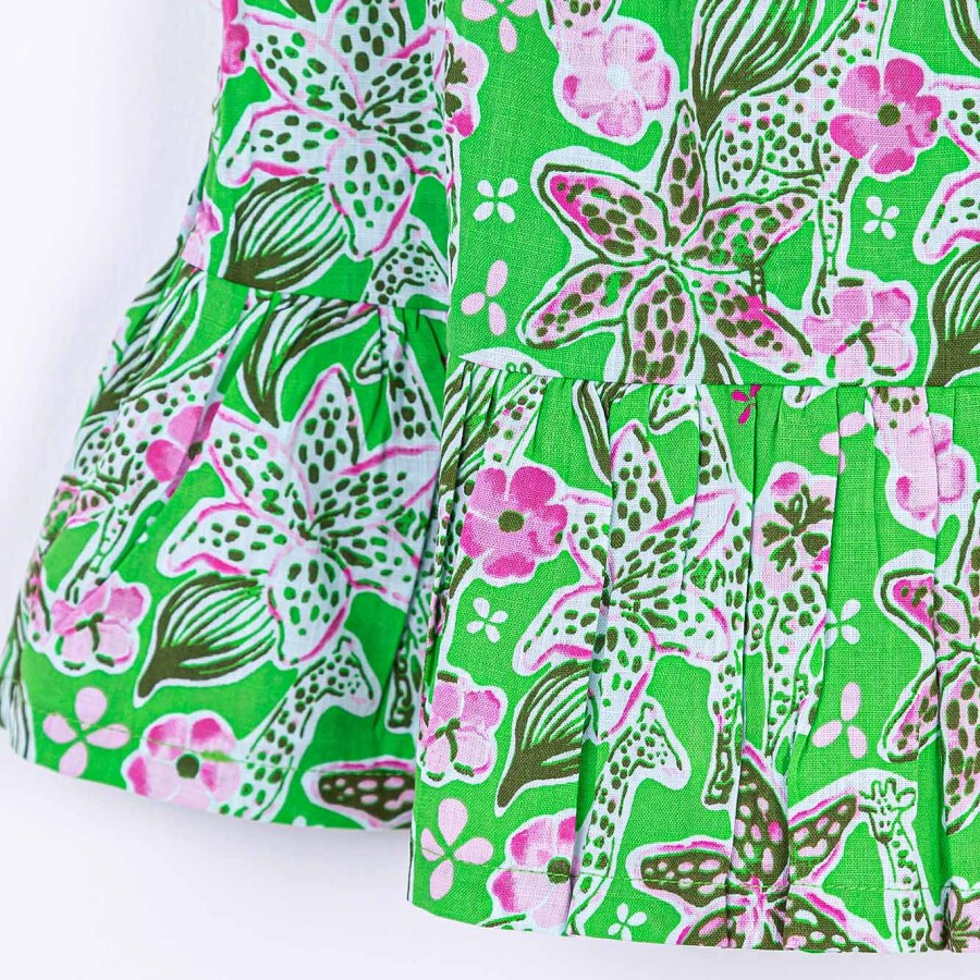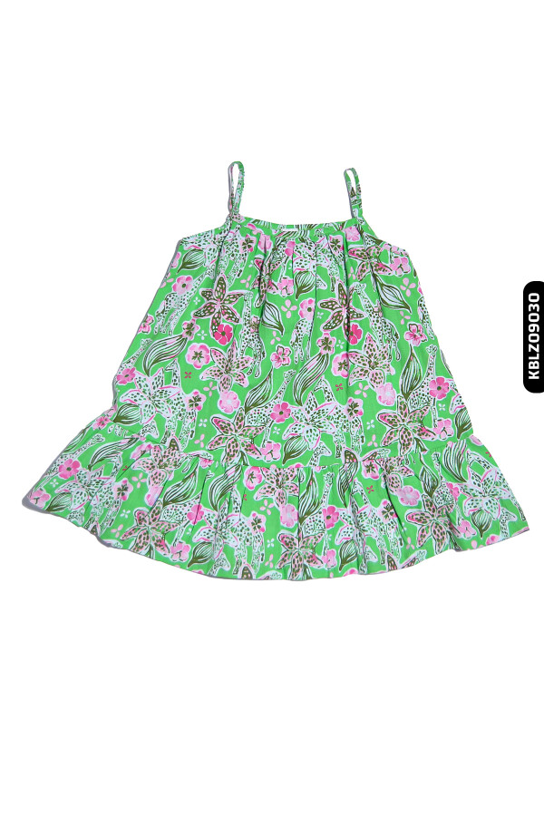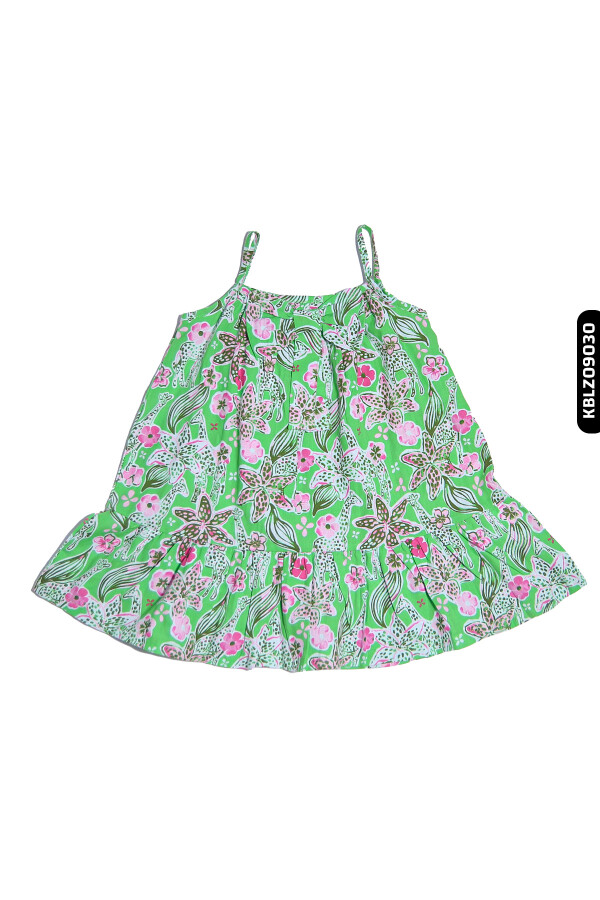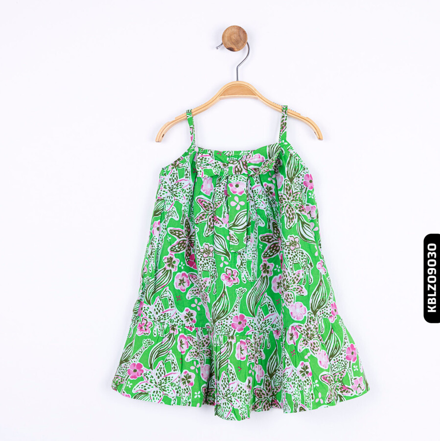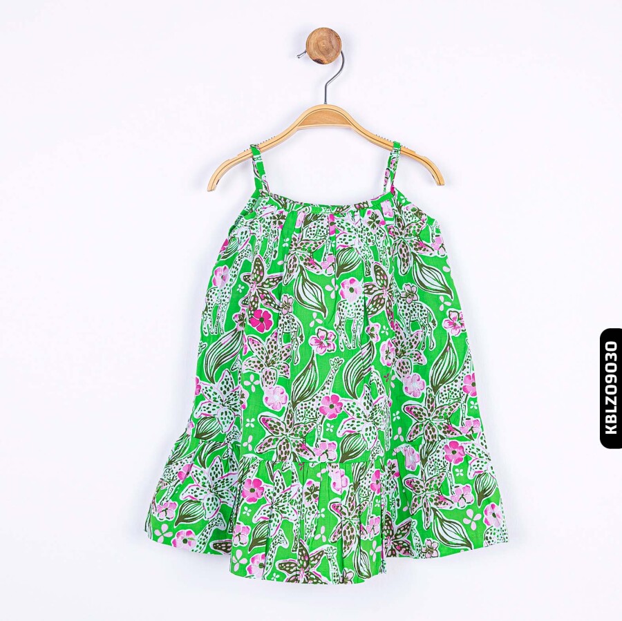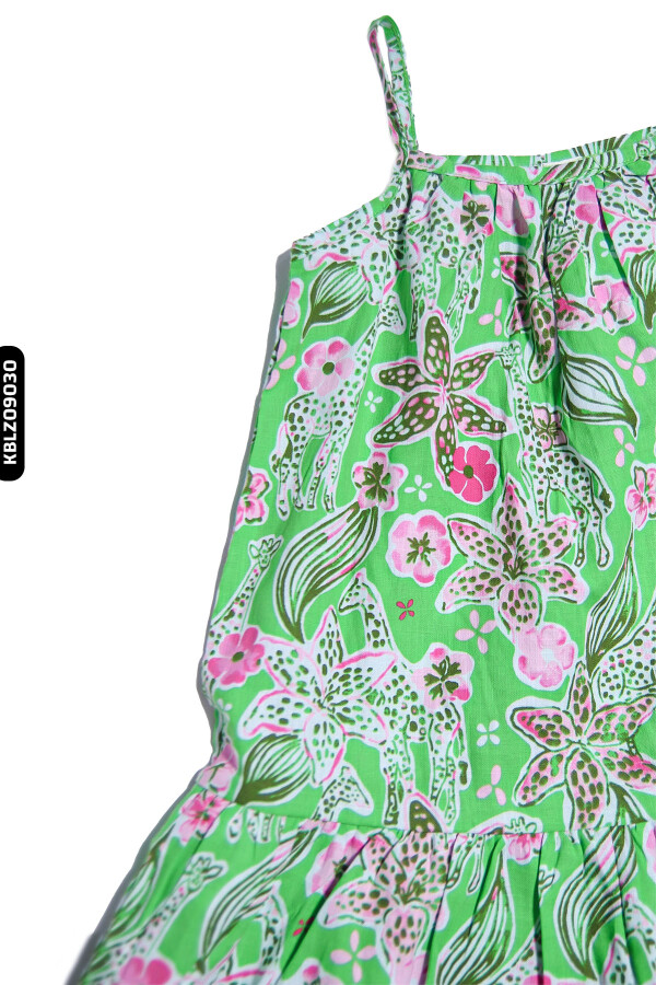 Gelince Haber VerBu kız çocuk bluzu, yaz ayları için ideal hafif ve nefes alabilen bir tasarıma sahiptir. İnce askılı ve sıfır yakalı olan model, ferah ve rahat bir kullanım sunar. Canlı yeşil zemin üzerine pembe ve beyaz çiçek desenleriyle süslenen bluz, neşeli ve enerjik bir görünüme sahiptir. Alt kısmındaki volan detayı, kıyafete hareket katarak şıklık ve rahatlığı bir arada sunar.