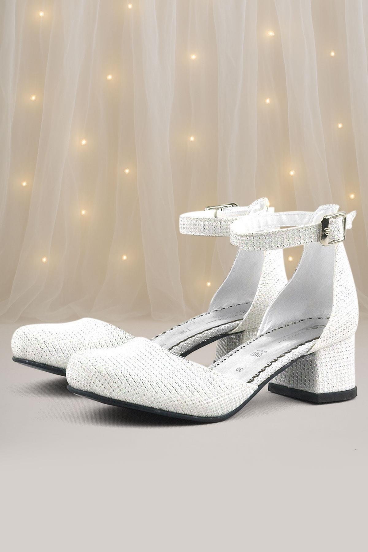 Merida Kırık Beyaz Simli Kalın Topuklu Kız Çocuk Topuklu Ayakkabı
