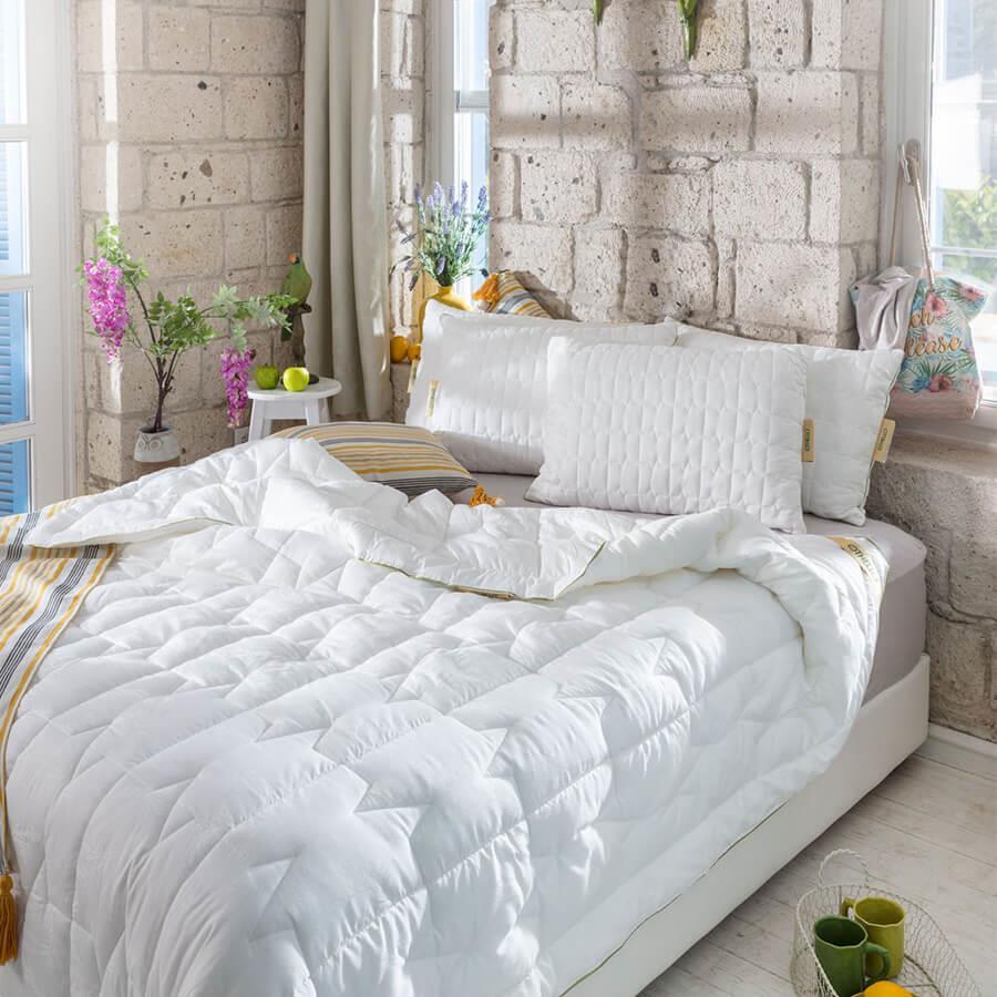 يمتص الخيزران الماء أكثر بثلاث مرات من القطن، ويجف أسرع بأربع مرات. يمكن غسله في درجة حرارة 30 مئوية، ولا يُصدر رائحة، ويسمح للجسم بالتنفس. يُنسج خيط الخيزران، المُستخرج من لب نبات الخيزران وغزله، مع خيوط أخرى مثل القطن. تمنع مادة بامبو-كون الموجودة فيه نمو البكتيريا، ولها خصائص طبيعية مضادة للبكتيريا. تحتوي الحشوة الداخلية على ألياف الخيزران الطبيعية. 70% حشوة من ألياف HCS (سيليكونية مجوفة مترافقة) من الدرجة الأولى، و30% حشوة من الخيزران. يمتص العرق من الجسم فورًا. وهو مادة حشو طبيعية. يمكن غسله في الغسالة على درجة حرارة 30 مئوية.