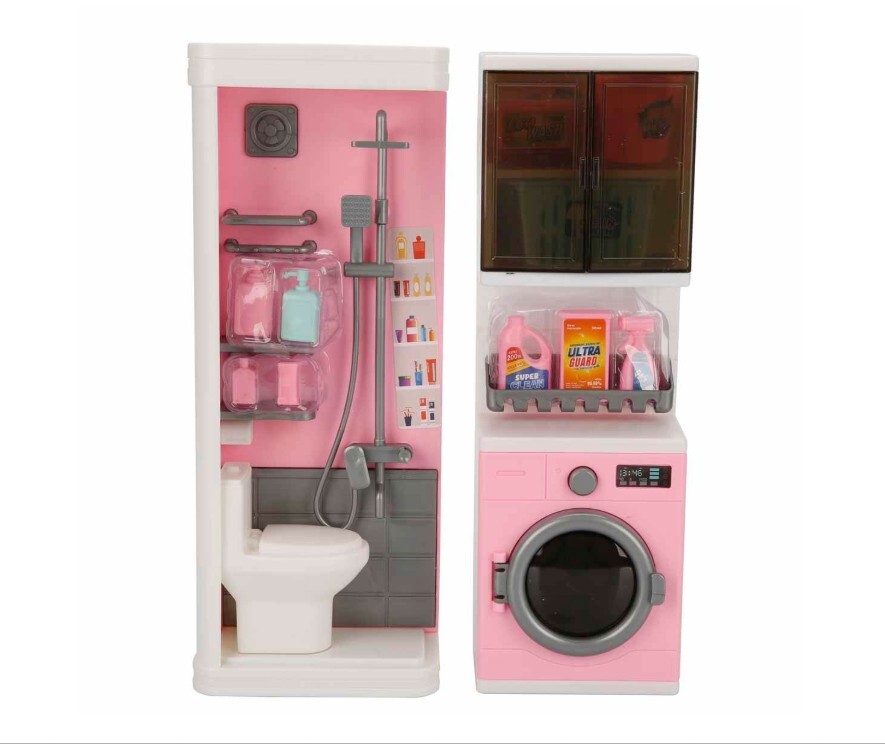 Tüm kirli kıyafetler çamaşır makinesindeki yerini aldı mı? O halde onları tertemiz yapma zamanı geldi, oyun başlasın! Gerçek bir banyonun küçültülmüş hali olan 2’li Banyo ve Çamaşır Makinesi Oyun Seti ile tanış. Duşu, çamaşır makinesi hatta temizlik malzemeleri bile var.