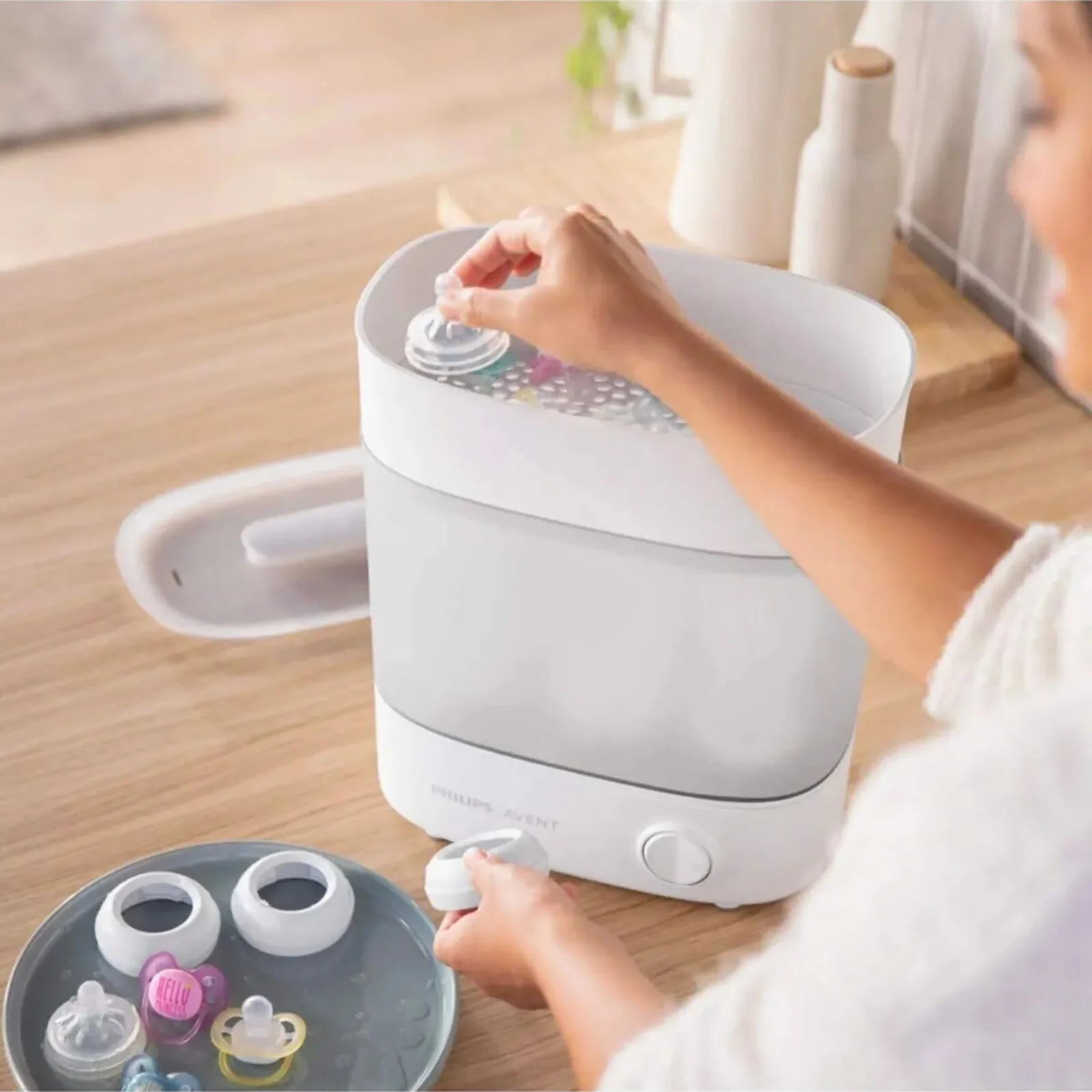 يستخدم الجهاز البخار الطبيعي لتعقيم الزجاجات وغيرها من المنتجات، ويقضي على 99.9% من الجراثيم الضارة دون استخدام مواد كيميائية.