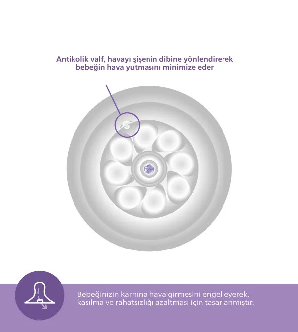 Anti-kolik teknolojisi Bebeğinizin karnına hava girmesini engelleyerek, kasılma ve rahatsızlığı azaltması için tasarlanmıştır.