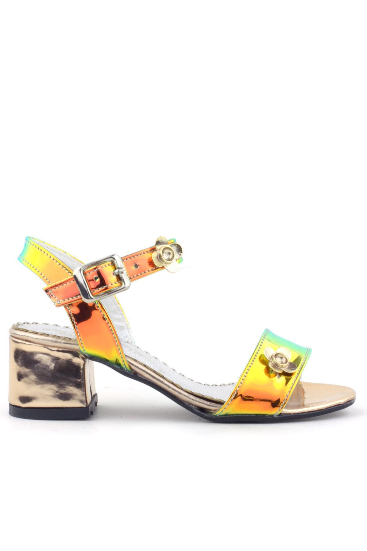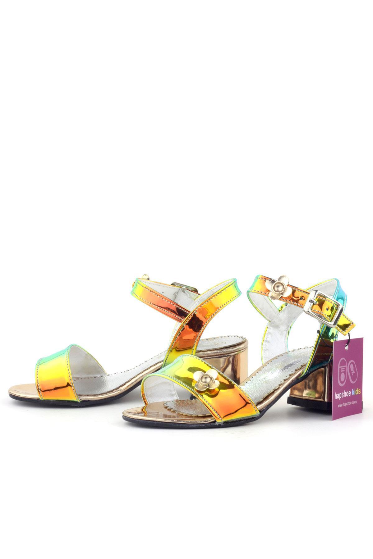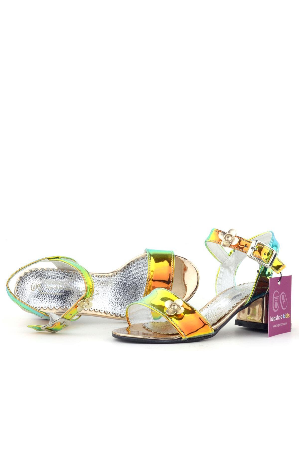 Pony Hologram Bakır Yeşil Kalın Topuklu Çiçek Detaylı Kız Çocuk Abiye Ayakkabı