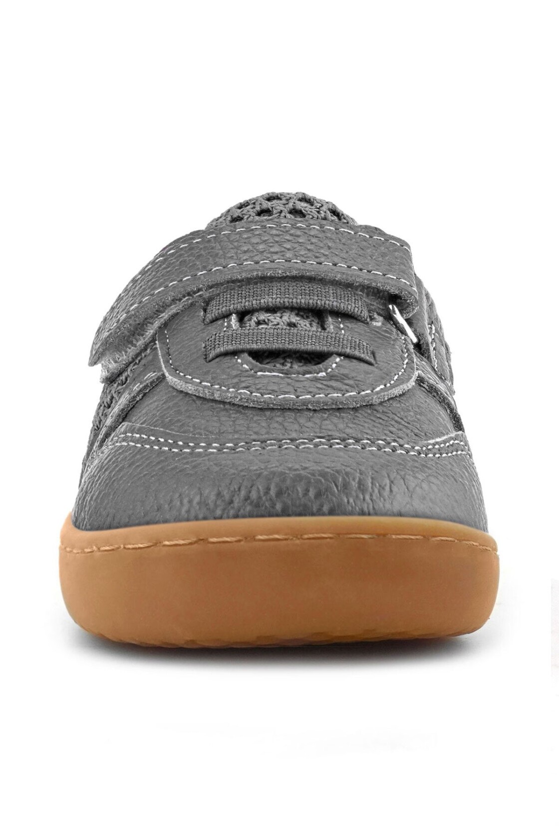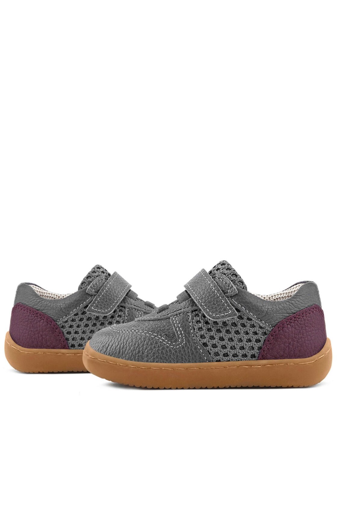 Tam esnek termo tabanı, bebeklerin adım atarken zemini doğru şekilde hissetmesini sağlar; böylece ayak hareketleri doğal ve özgür olur. Özel kaymaz taban tasarımı, iç ve dış tüm zeminlerde yüksek güvenlik sunar. Gri ve bordo renklerinin modern ve dengeli uyumu, ayakkabıya sportif ve şık bir görünüm kazandırır. Günlük kullanım için ideal olan bu barefoot bebek sneaker modeli, yürümeye yeni başlayan çocuklar için hem estetik hem de işlevsel bir tercihtir. Doğru ayak gelişimini desteklemek isteyen ebeveynler için güvenilir ve sağlıklı bir seçenek sunar.