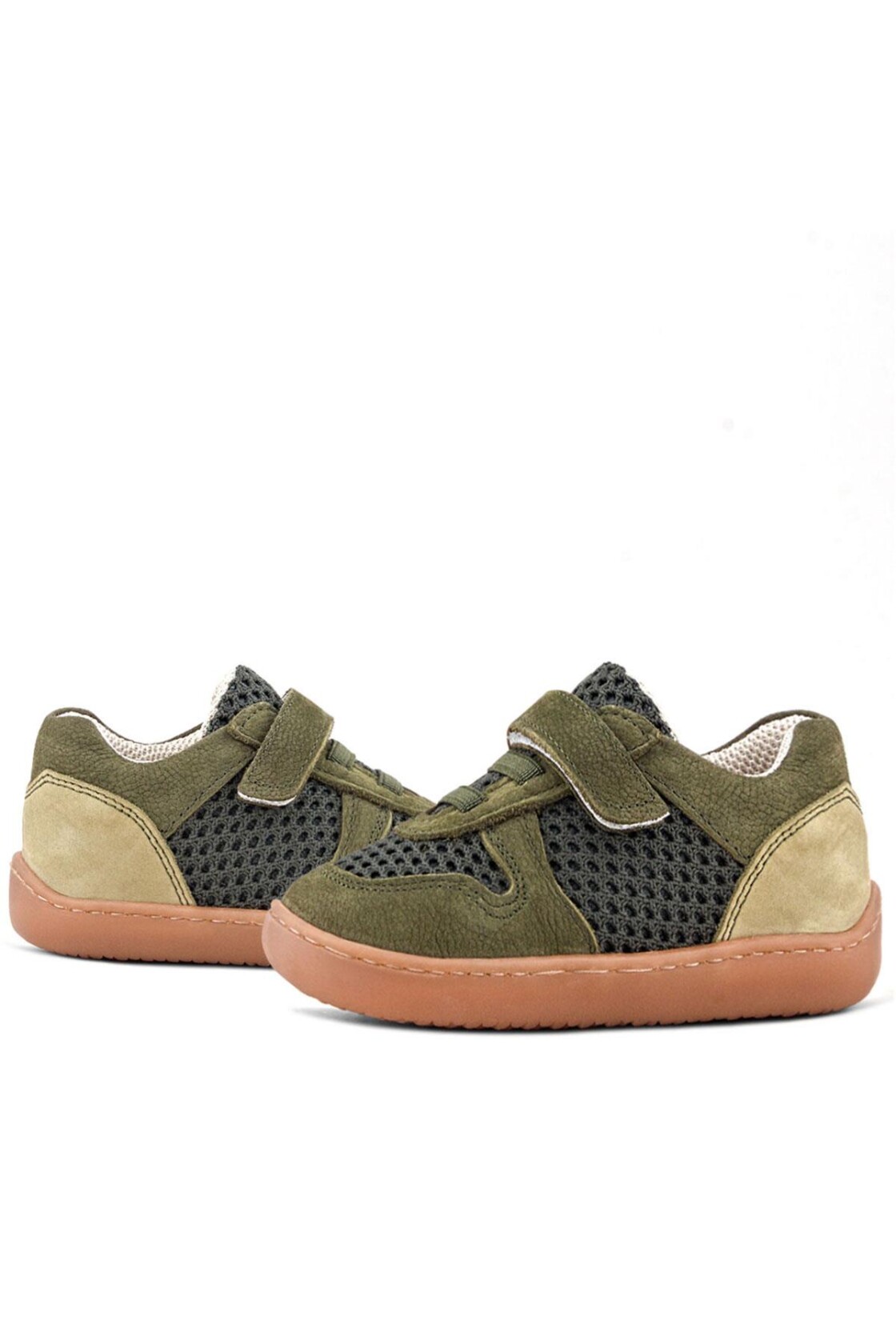 Tam esnek termo tabanı, bebeklerin adım atarken zemini doğru şekilde hissetmesini sağlar; böylece ayak kasları doğal olarak çalışır ve gelişir. Özel kaymaz taban tasarımı, iç ve dış mekânda yüksek güvenlik ve denge sunar. Haki ve yeşil renklerin modern, doğal ve enerjik birleşimi, ayakkabıya hem şık hem sportif bir görünüm kazandırır. Günlük kullanım için ideal olan bu barefoot bebek sneaker, yürümeye yeni başlayan çocuklar için sağlıklı, konforlu ve estetik bir tercihtir. Doğru ayak gelişimini desteklemek isteyen ebeveynler için güvenilir bir seçimdir.