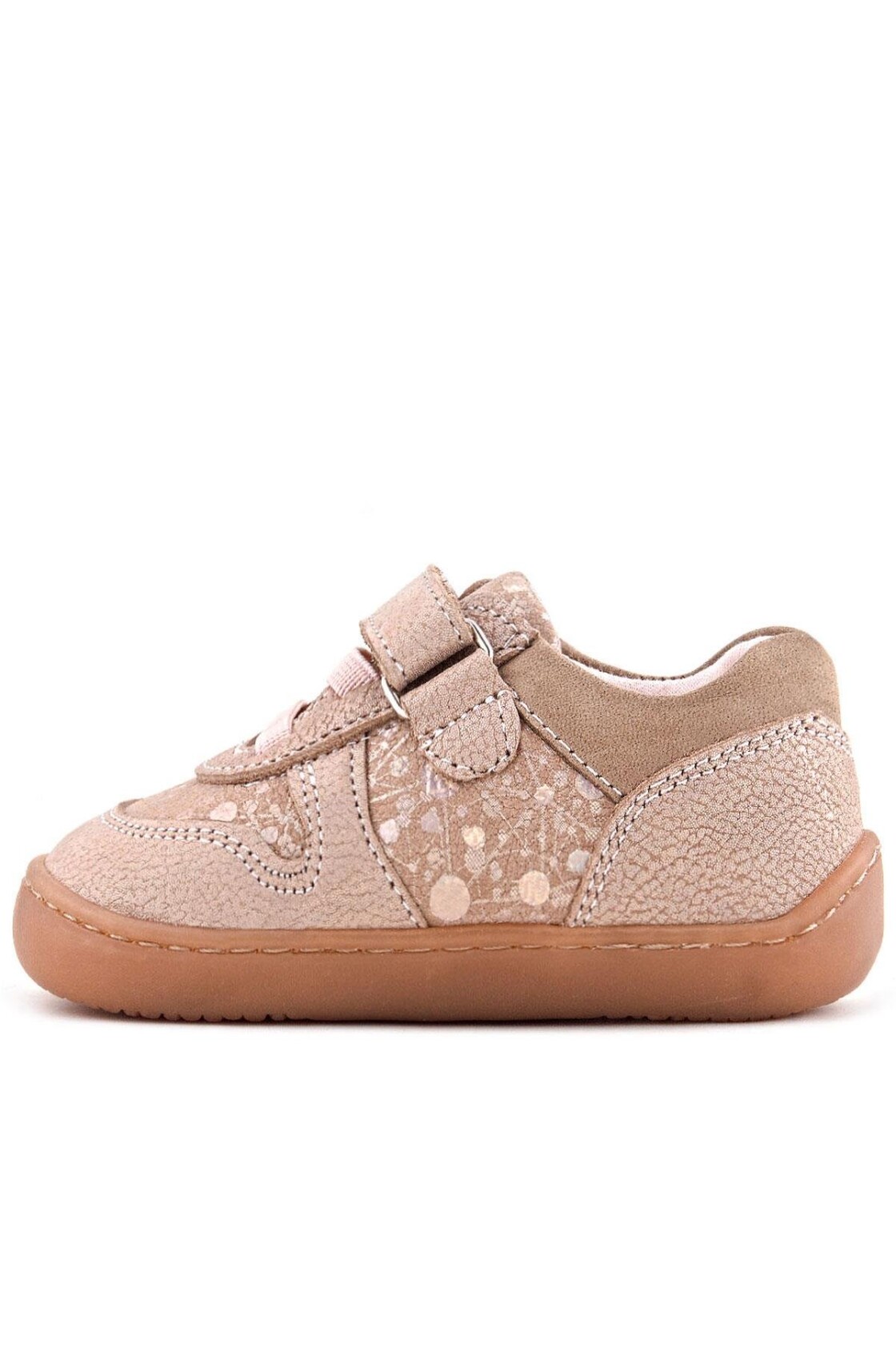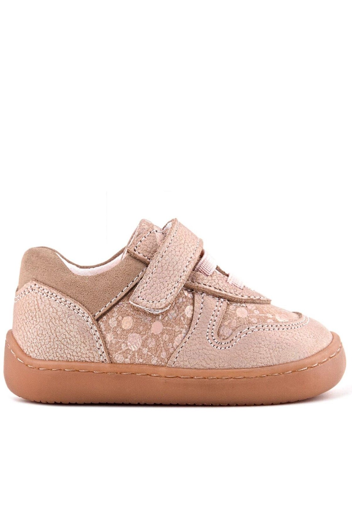 Rakerplus Bob Hakiki Deri Pudra Simli Barefoot Cırtlı Lastikli Bebek Sneaker Ayakkabı, bebeklerin ilk adımlarında maksimum konfor ve doğal gelişimi desteklemek amacıyla tasarlanmış premium bir ilk adım ayakkabısı modelidir. Barefoot (yalınayak) taban teknolojisi sayesinde, minik ayakları doğal duruş pozisyonunda destekleyerek hem kas hem de denge gelişimini teşvik eder. Bu özel yapı, yürümeye yeni başlayan bebekler için ideal bir başlangıç sunar.