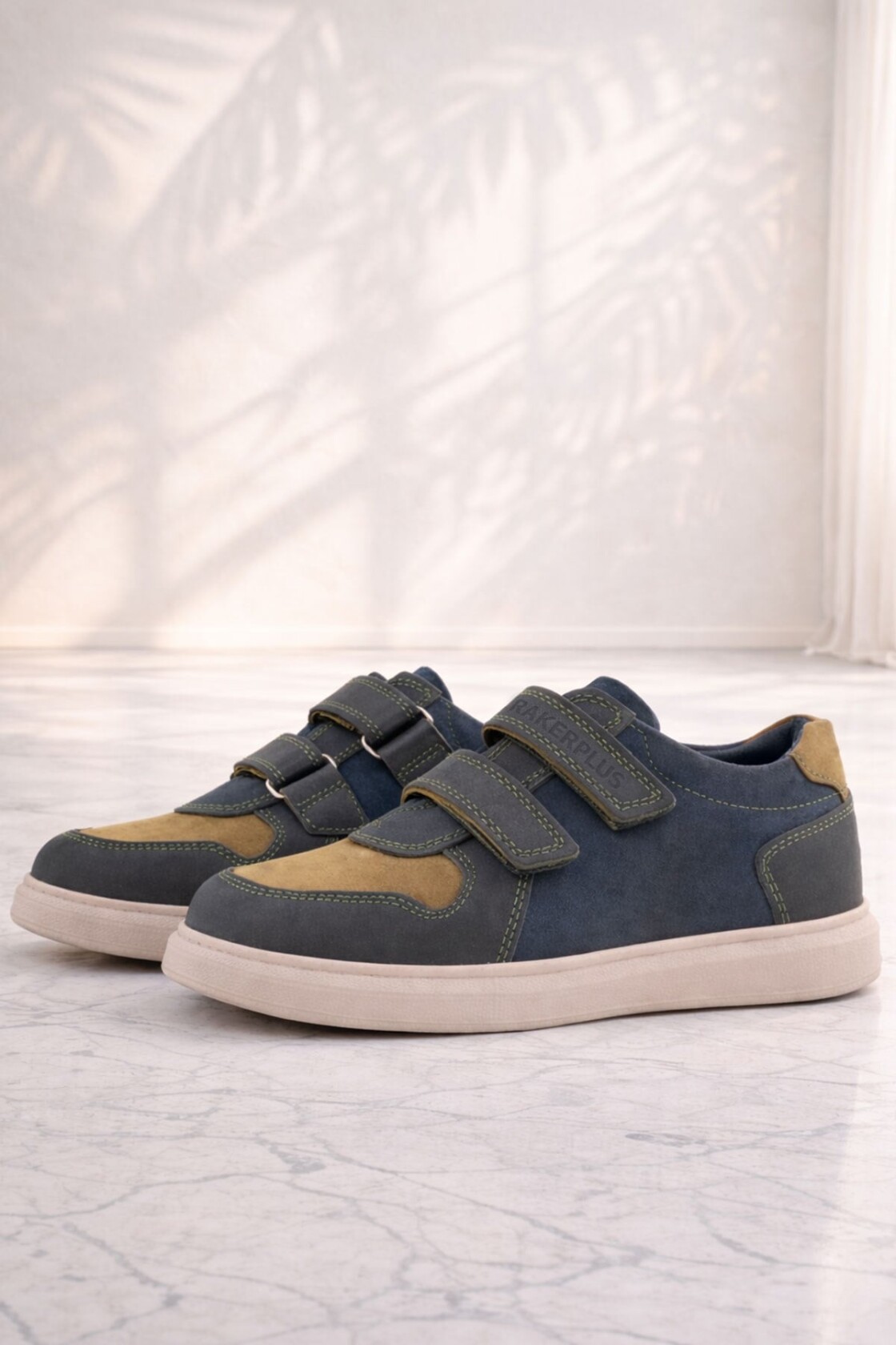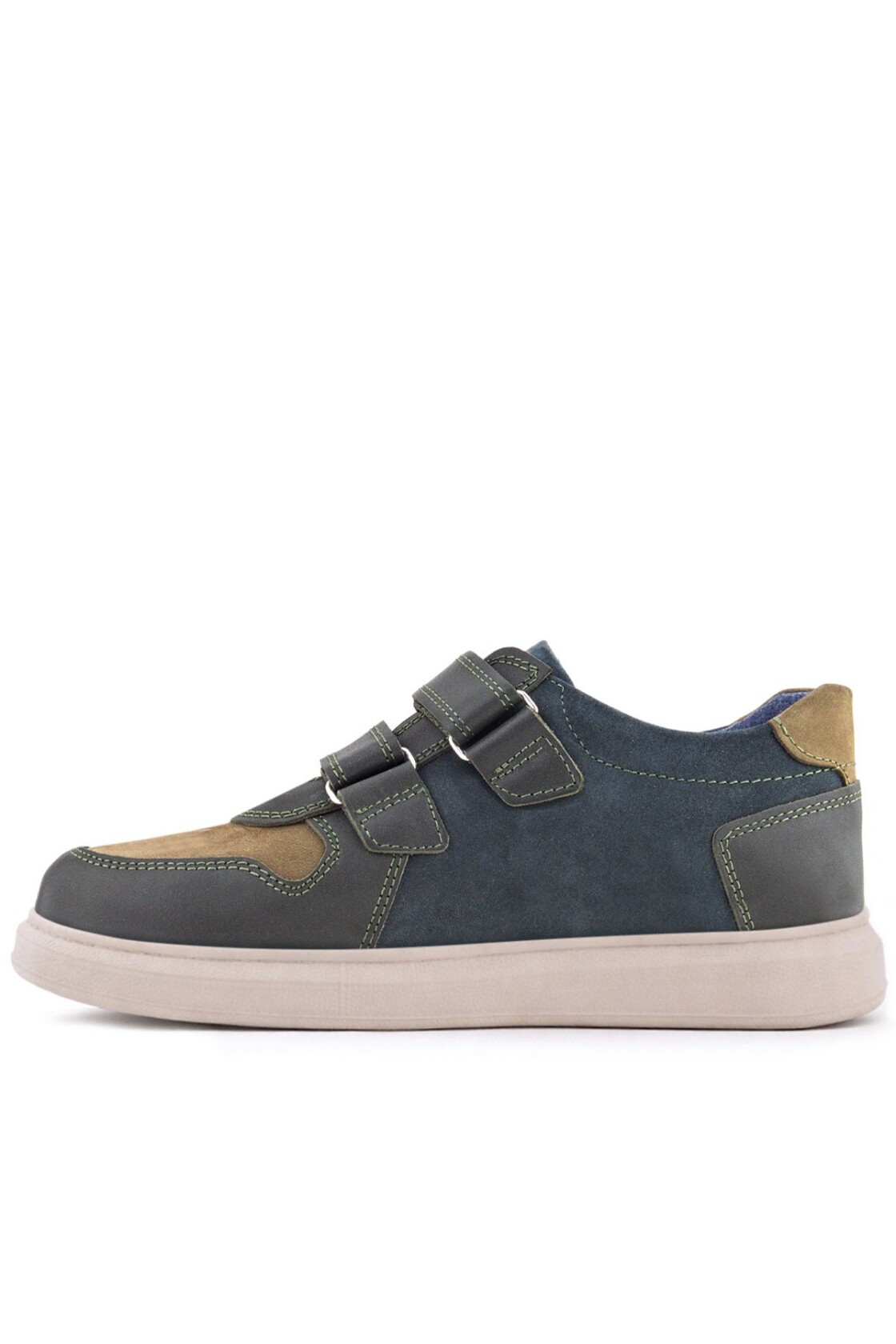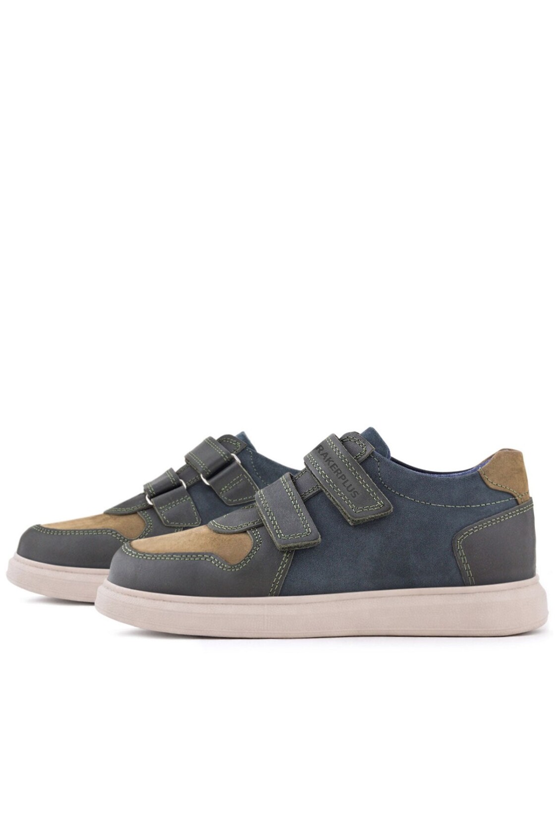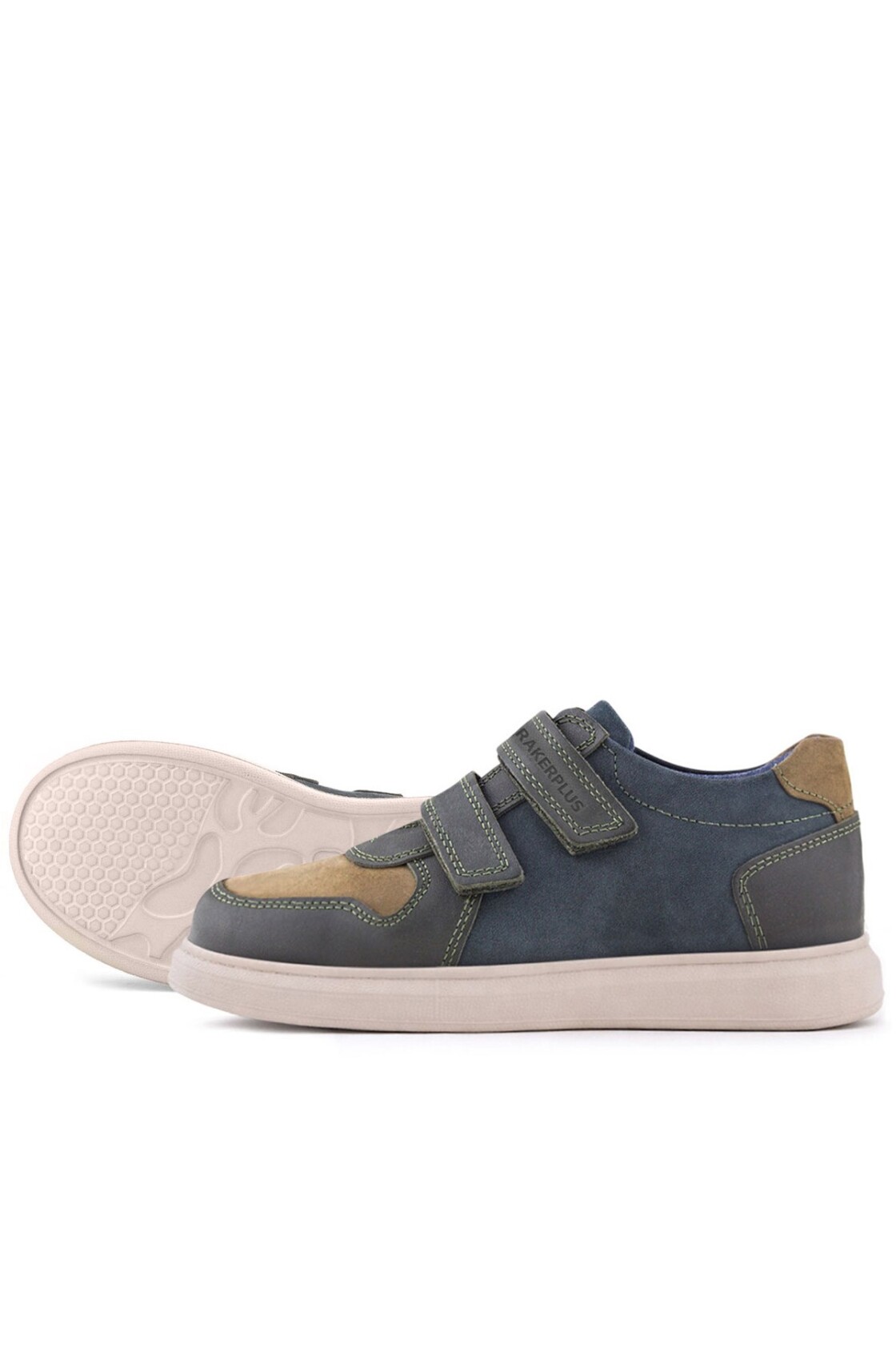 Rakerplus Hakiki Deri Haki Yeşil Lacivert Cırtlı Hafif Tabanlı Erkek Çocuk Spor Ayakkabı