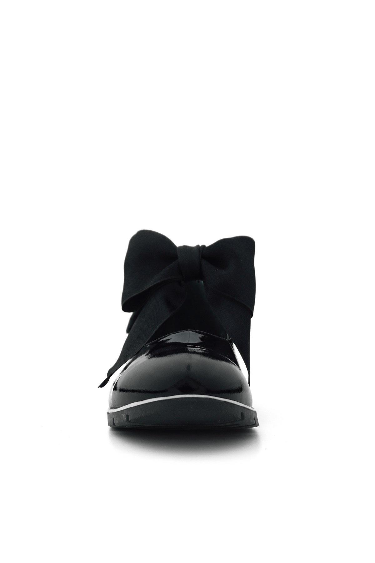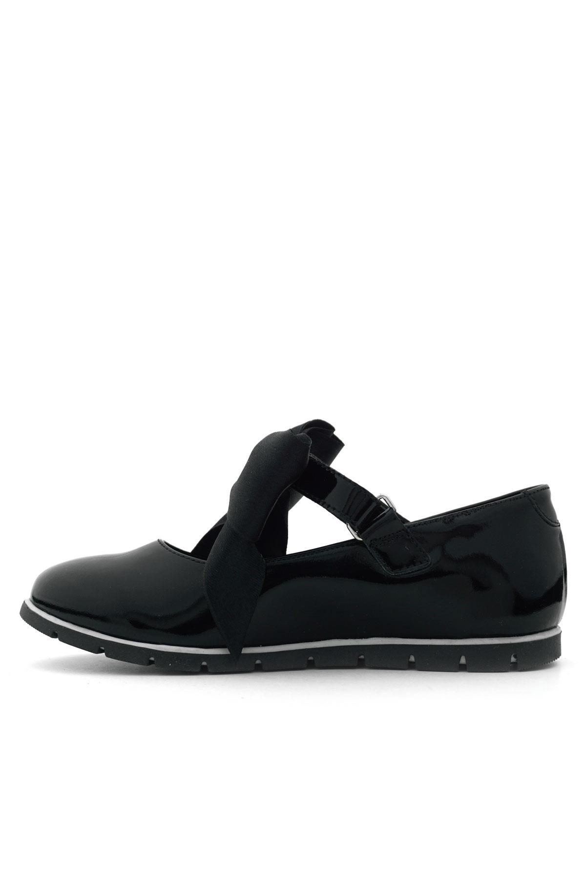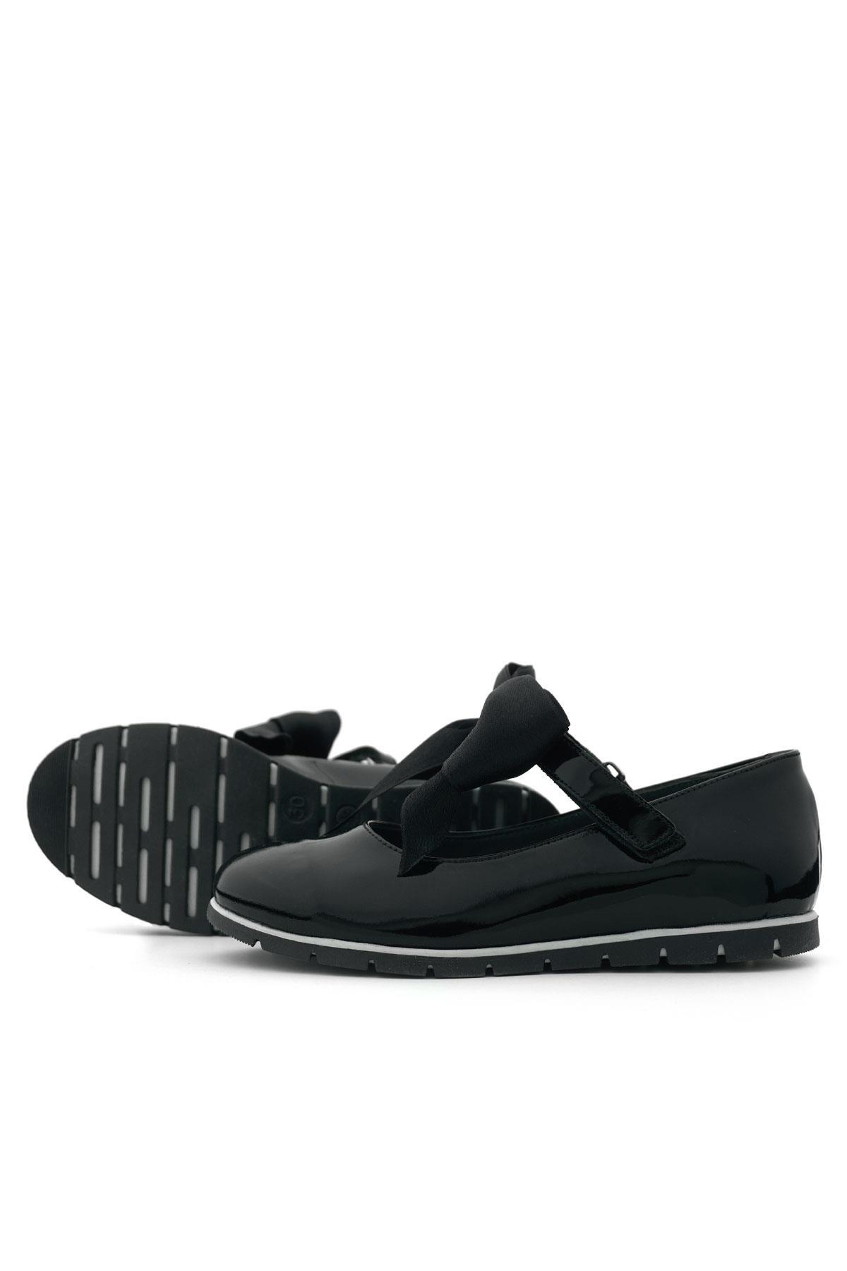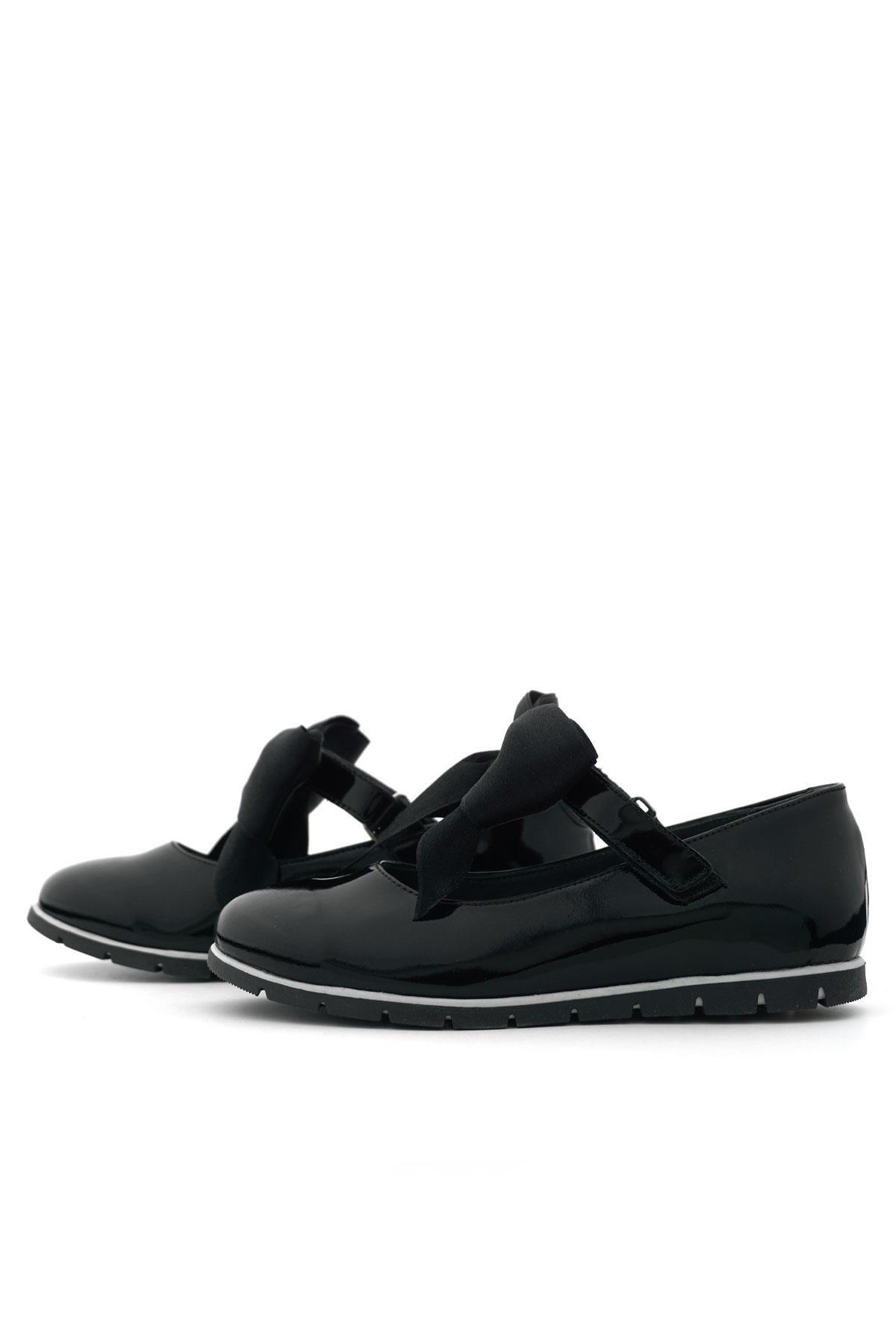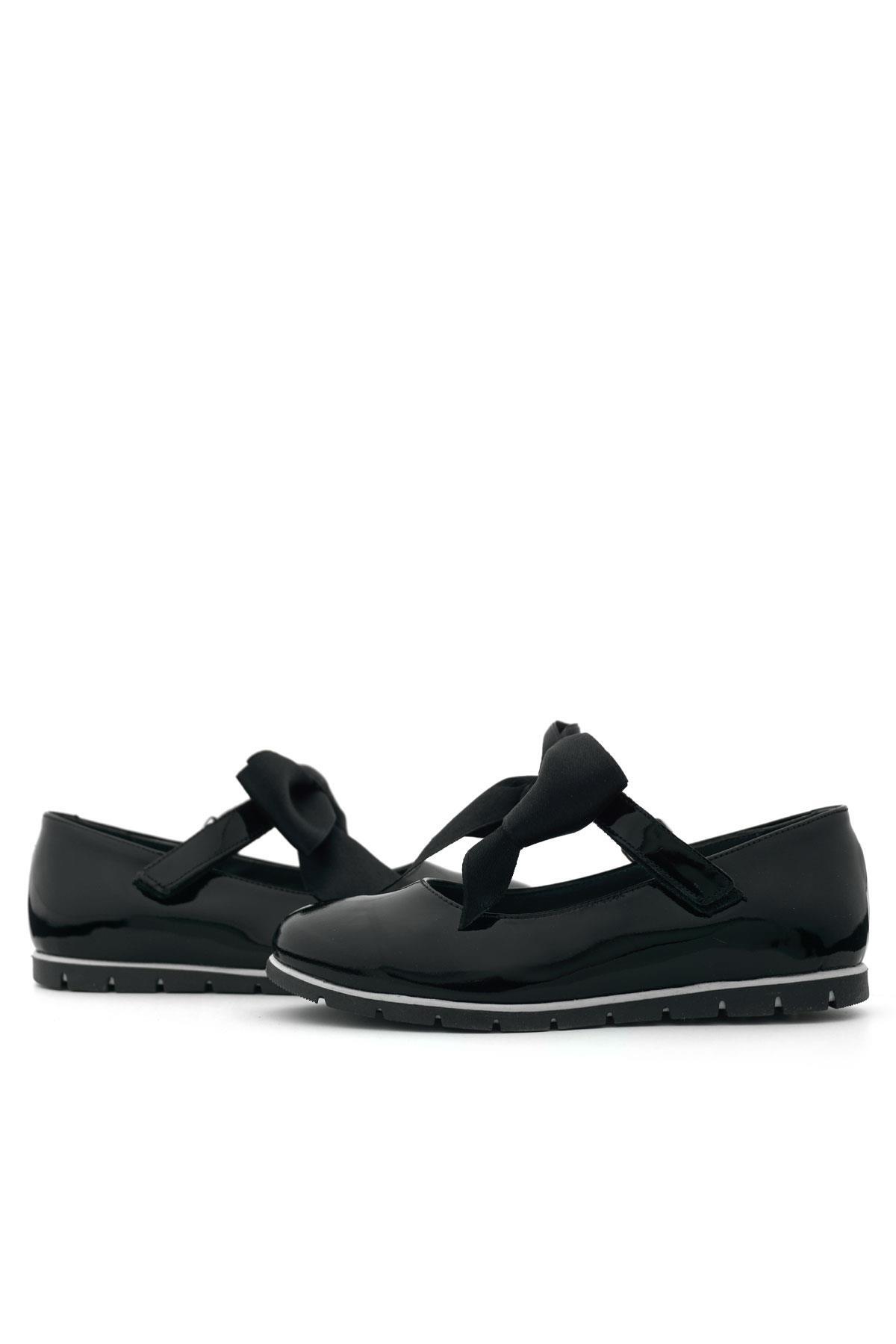 حذاء باليه للبنات من راكر بلاس مصنوع من الجلد الطبيعي باللون الأسود اللامع ومزين بشرائط سوداء