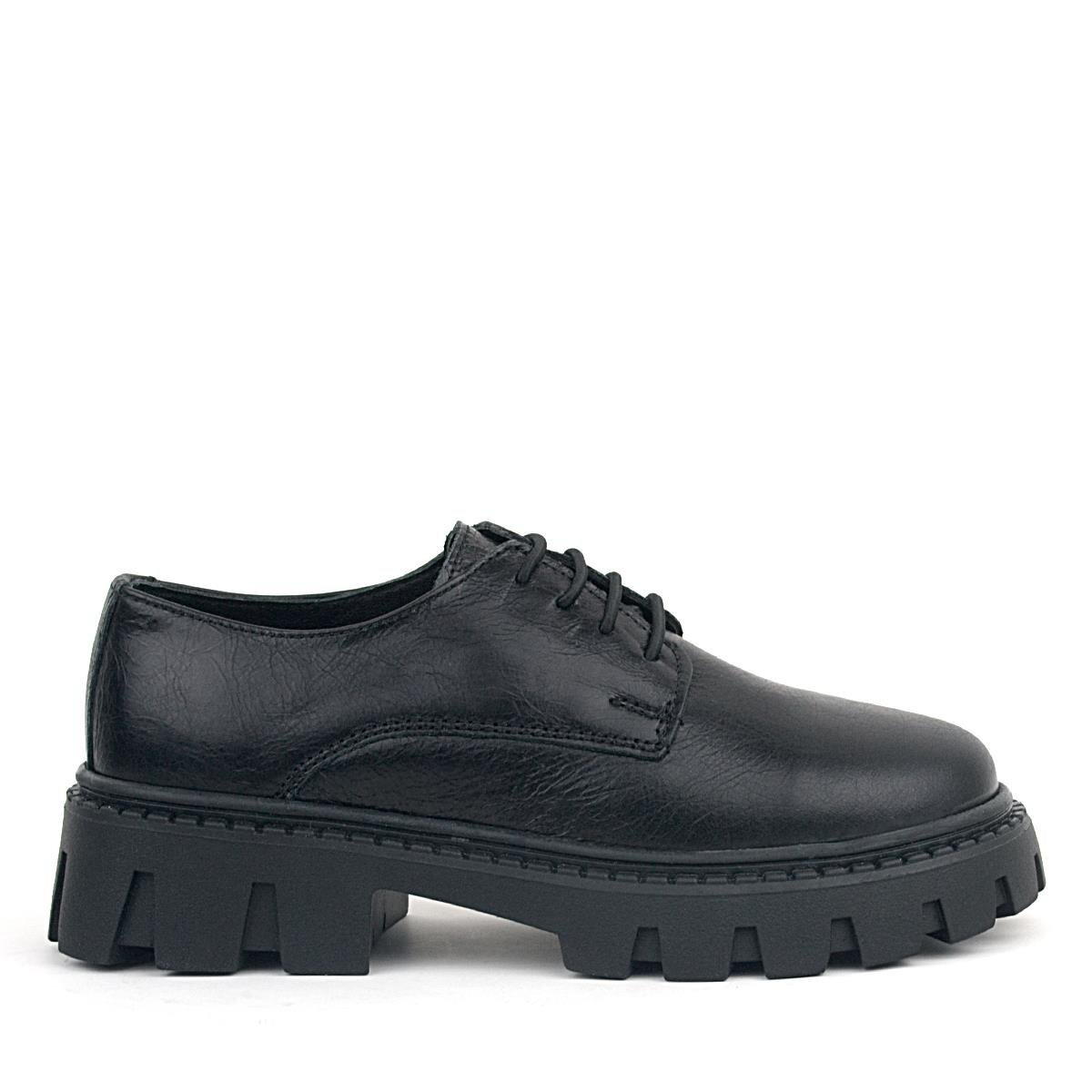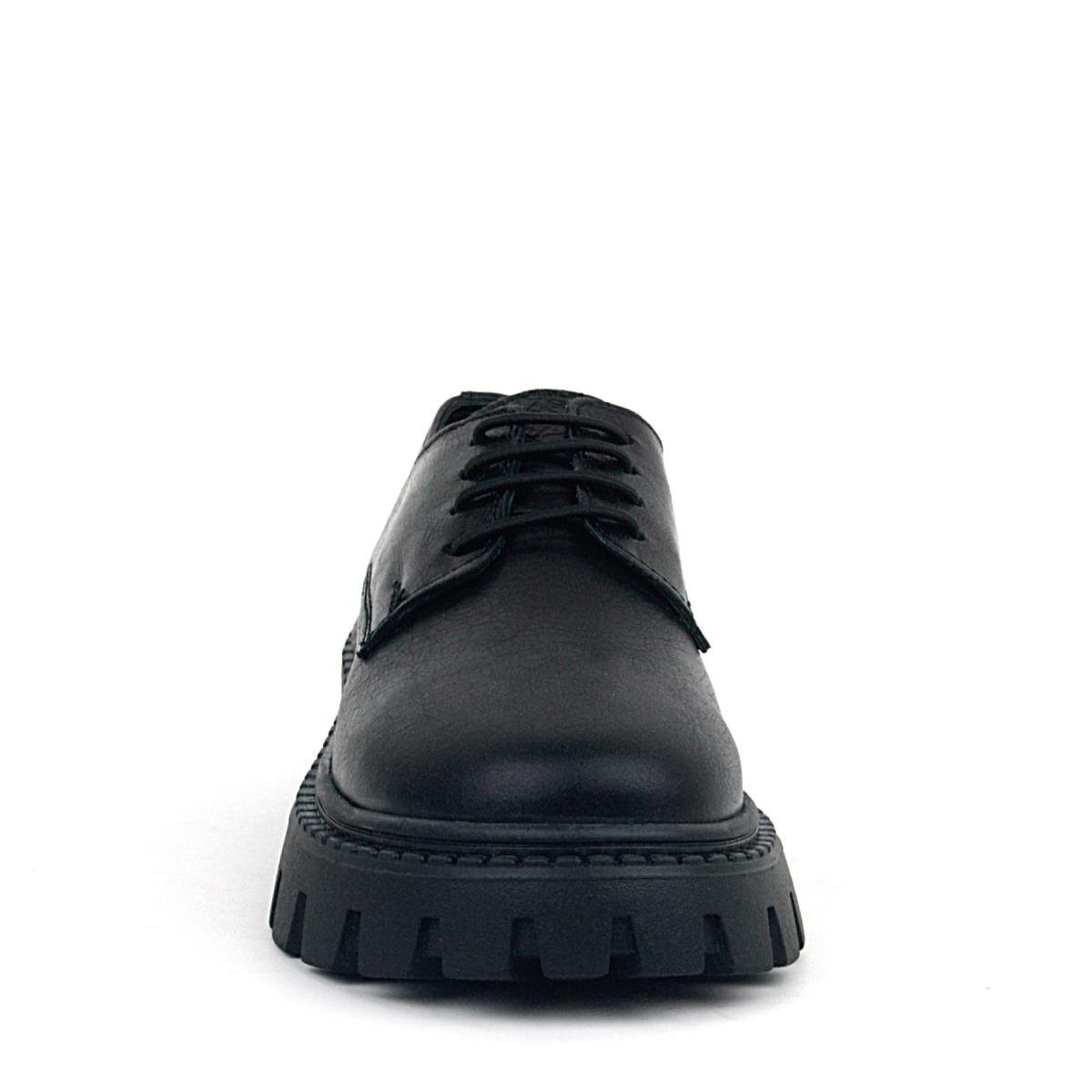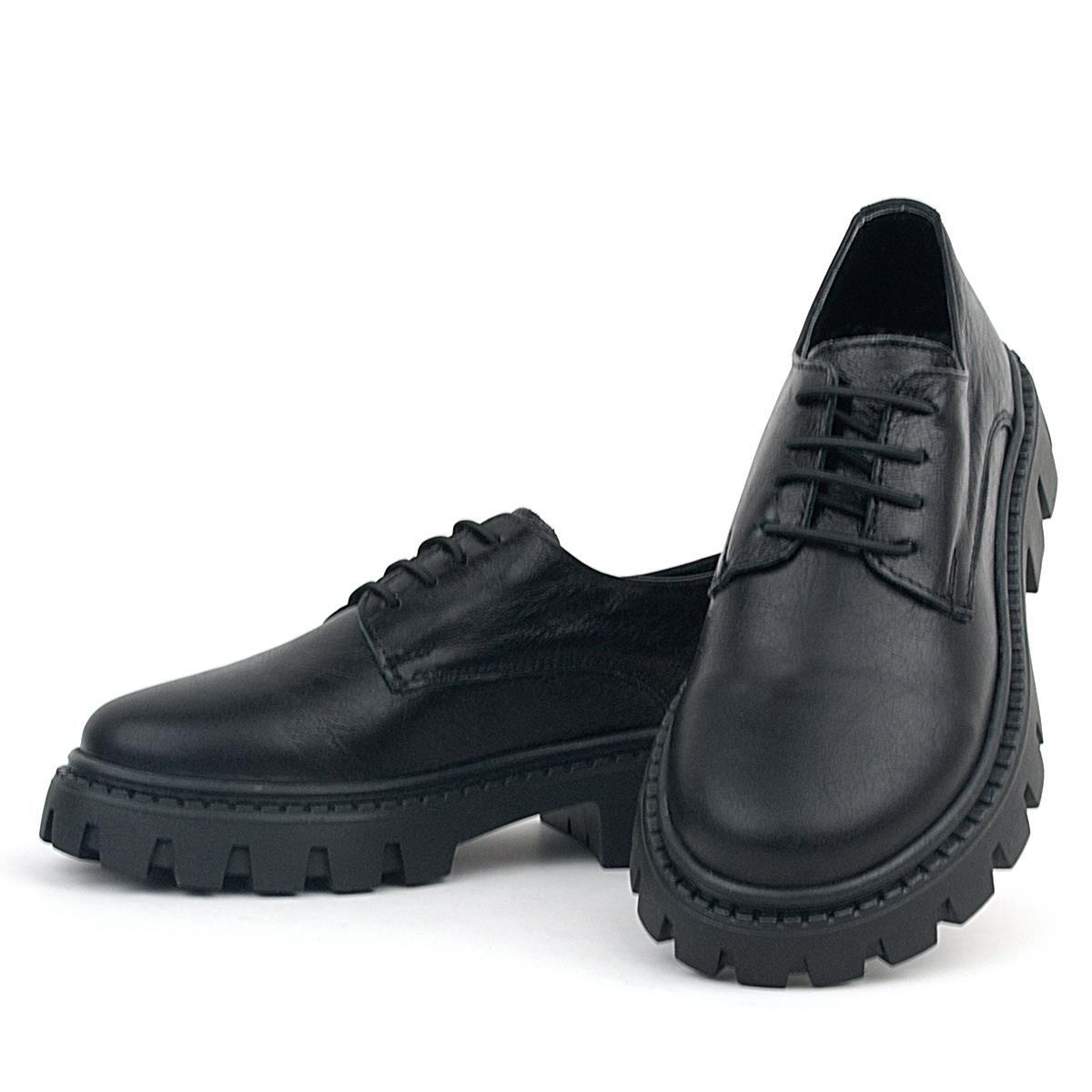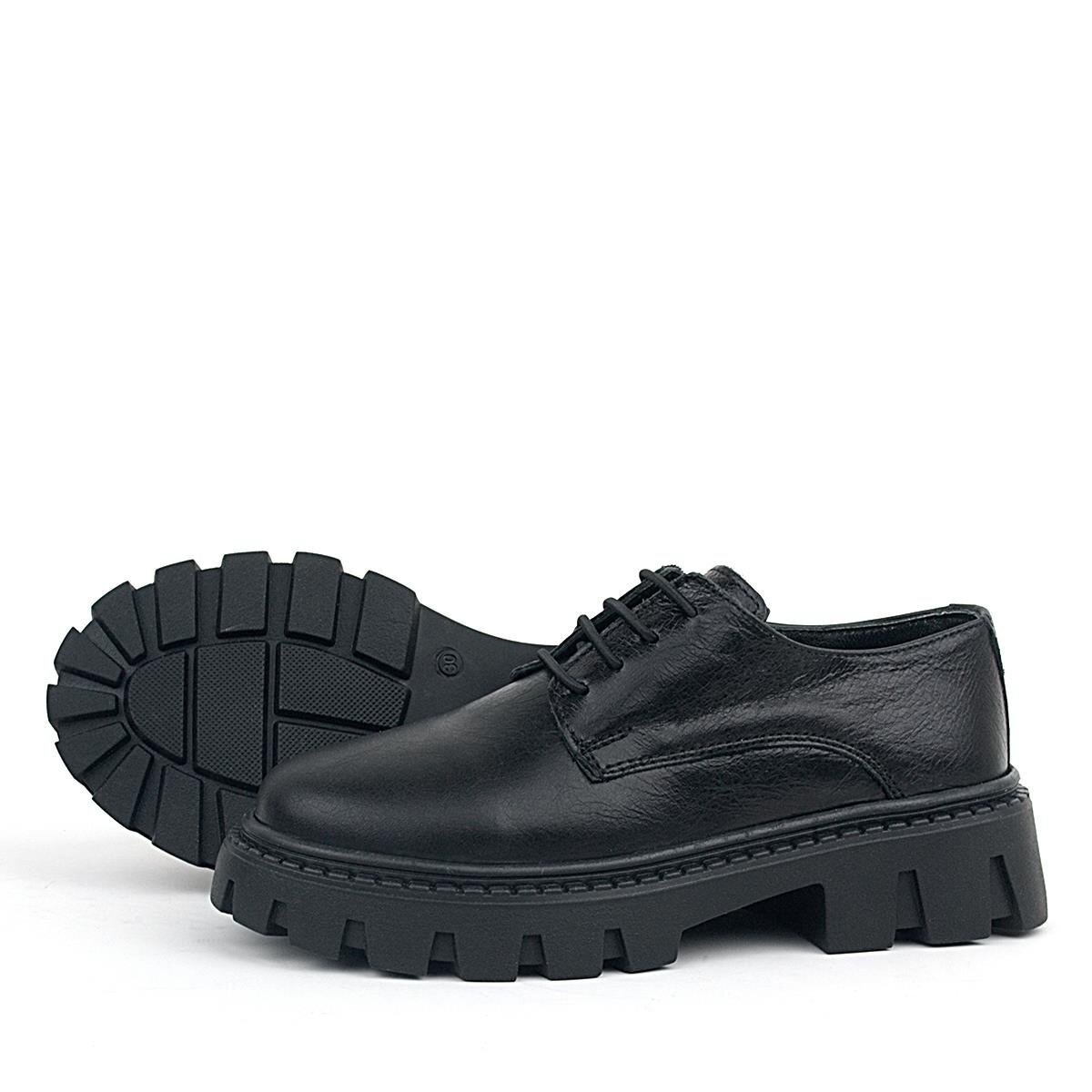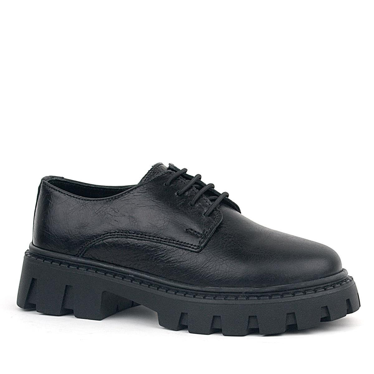 Rakerplus Siyah Kırışık Rugan Hakiki Deri Bağcıklı Kız Çocuk Oxford Okul Ayakkabı