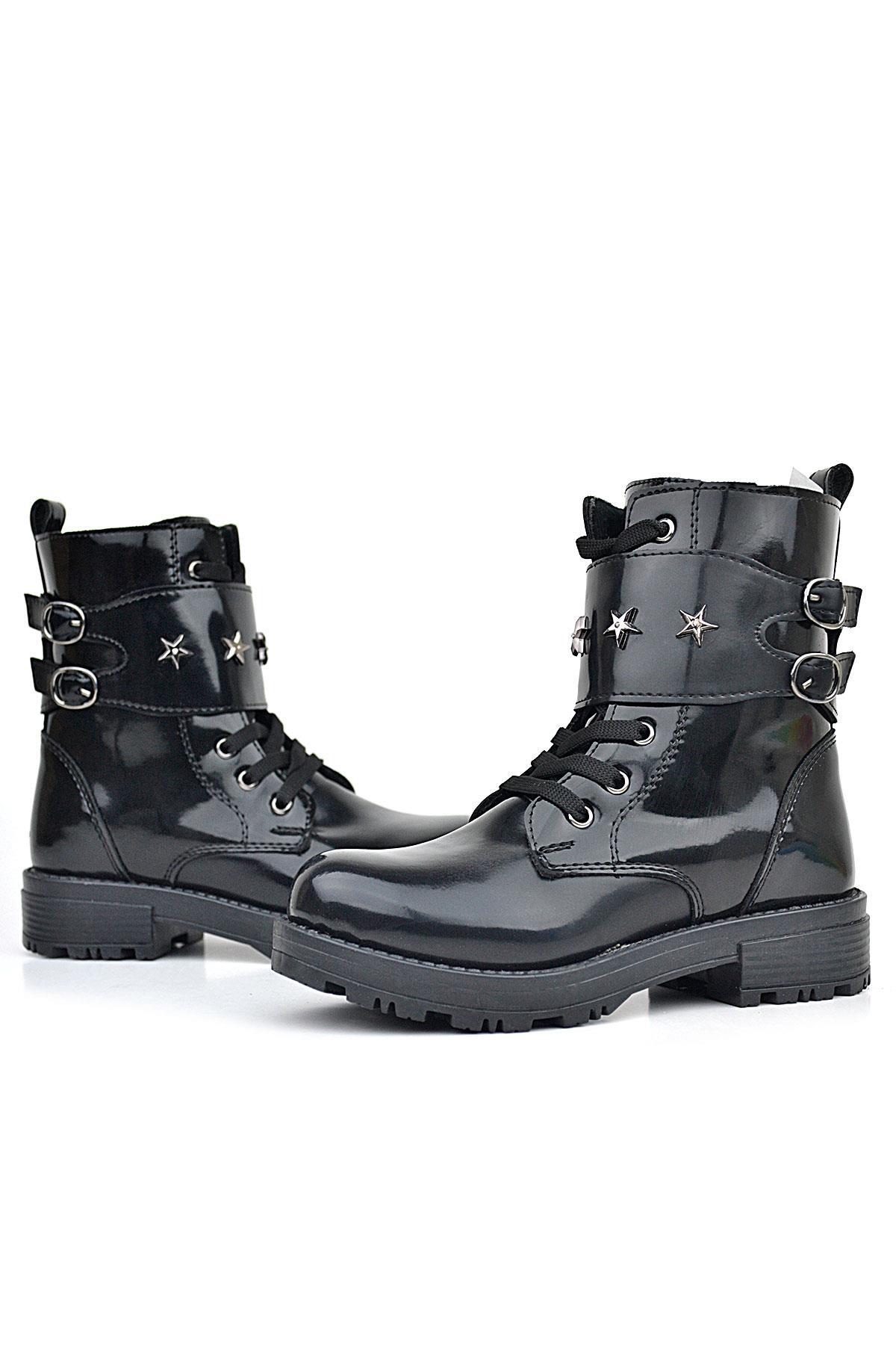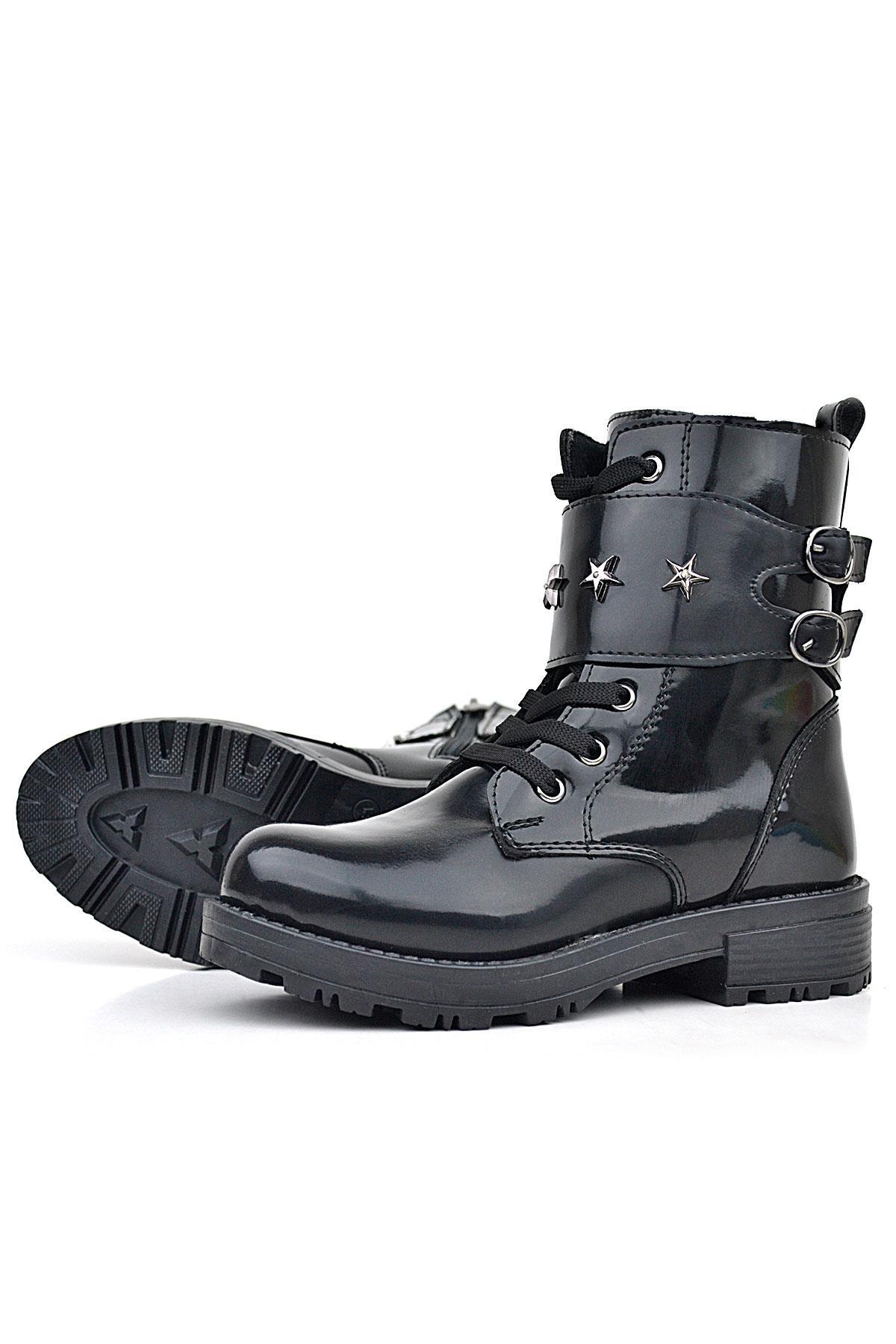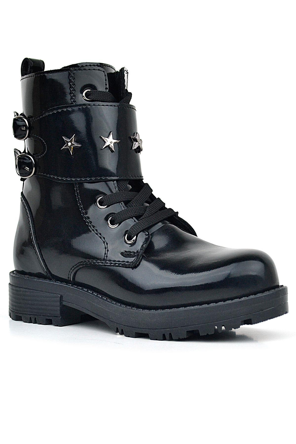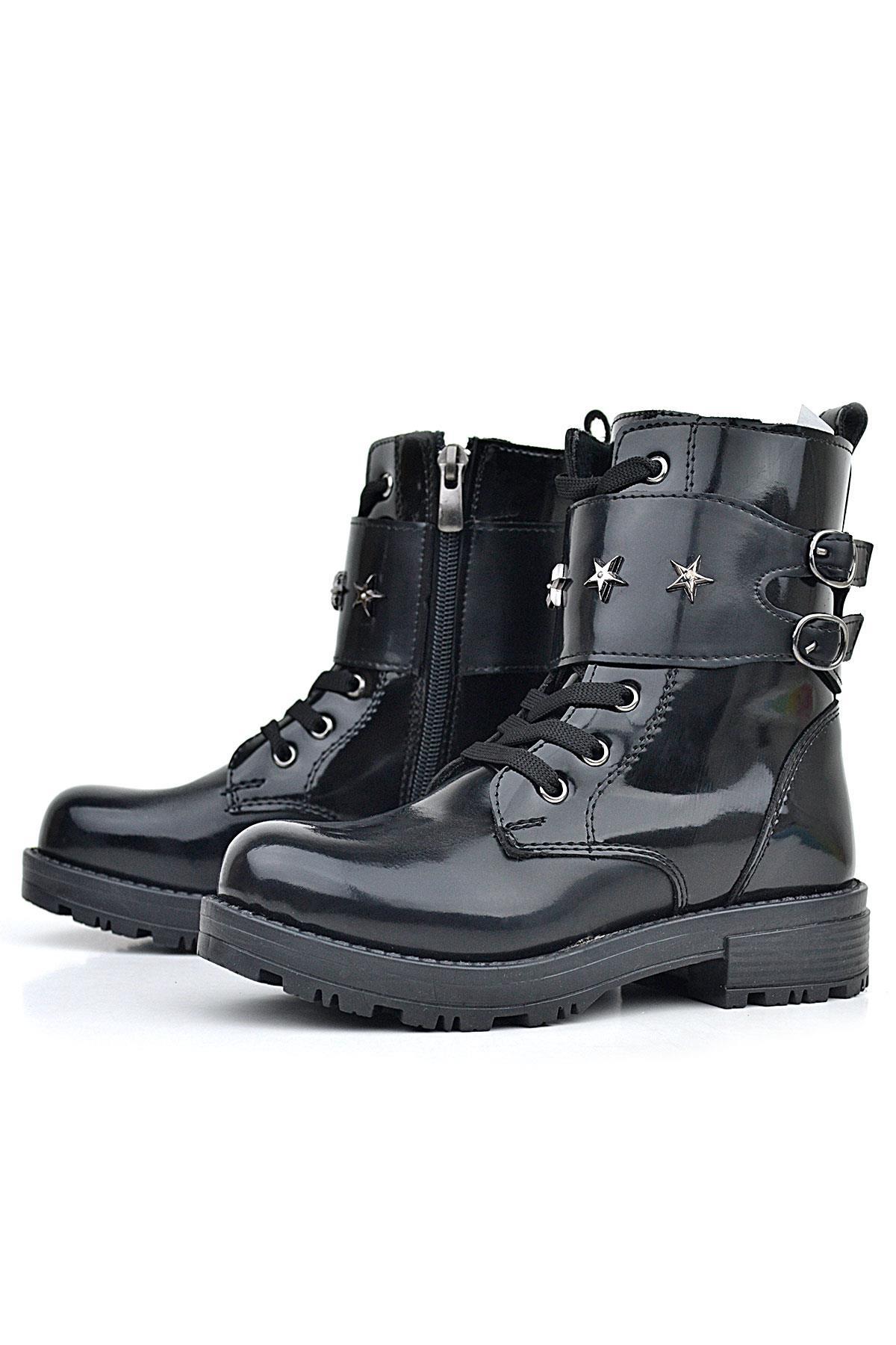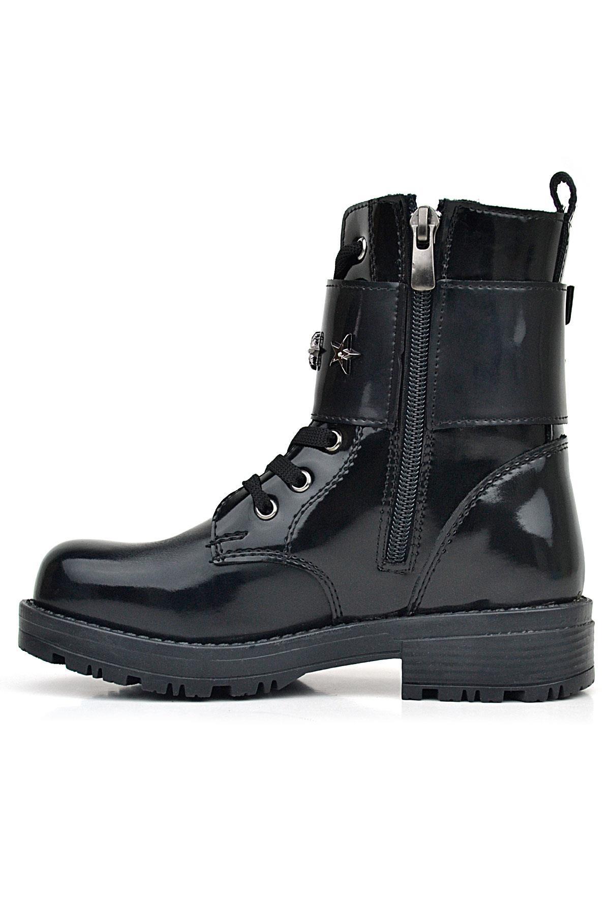 حذاء بناتي من الجلد اللامع باللون الأسود من راكر بلاس مزود برباط وسحّاب ومزين بتفاصيل نجوم