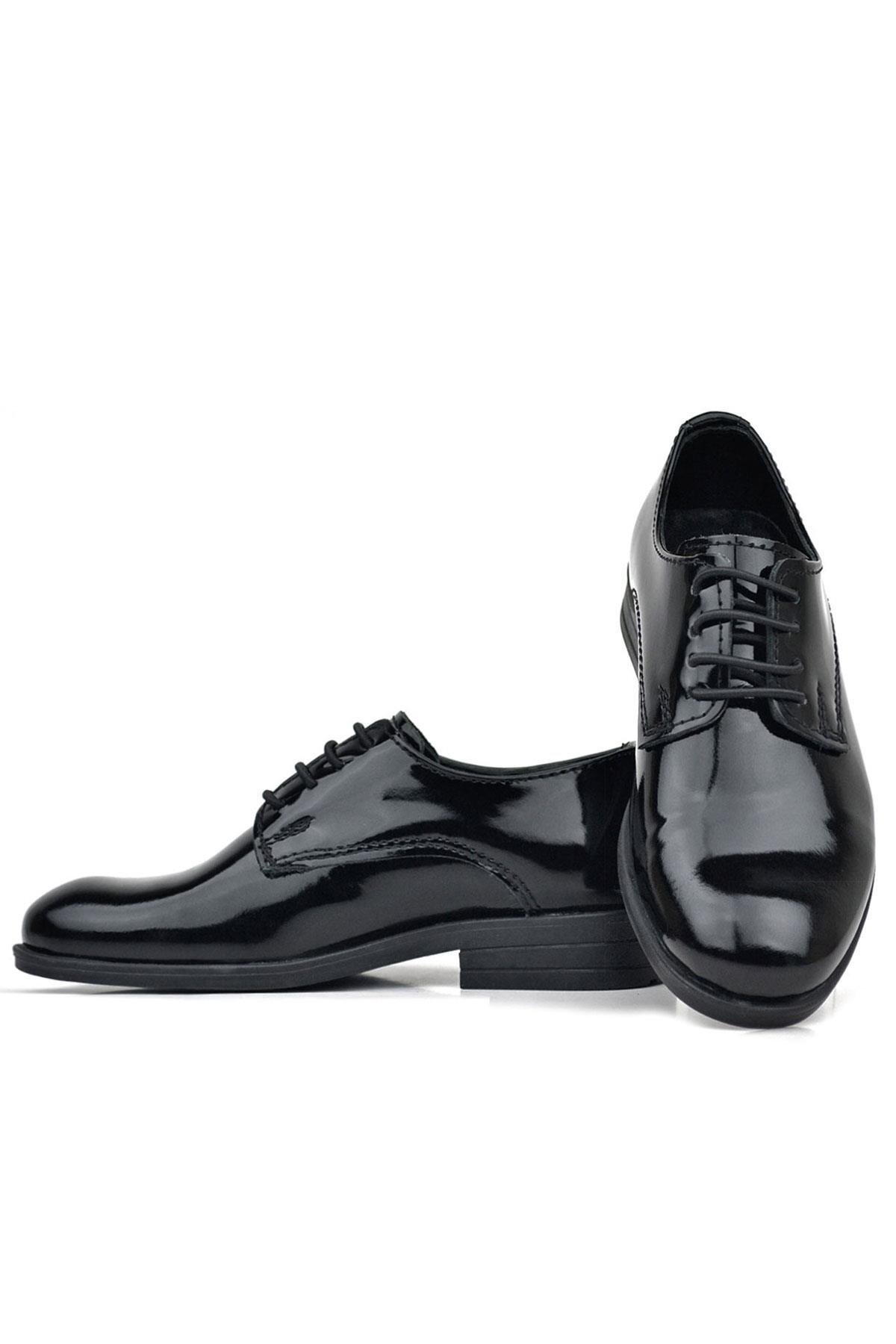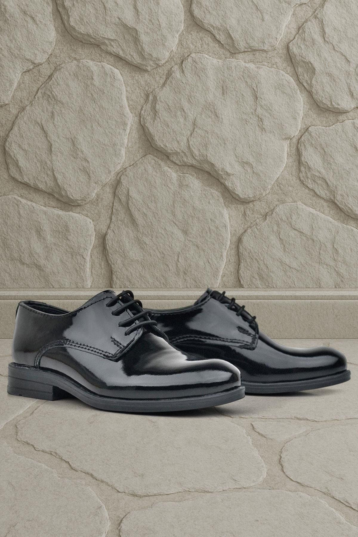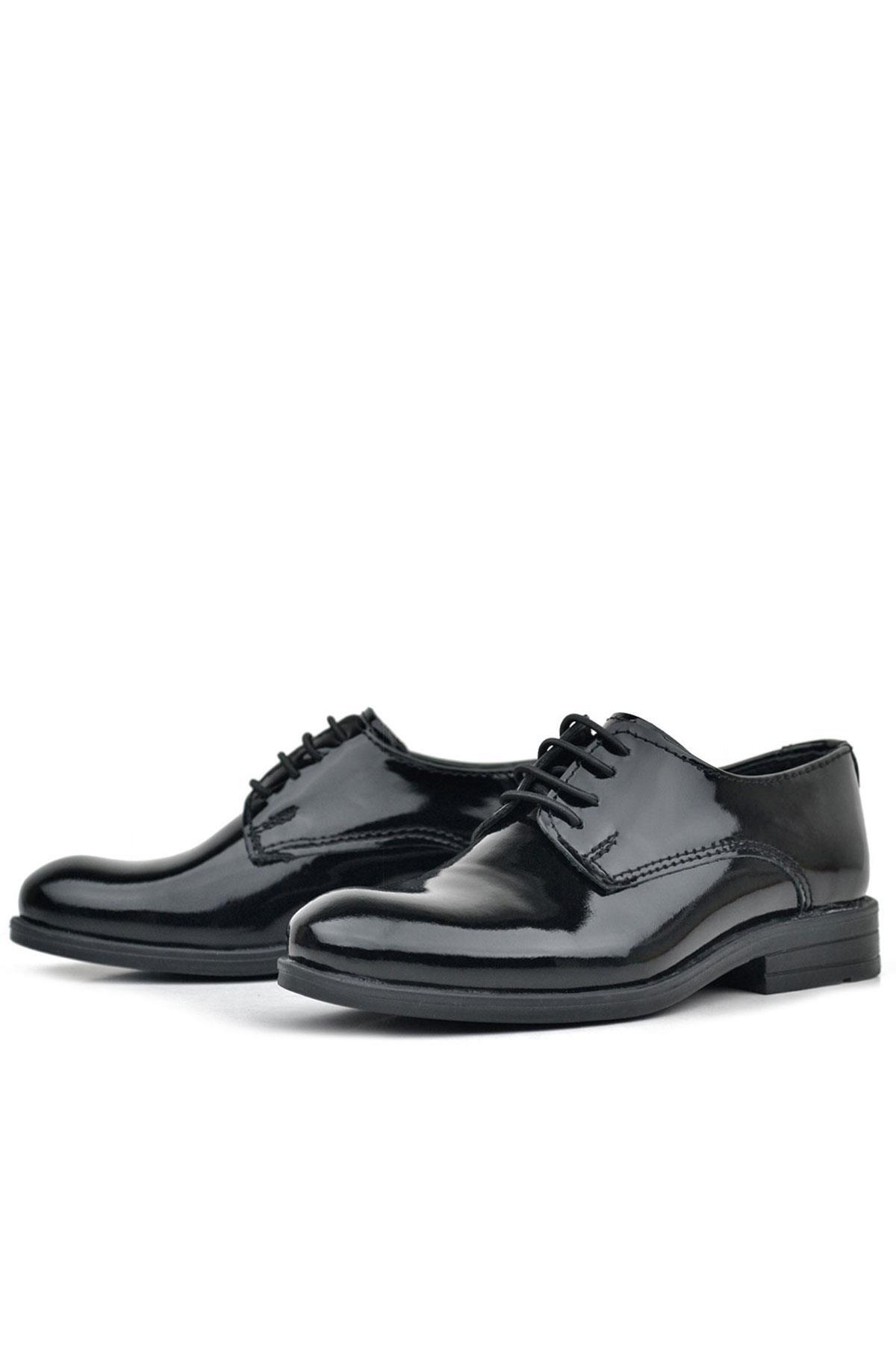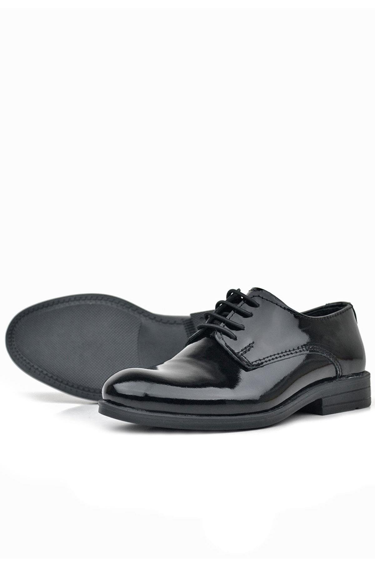 حذاء أكسفورد للأطفال من راكر بلاس، مصنوع من الجلد الأسود اللامع، برباط، مناسب للمدارس
