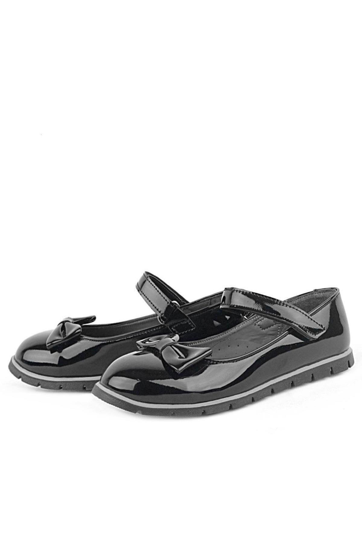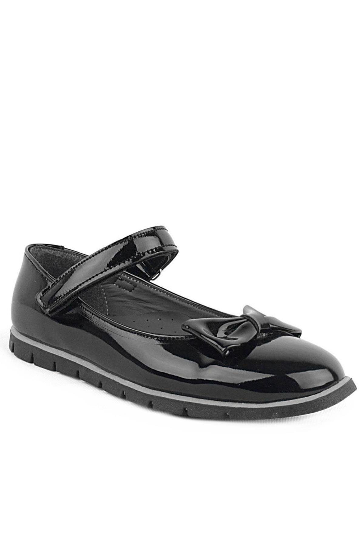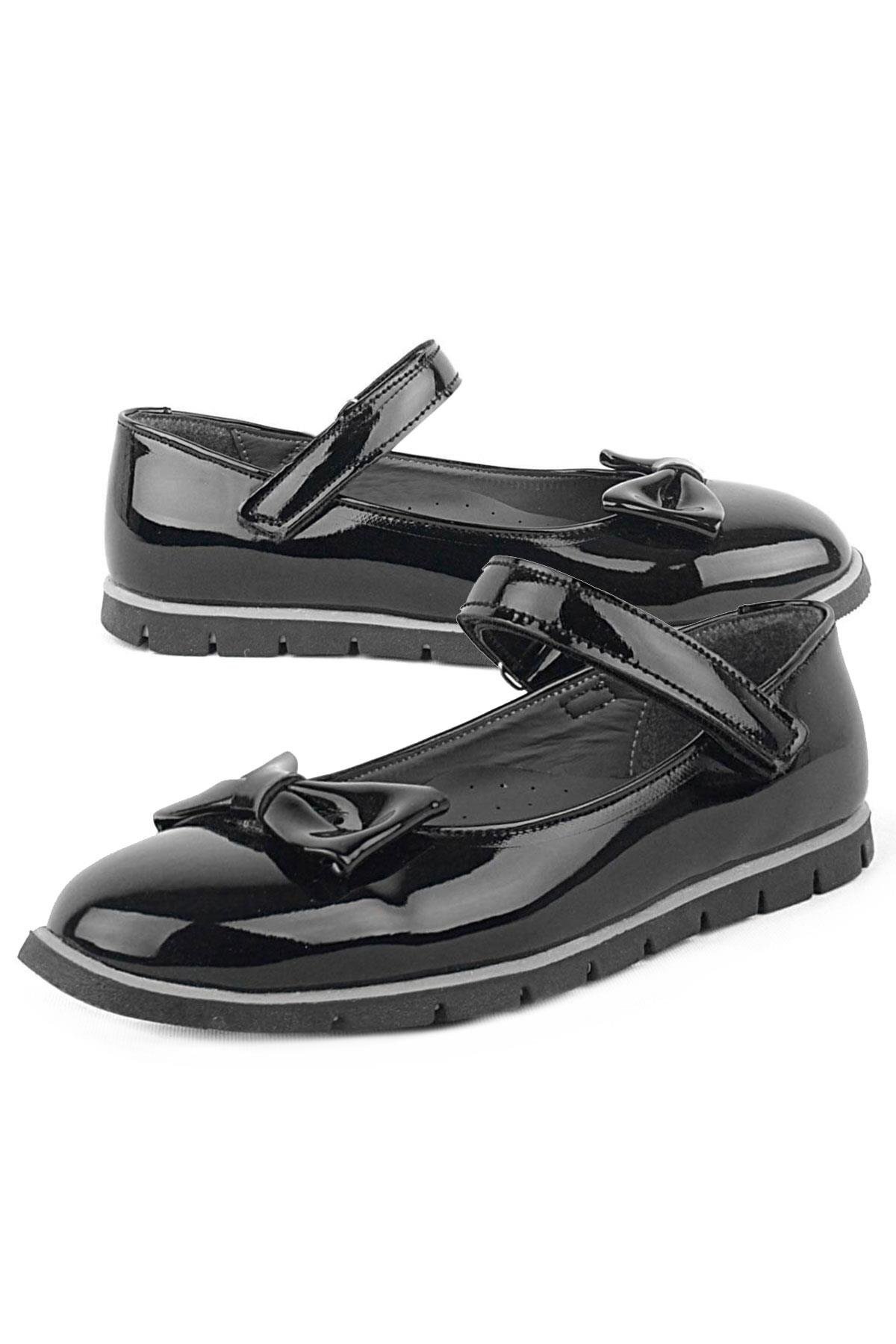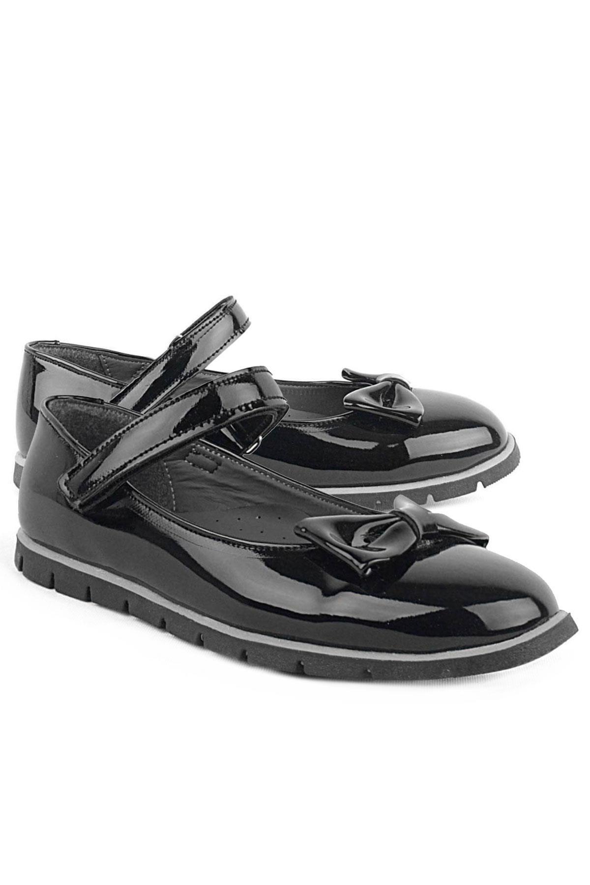حذاء باليرينا للبنات من راكر بلاس، مصنوع من الجلد اللامع باللون الأسود، مزود بشريط فيلكرو