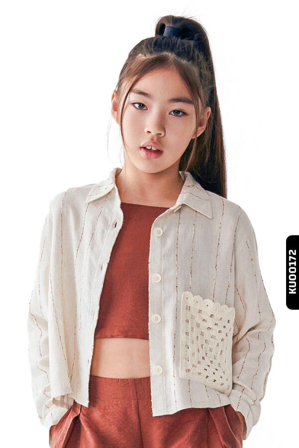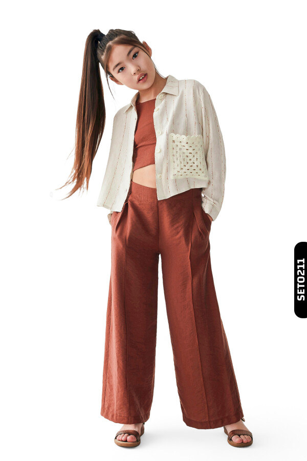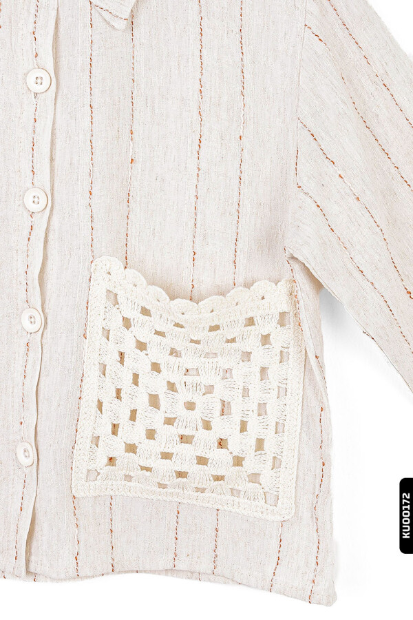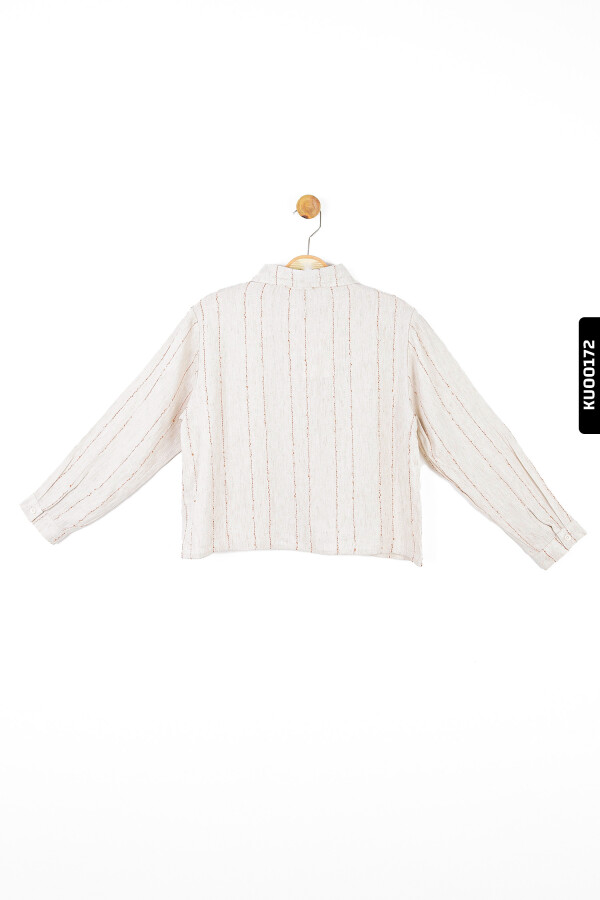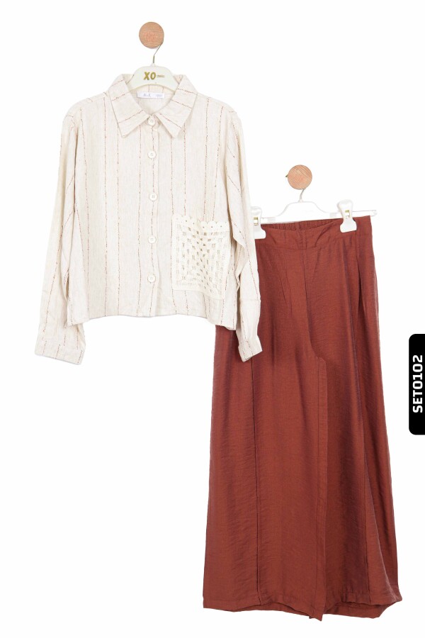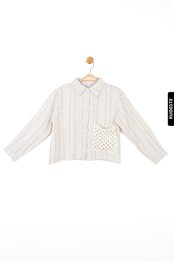 Sivri Yakalı Çizgili Aplikeli Yan Cepli Düğmeli Kız Çocuk Gömlek 8-14 Yaş 36338 Krem-Kahve/Cream-Brown *