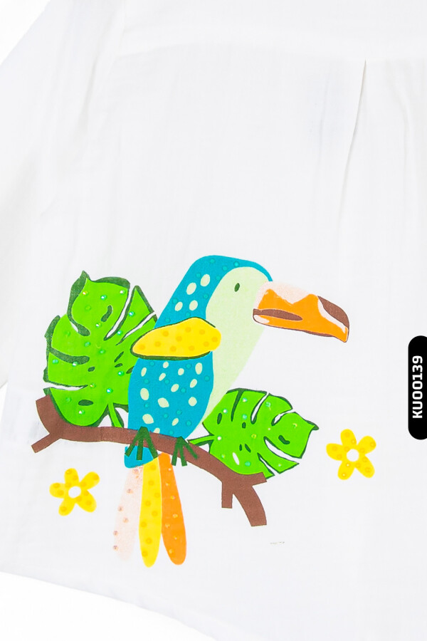 Gelince Haber VerYaz ayları için ideal olan bu kız çocuk gömleği, uzun kollu ve düğmeli tasarımıyla hem şık hem rahat bir kullanım sunar. Beyaz renkteki gömlek, ön kısmında klasik yaka ve kapamalı düğmelerle sade bir görünüm sağlarken, arka kısmında renkli ve eğlenceli bir kuş baskısı bulunmaktadır. Canlı renklerle tasarlanan kuş figürü, gömleğe neşeli bir hava katarken, yaz sezonuna uygun hafif ve nefes alabilir kumaşı sayesinde çocukların konforunu ön planda tutar.